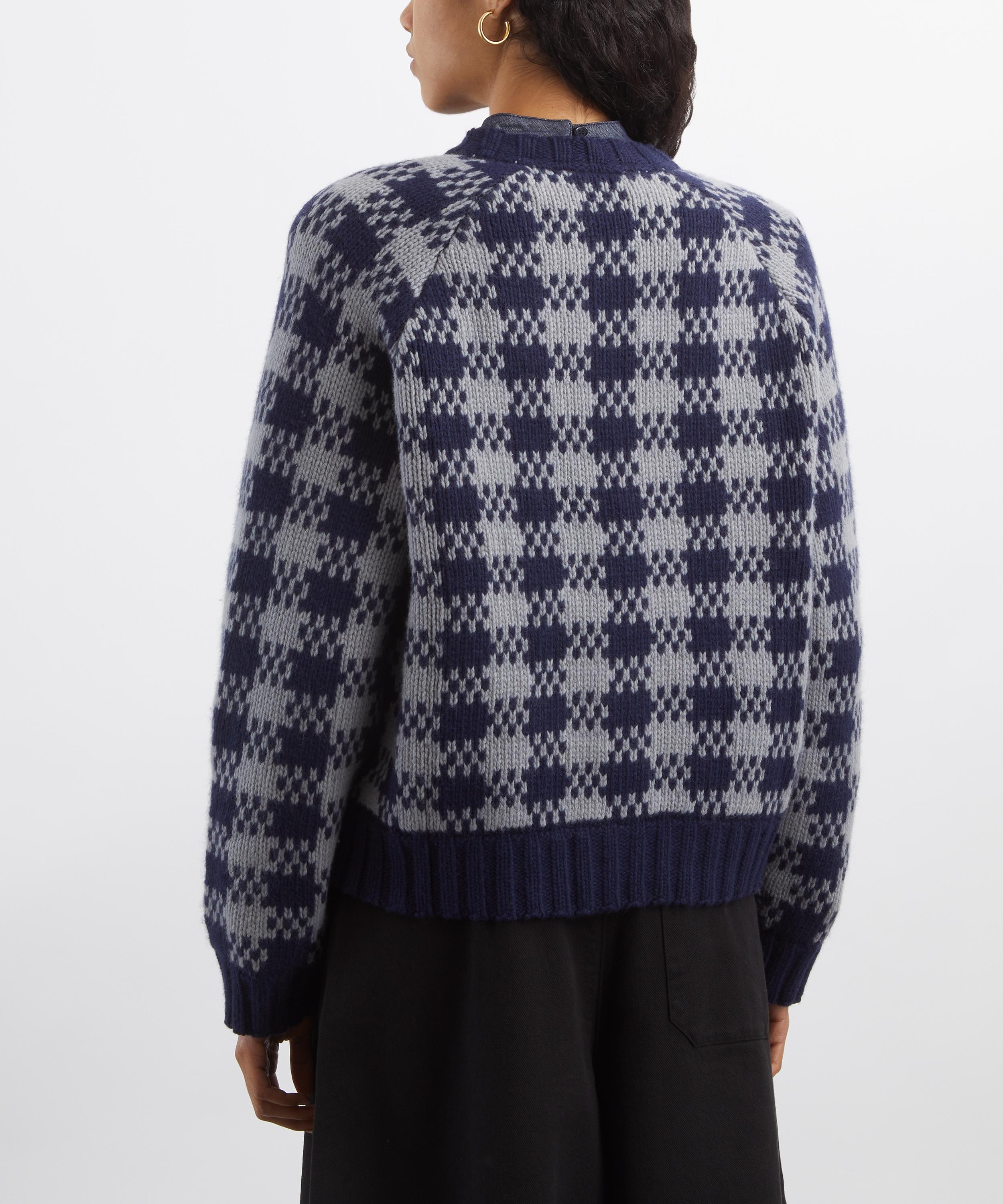 Crafted from a soft lambswool-blend yarn, the Atomic cardigan features a bold checkered intarsia design, round neckline, raglan sleeves, and corozo button fastening. Finished with rib-knit trims, it delivers a relaxed, cosy feel with subtle texture and warmth.