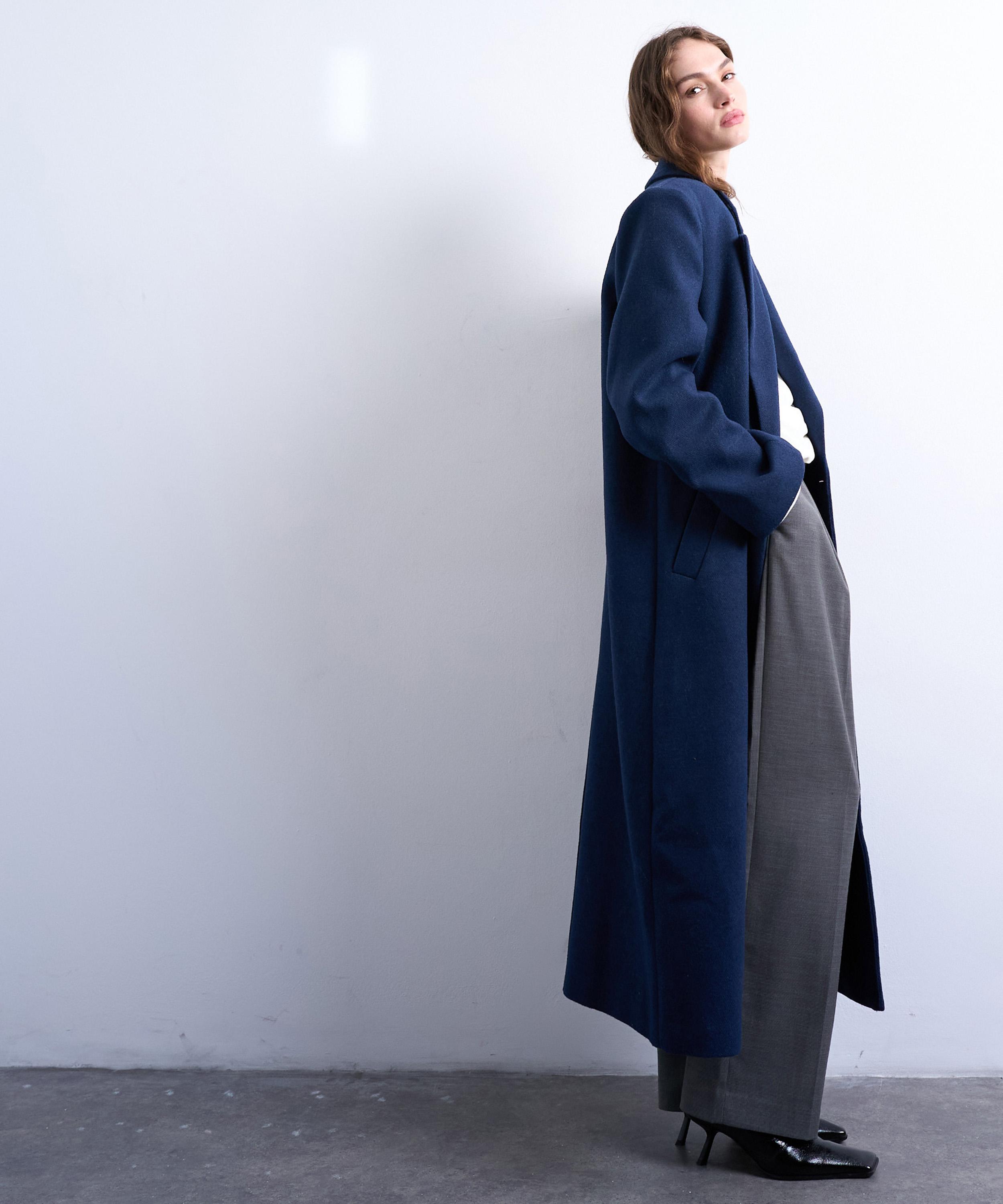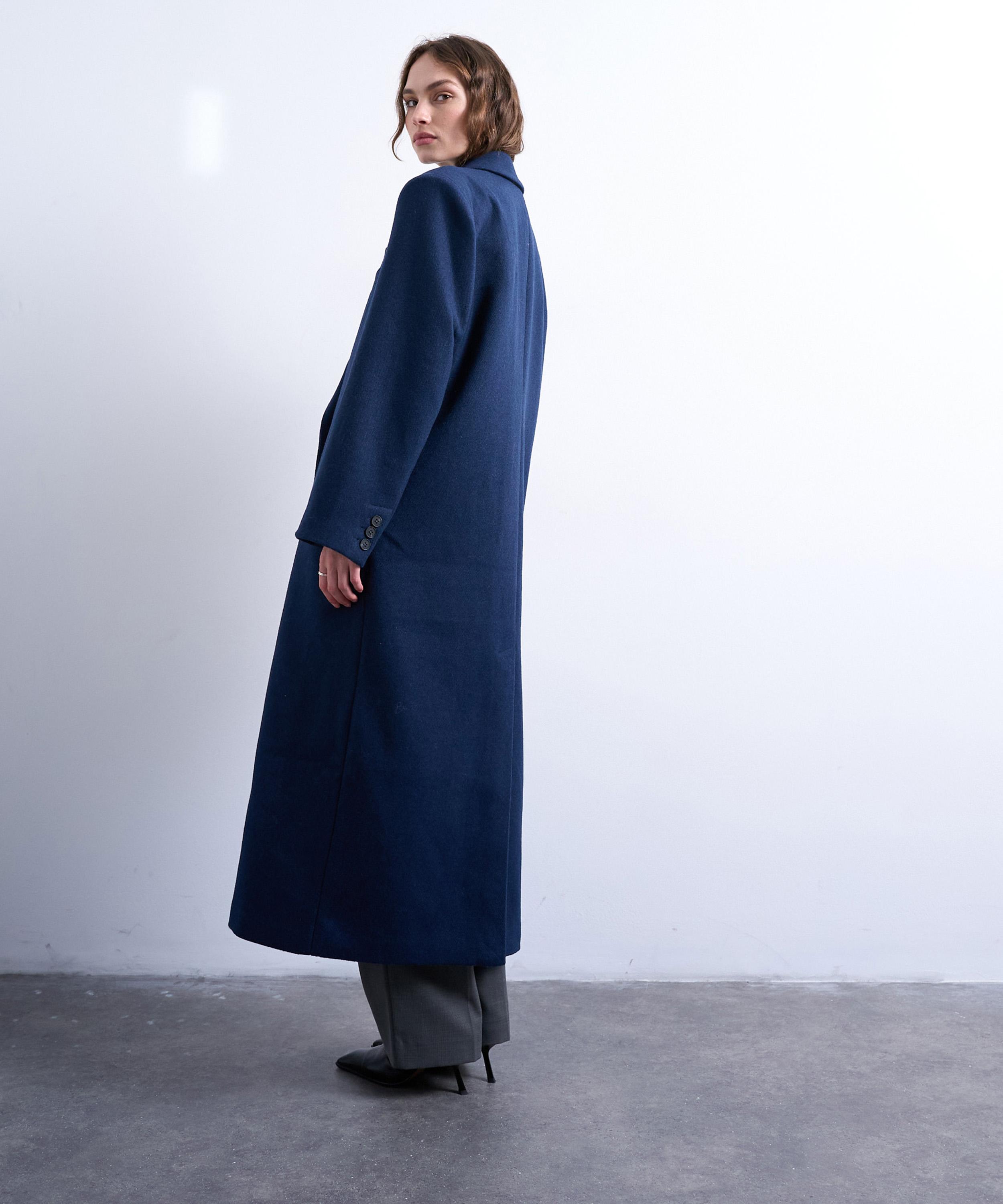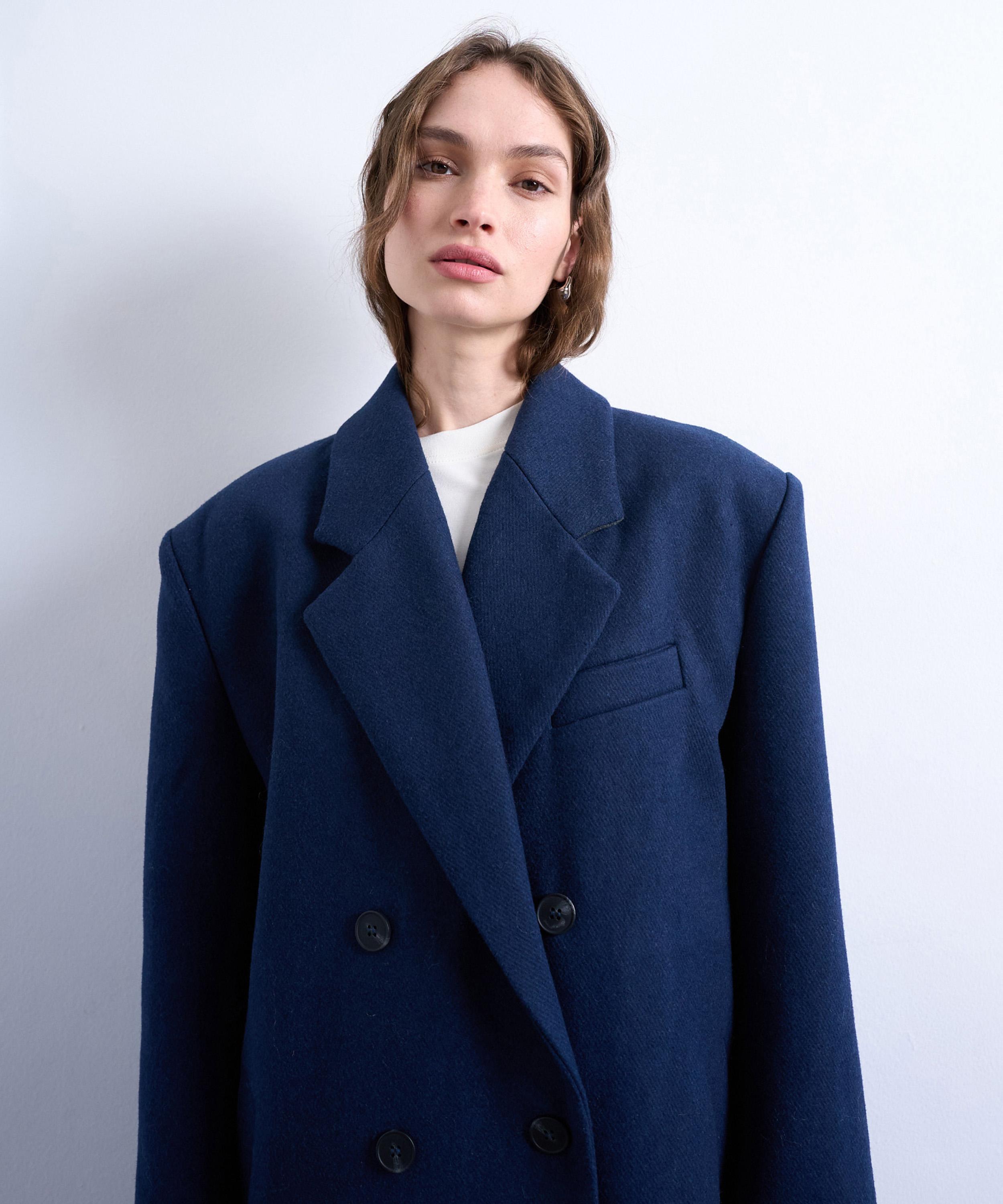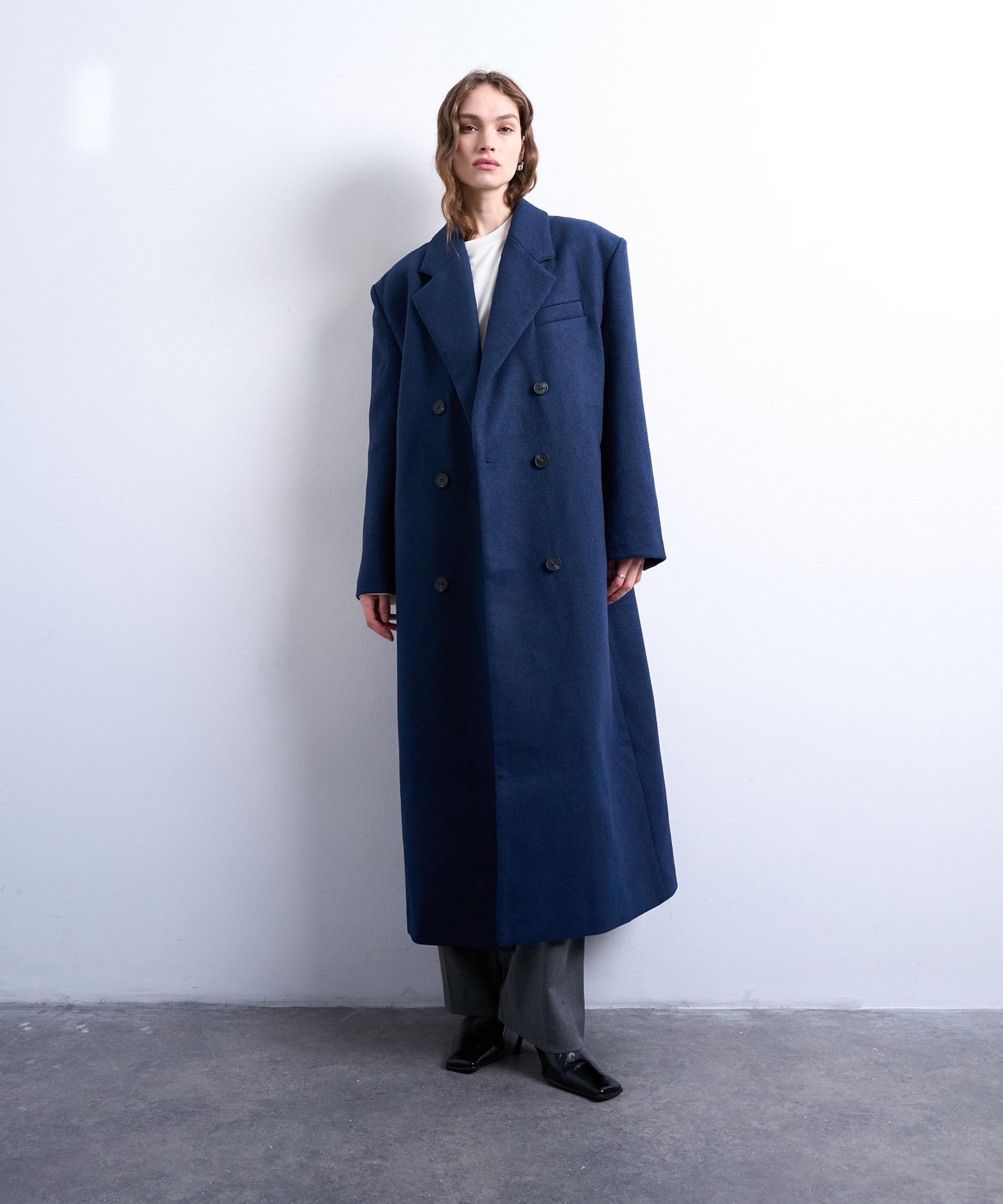 Crafted from a soft, felted wool-blend fabric in classic navy, this double-breasted overcoat channels timeless menswear tailoring with notch lapels, functional pockets, and an oversized silhouette for a refined yet relaxed look.