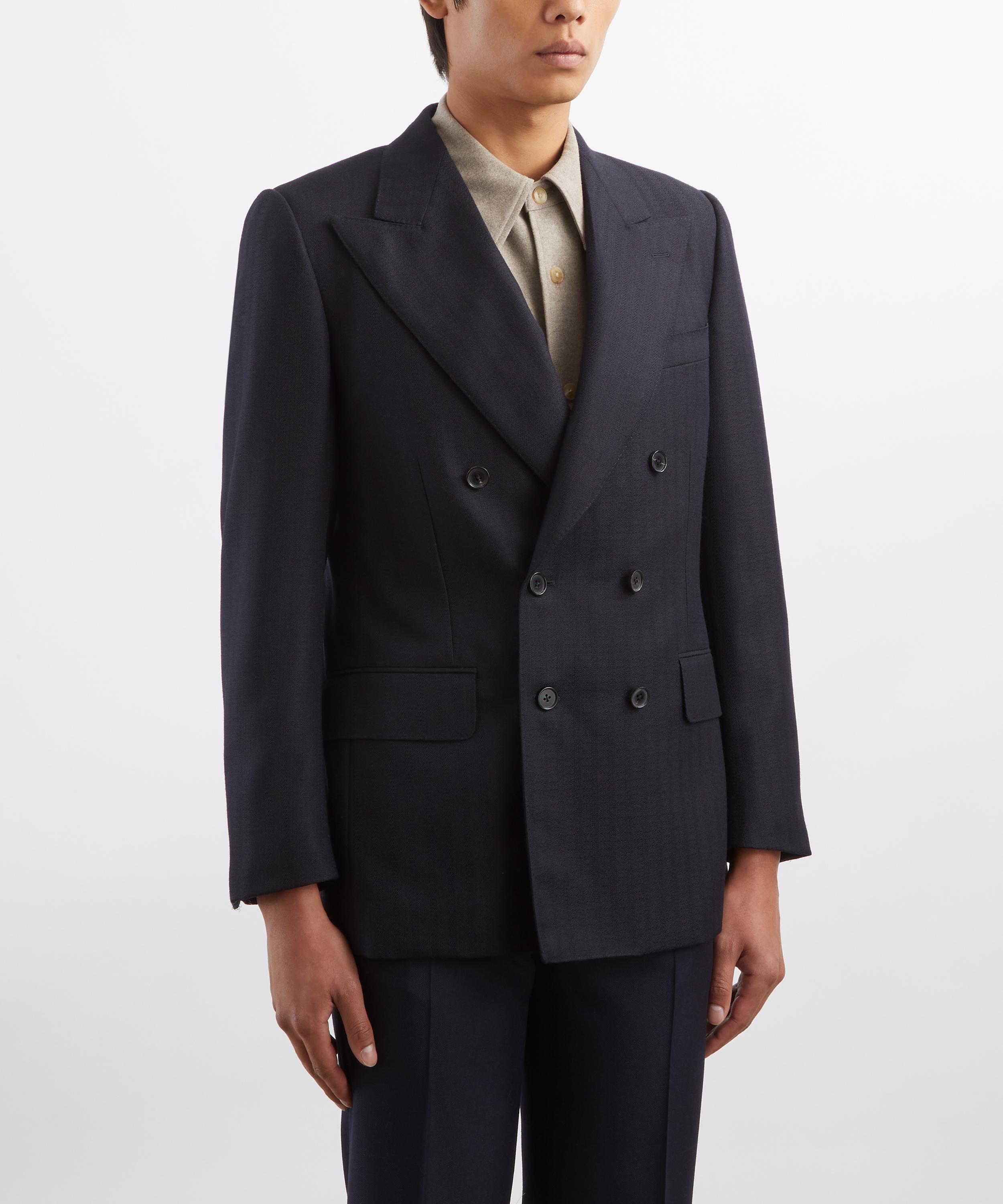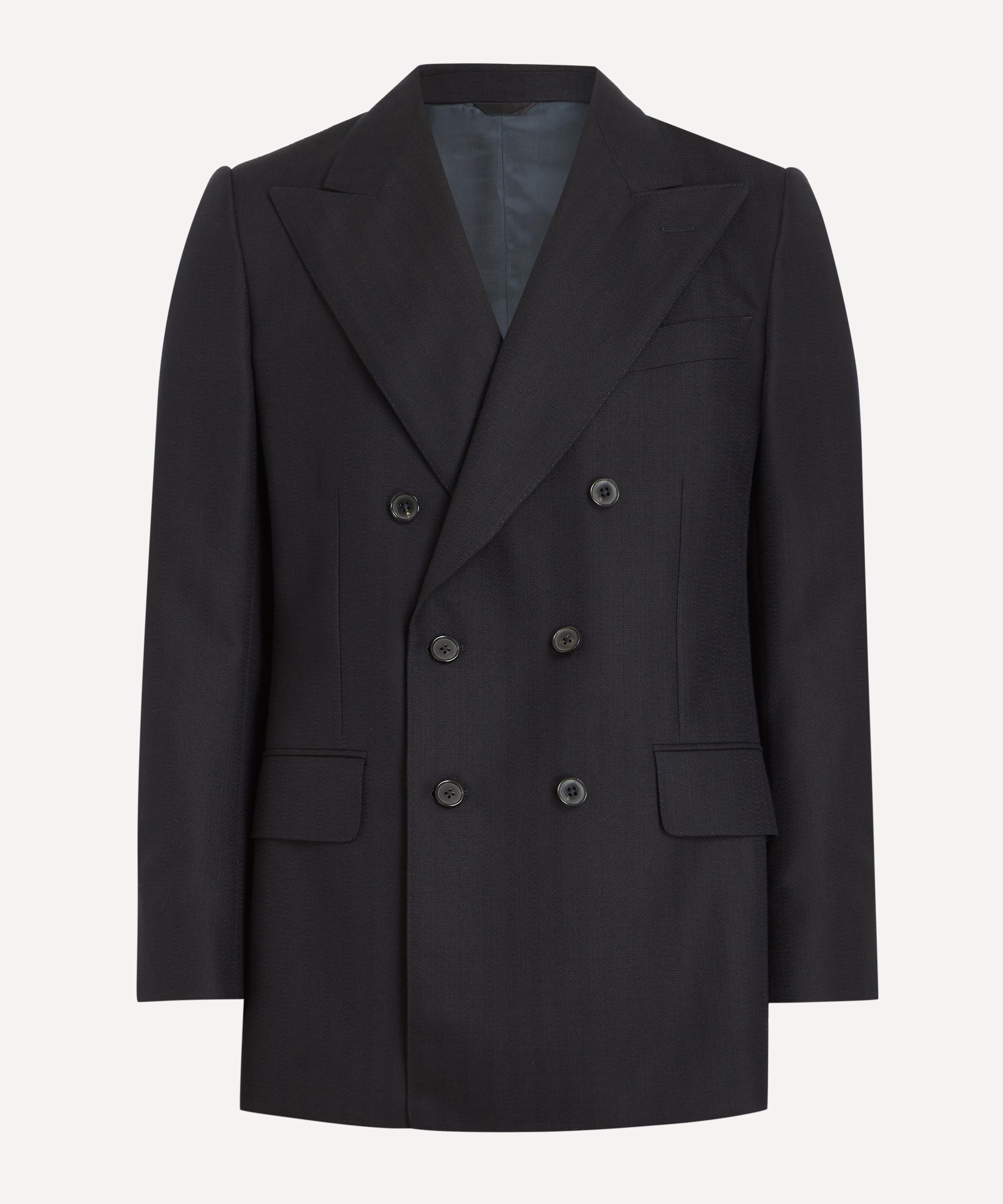 Cut from English worsted wool flannel in navy, this double-breasted jacket is tailored with precision. Classic details - including a peak lapel, horn buttons, flap pockets, and a chest pocket - lend a timeless finish.