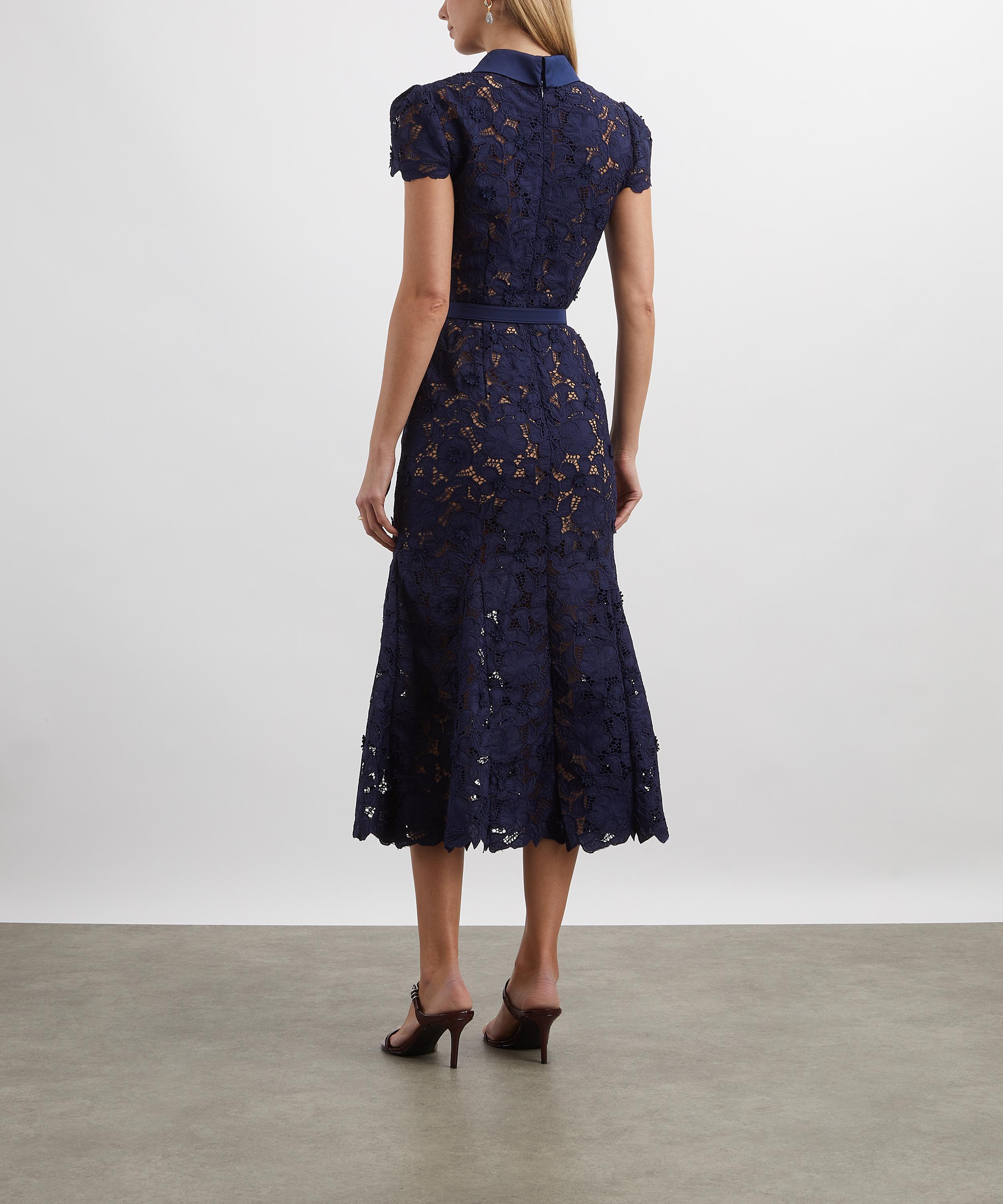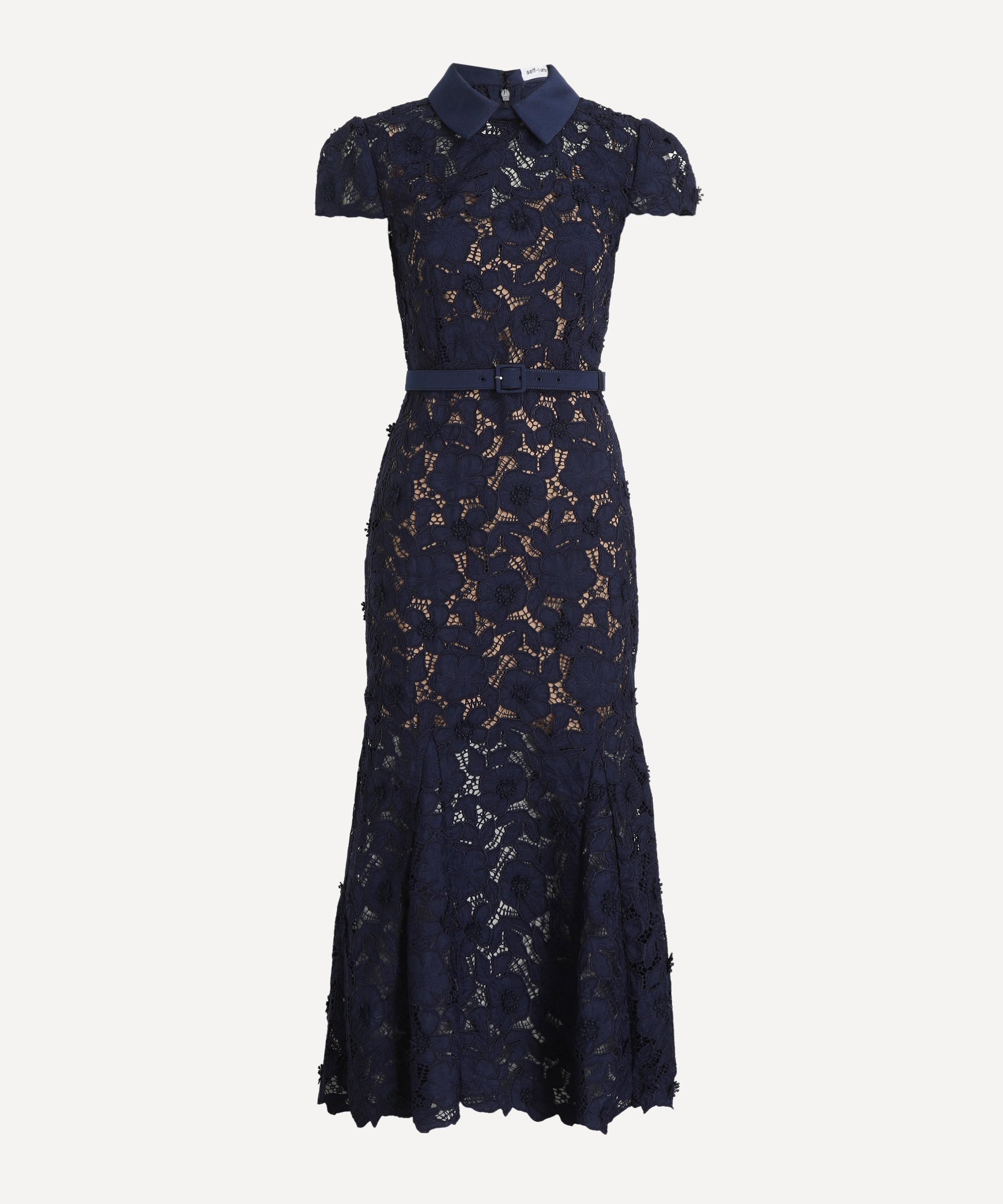 Classically feminine, the Navy Guipure Lace Midi Dress from Self-Portrait defines effortless elegance.