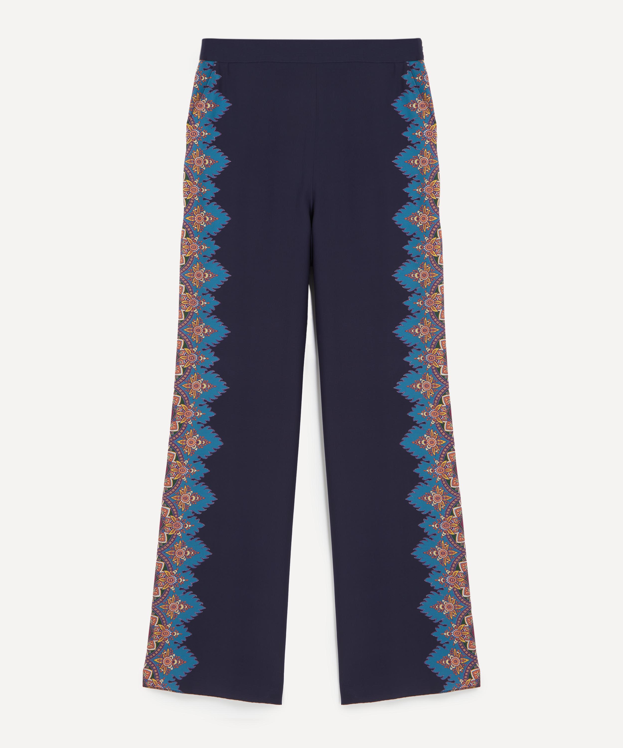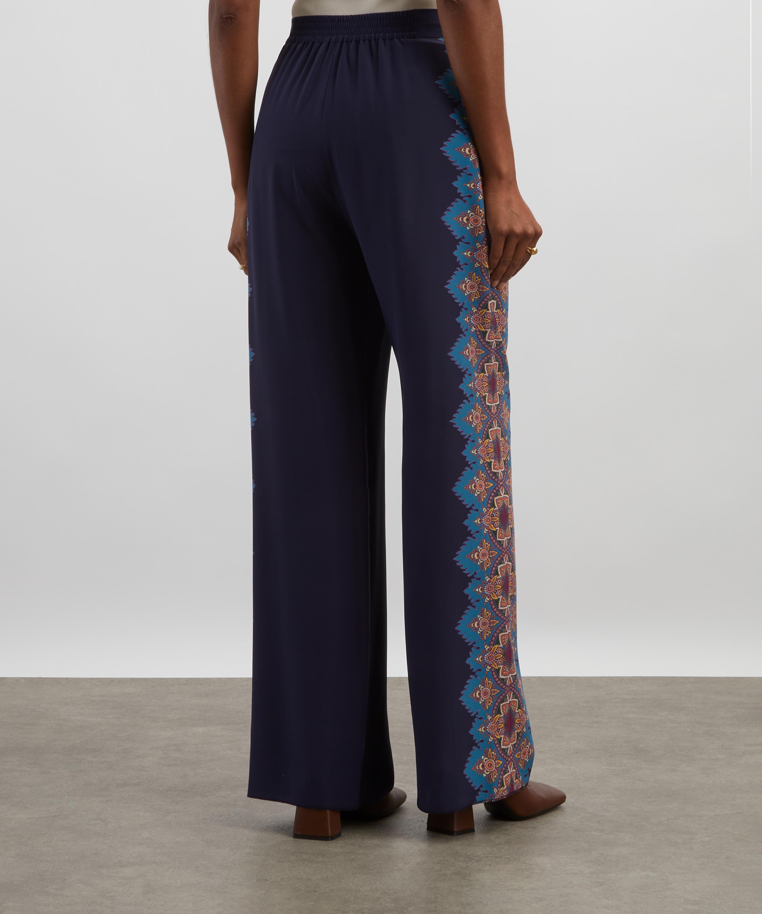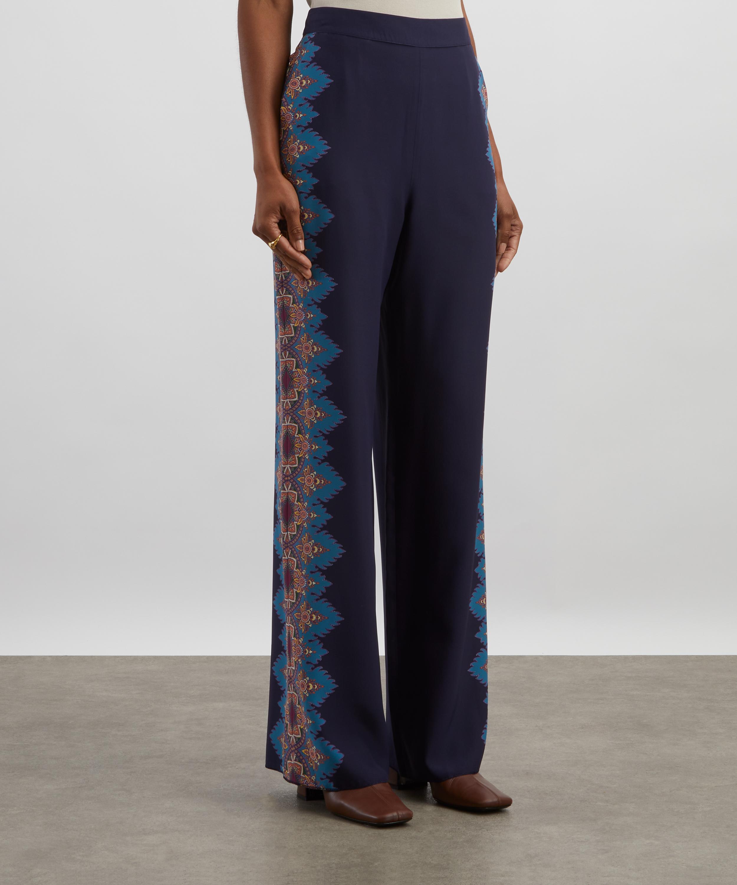 Expertly crafted in Italy from silk crepe de chine, these trousers are fitted with an elasticated waistband, and feature a placed paisley print along the sides, and a tailored straight silhouette that beautifully elongates the figure.