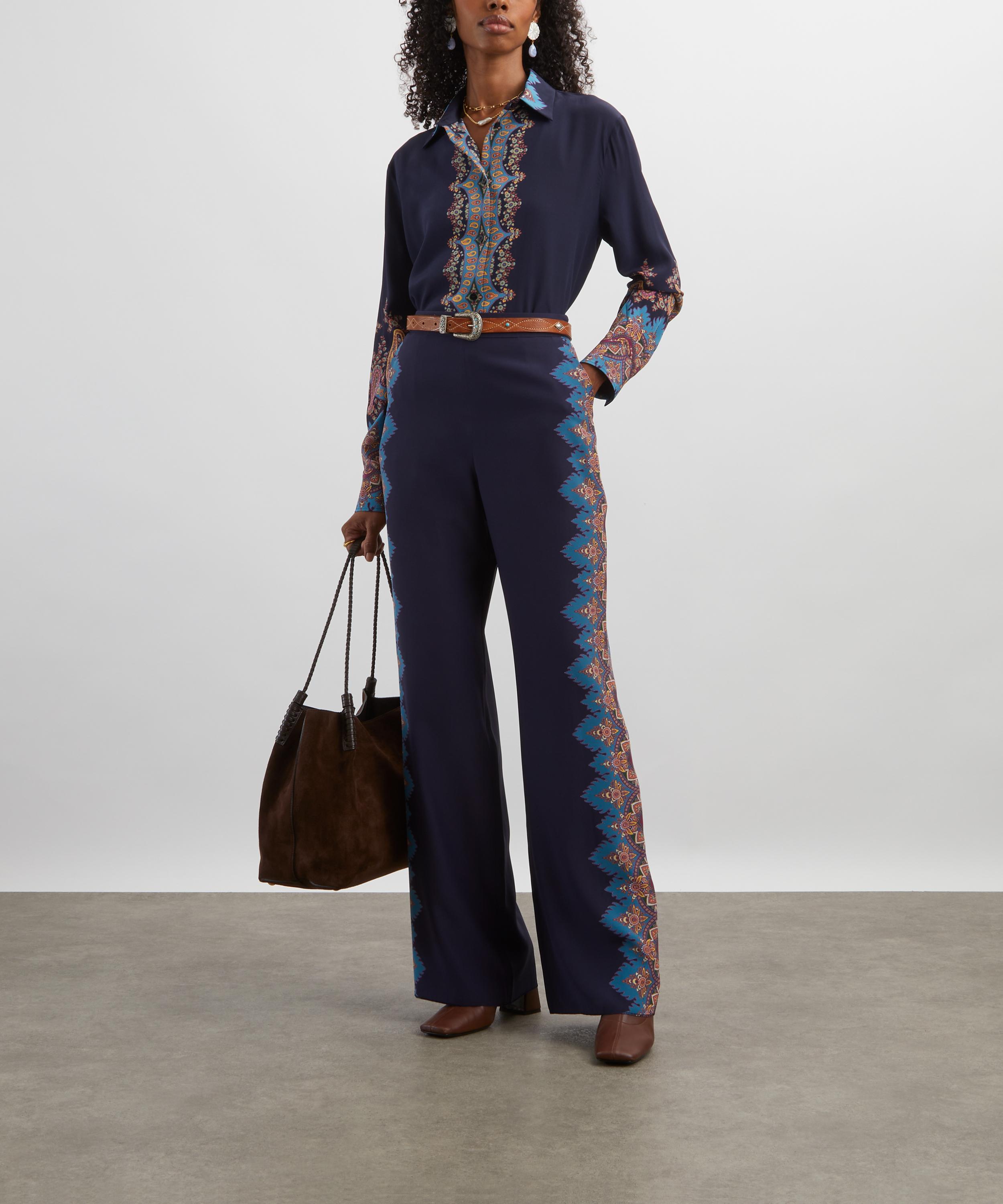 A showcase of Etro’s Italian craftsmanship, the Navy Paisley Silk Trousers capture the brand’s flair for luxurious fabrics and vibrant, Bohemian prints.