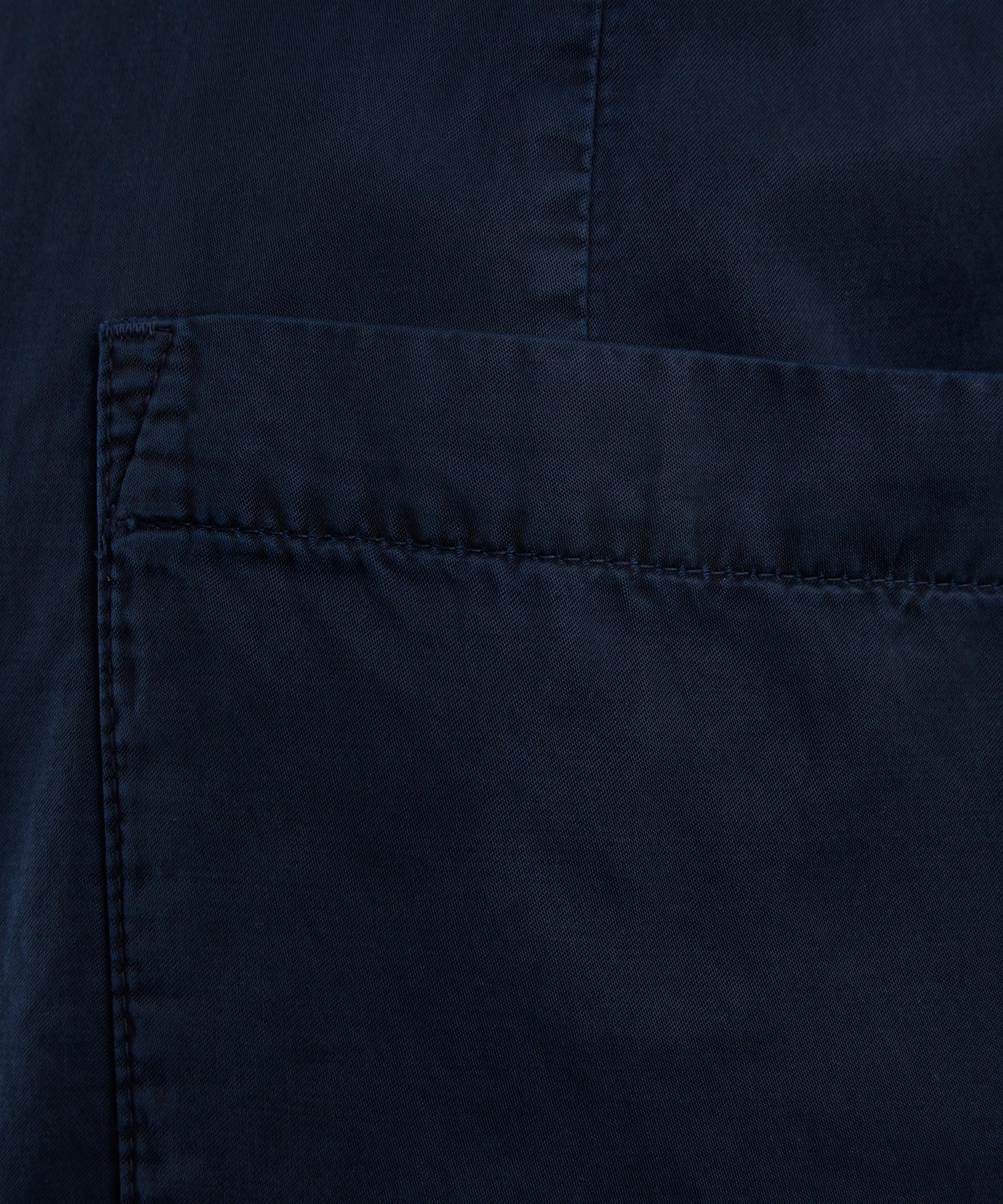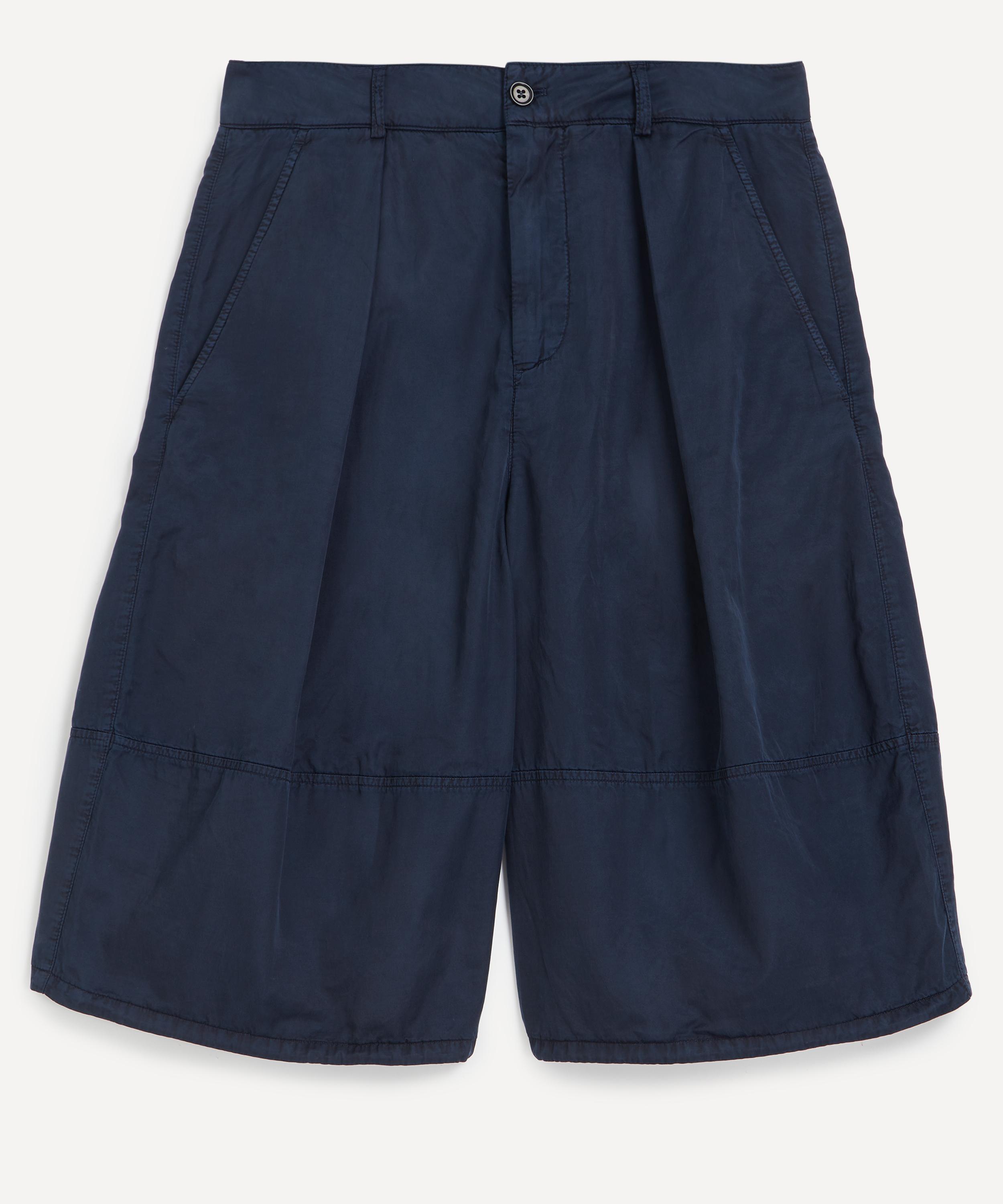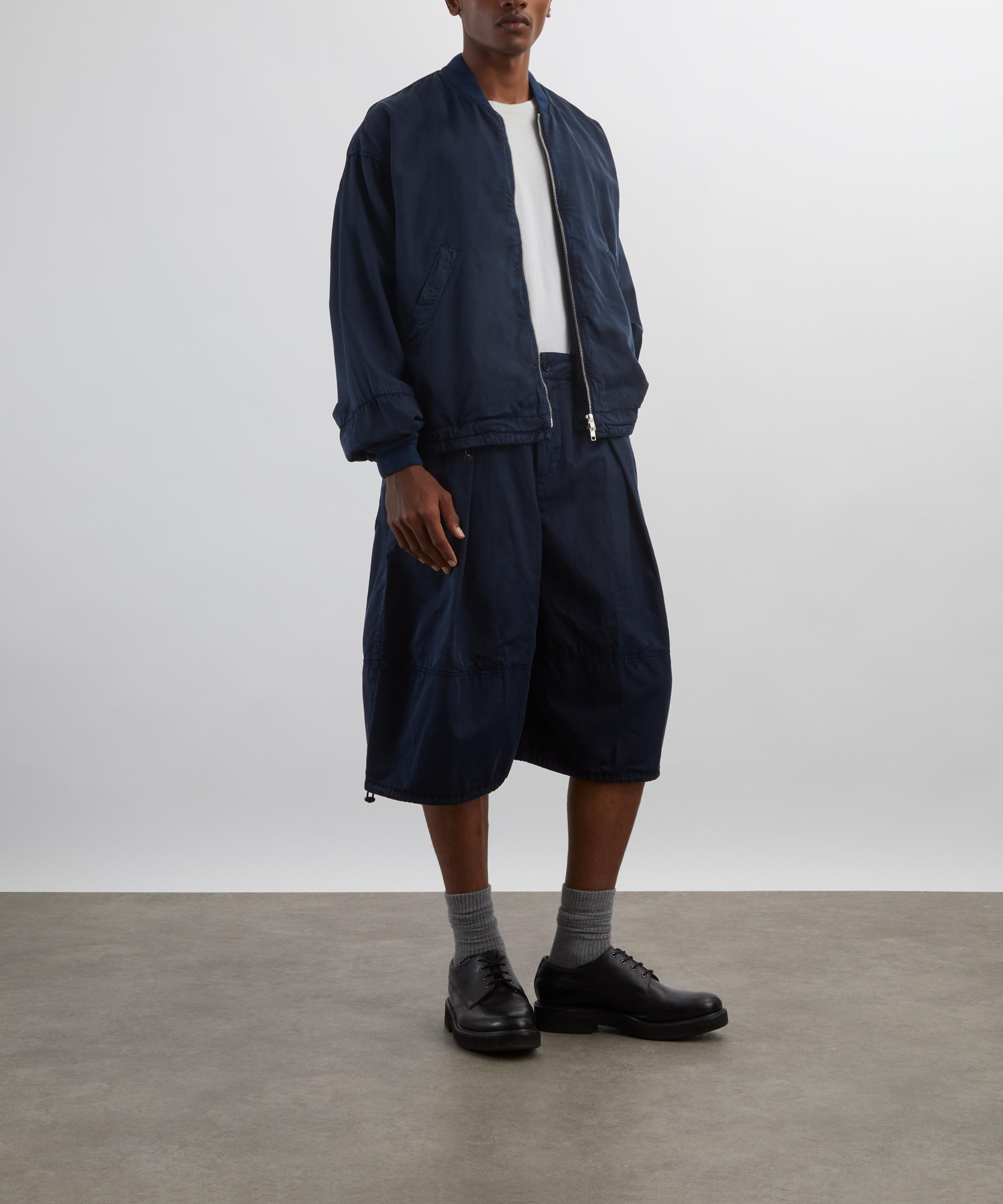 Crafted from garment-dyed bonded cotton cupro, these navy knee-length shorts blend classic utility with modern ease. Featuring a relaxed, wide-cut silhouette with multiple pockets to the sides and back, it fastens at the hem with drawcords for a custom fit.