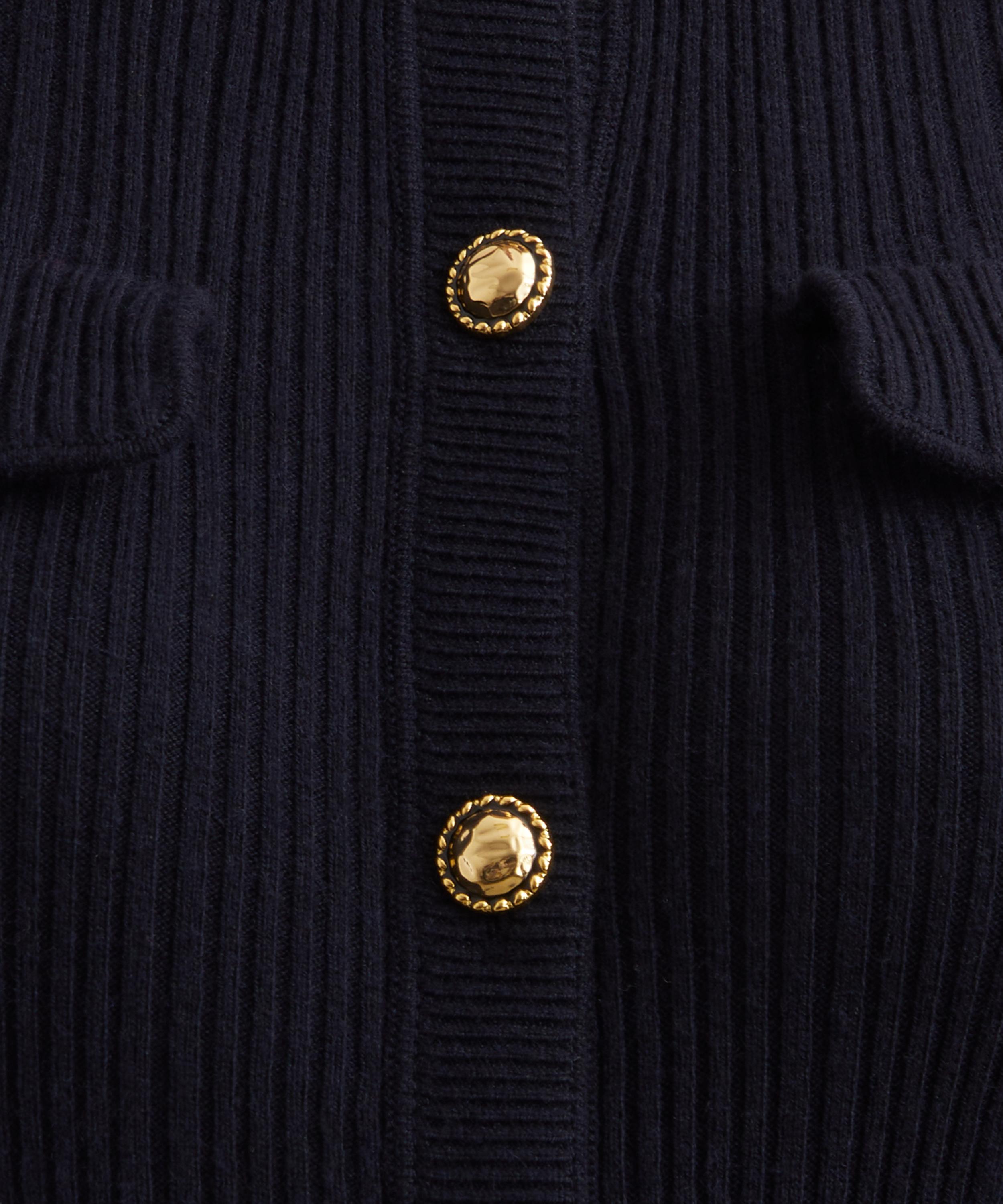 A vision of timeless elegance, this rib-knit midi dress features a sculpted fit with flared sleeves and a playful hem. A round neckline and fully-buttoned placket adorned with gold buttons add a polished, elevated finish.