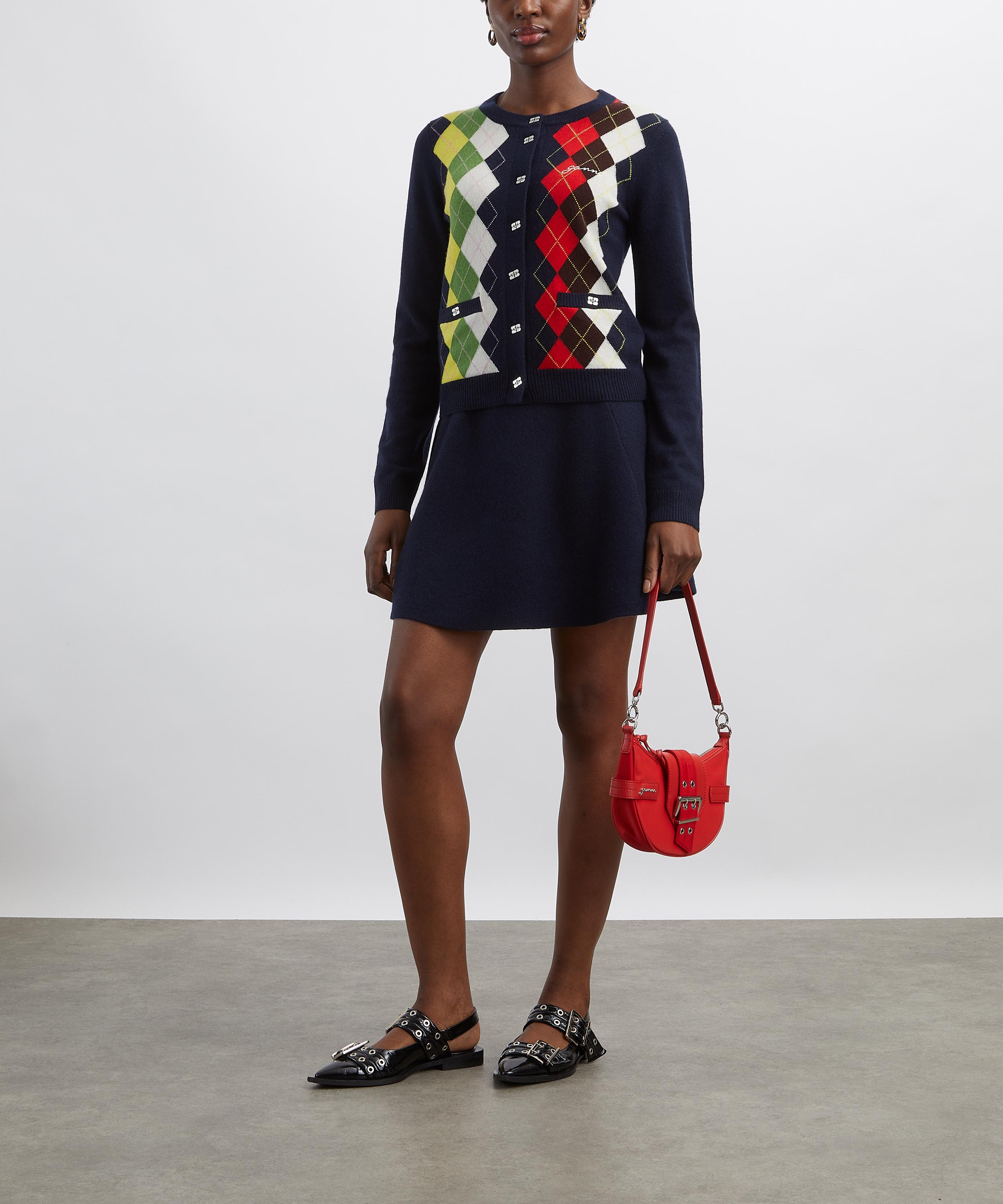 Spun from a soft wool-cashmere blend, this cardigan features a multicoloured argyle pattern for a playful twist on a classic. It’s finished with a round neckline, long sleeves, two front pockets, and GANNI butterfly logo buttons for a signature touch.