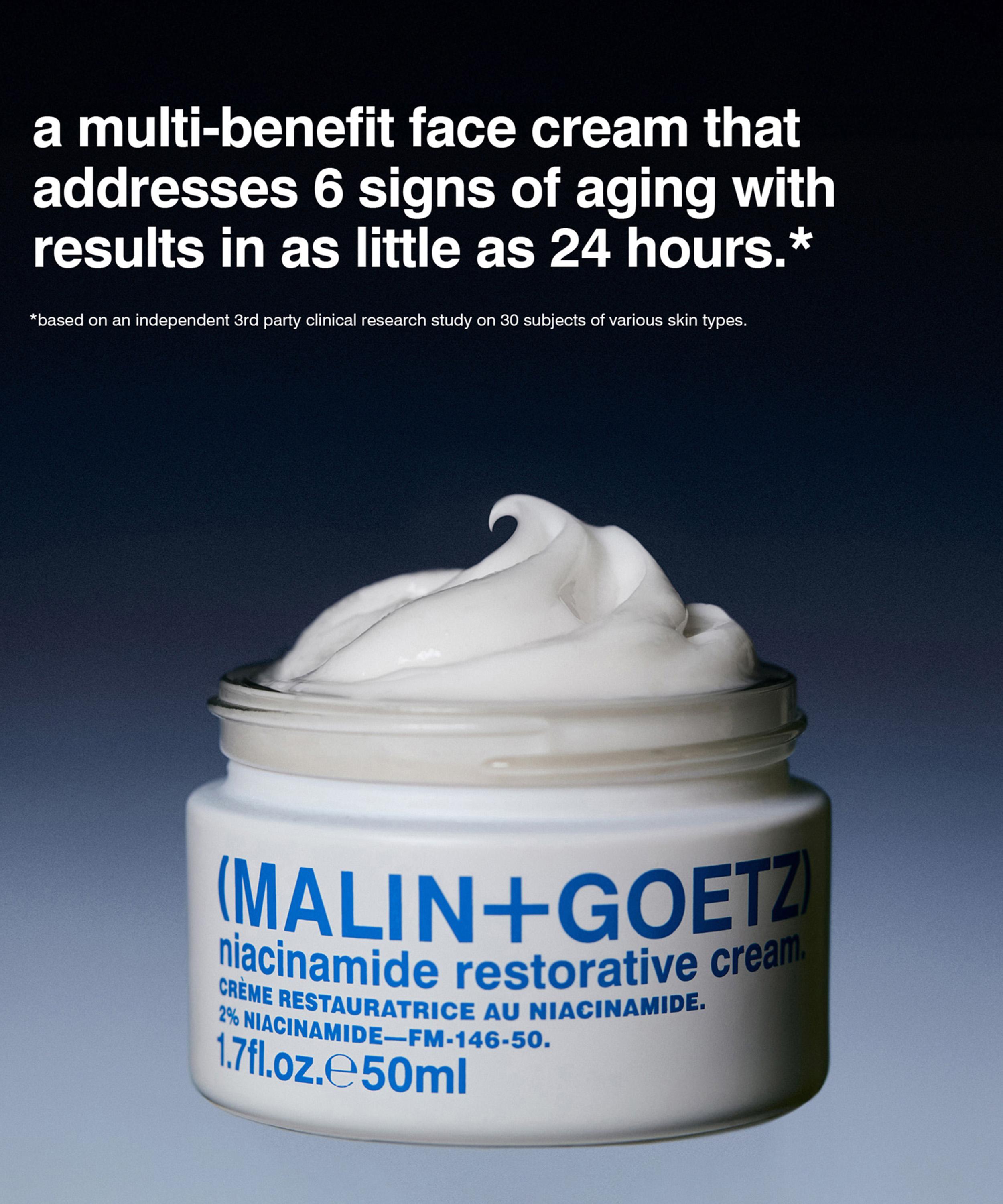 The lists of ingredients contained in the composition of the Niacinamide Restorative Cream by MALIN+GOETZ products are regularly updated. Please refer to the ingredients list on the packaging before using the product.