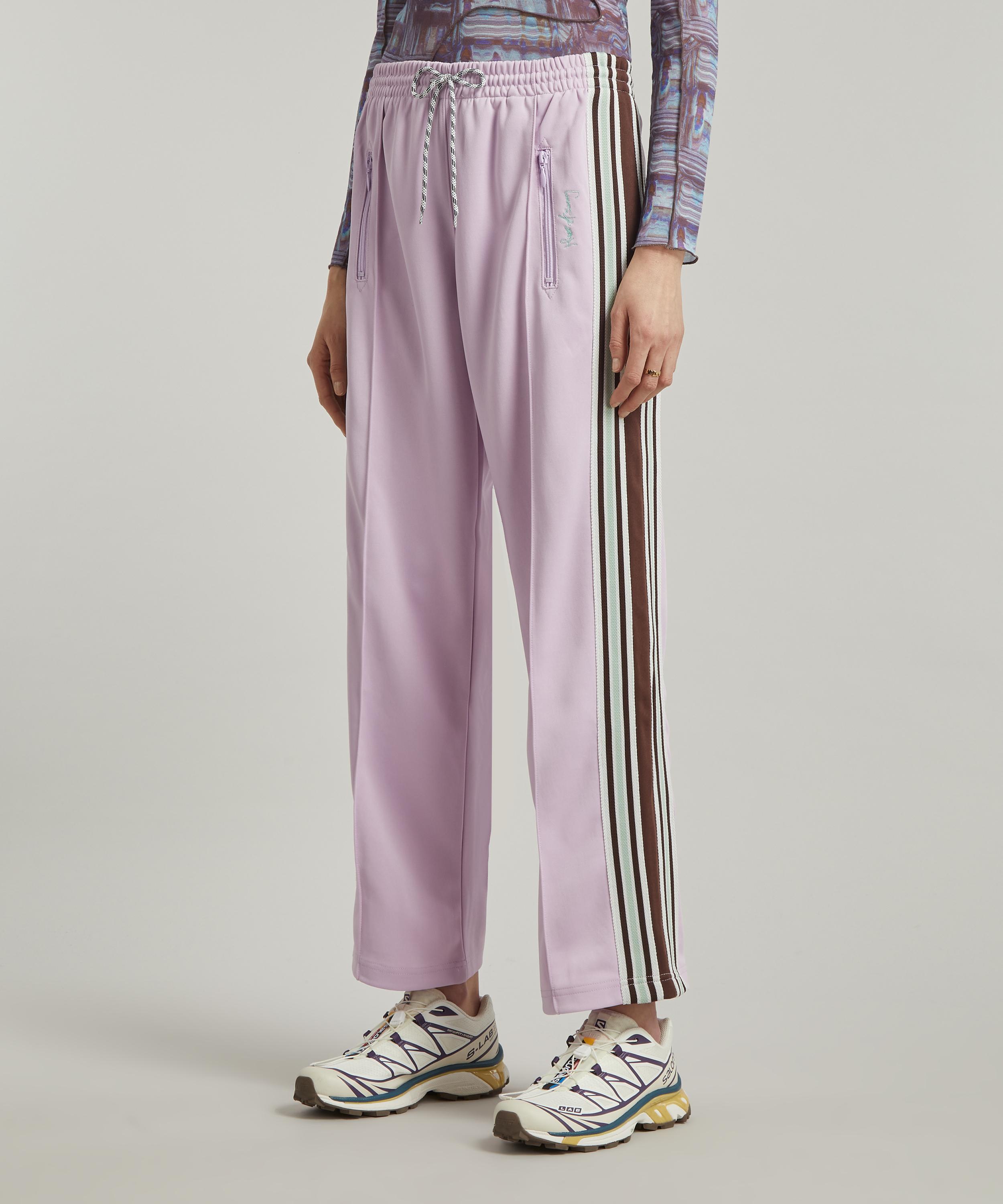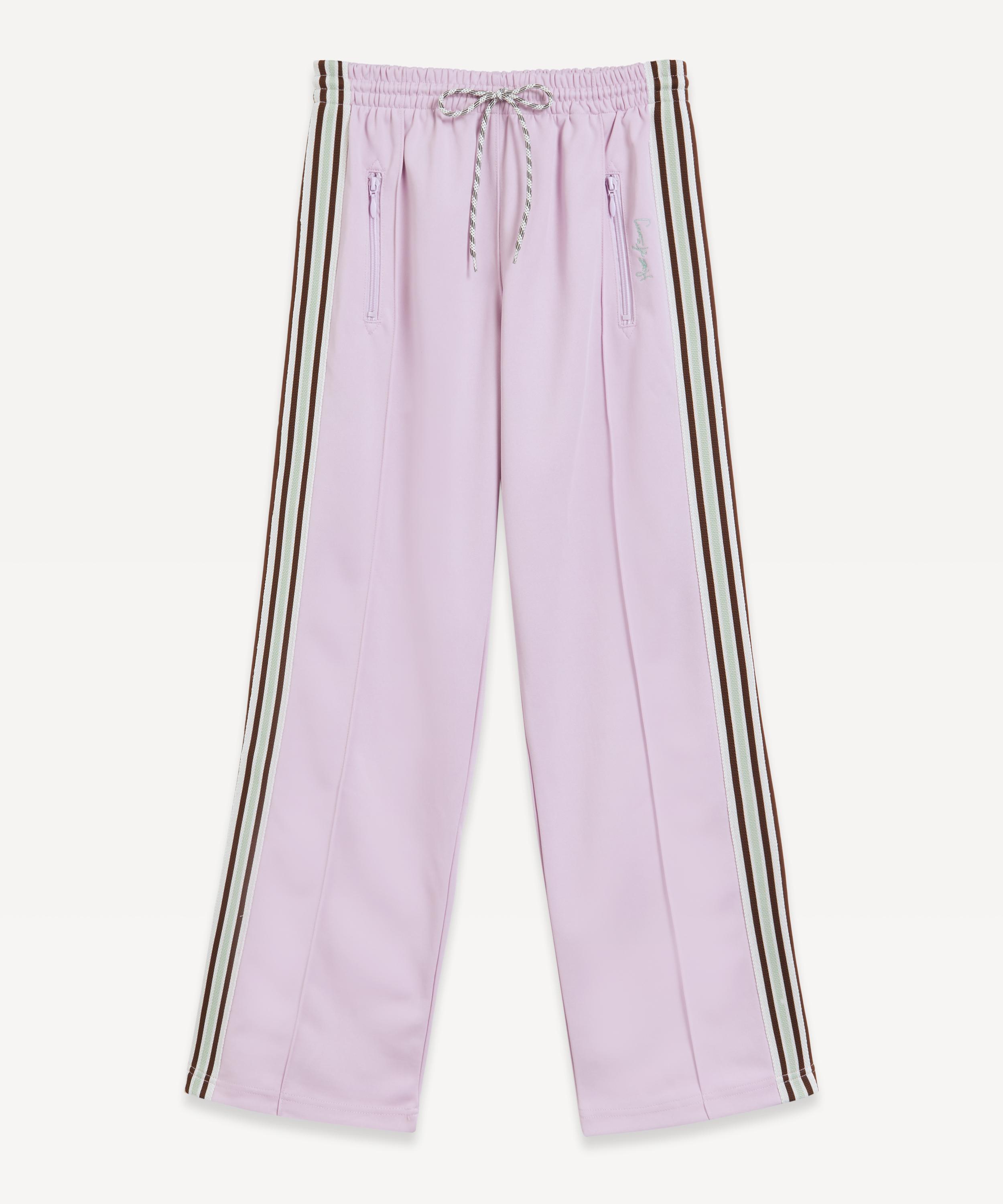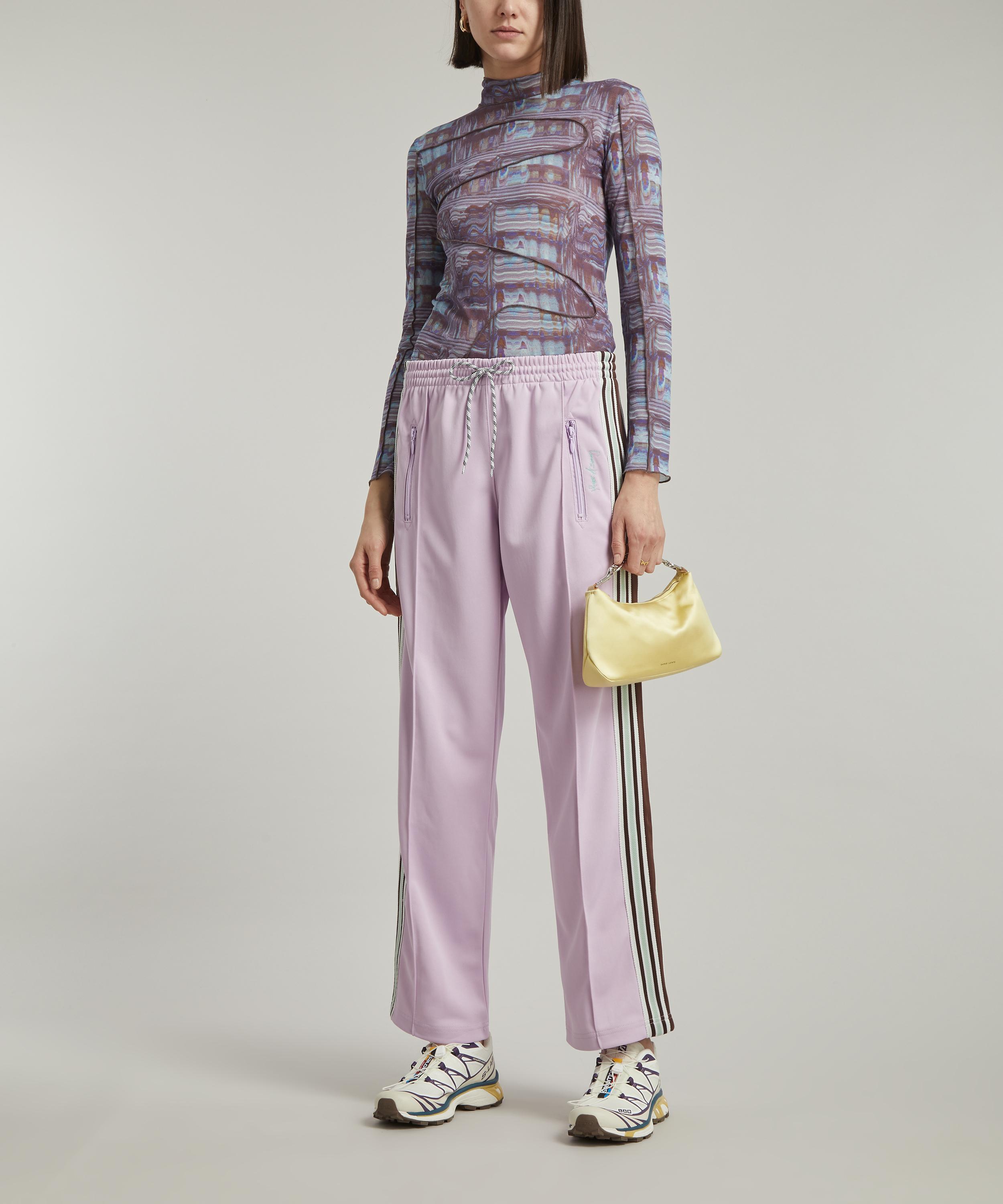 Liven-up your laid-back look with these luxe lilac tracksuit bottoms, cut to a relaxed, straight fit with a multicoloured, mint-green side-stripe. Super comfy and effortlessly cool, they feature an elasticated waistline with an adjustable drawstring, and two zip-up welt-pockets. For an eclectic every-day edit, pair them with a jazzy turtleneck, trainers and a statement satin clutch-bag.