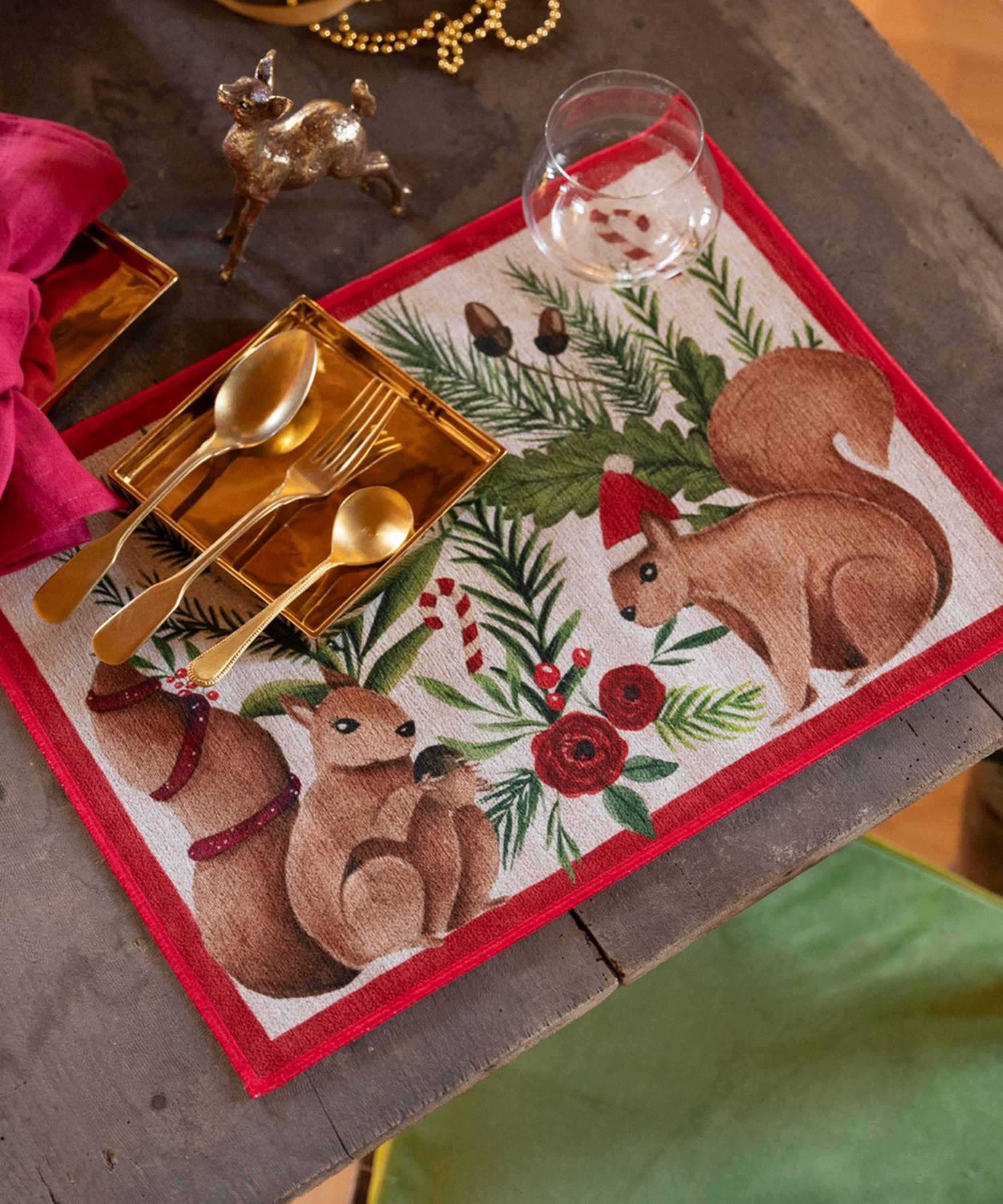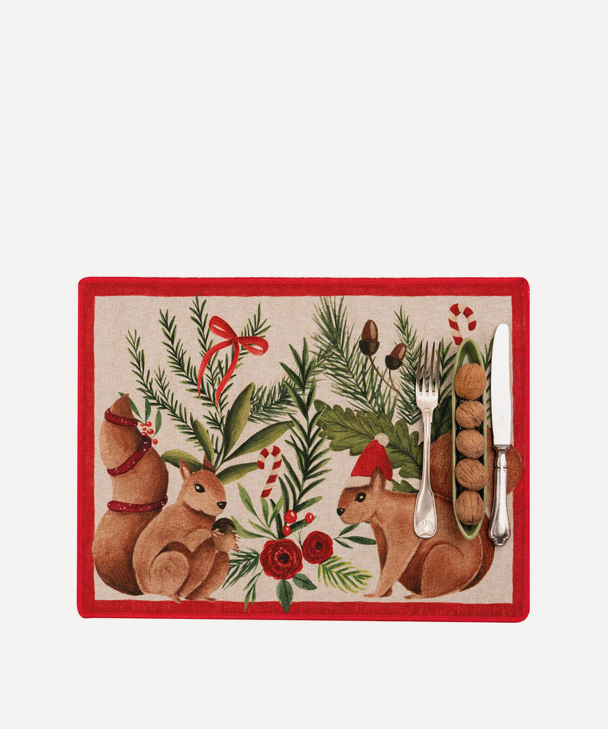 Presenting a charming scene of festive foliage and characterful squirrels, this bold and bright design is beautifully printed onto a classic rectangular silhouette for a flawless finish. Arrange with neutral tableware to let the print stand out or pair with coloured glassware for a maximalist edge – the perfect accent to your festive gathering.