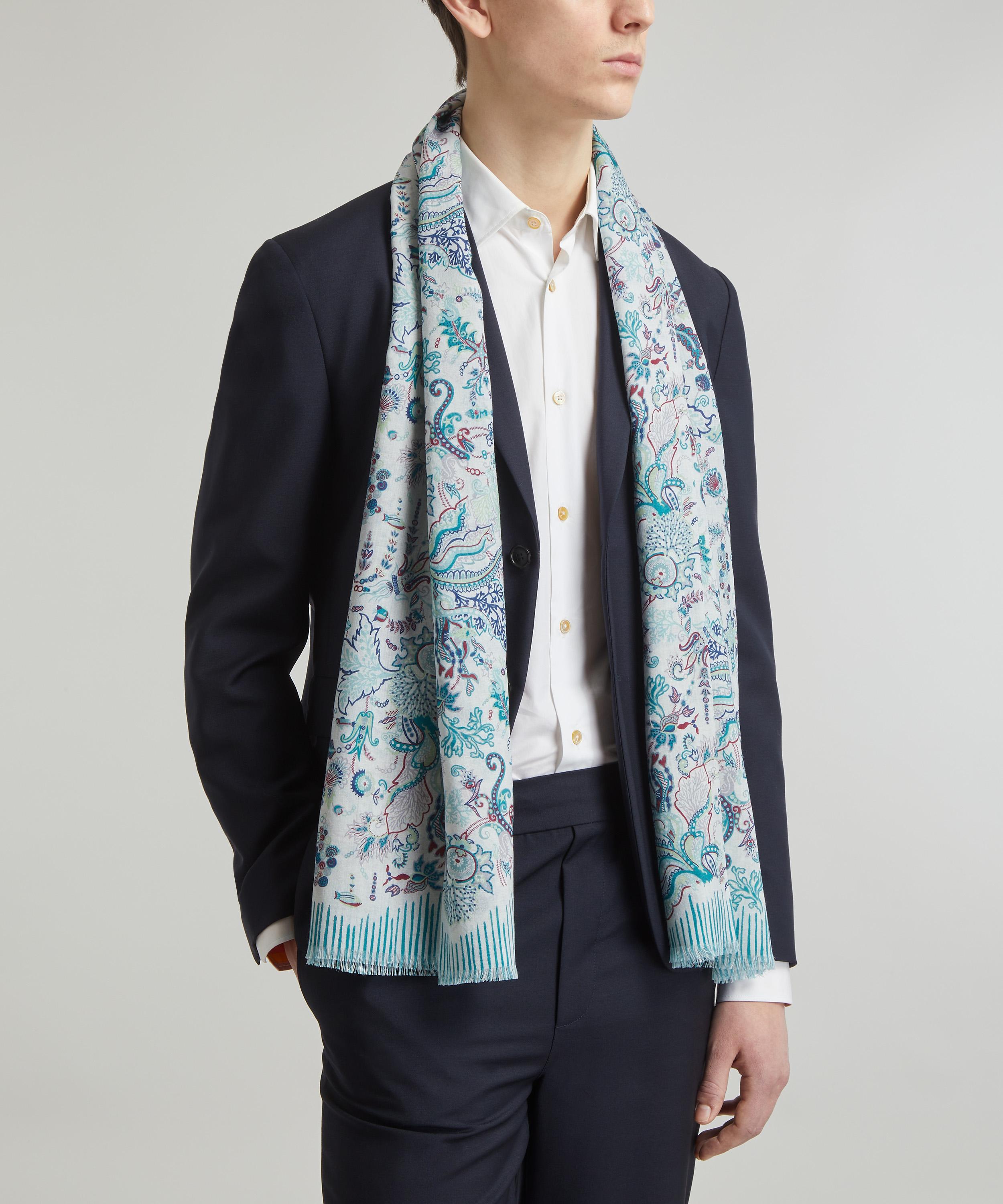Made and printed on a luxe wool-silk blend by experts in Britain, this lustrous scarf is dressed in an imaginative design depicting underwater scenes to remind us of the natural hidden wonders of this blue planet - drape it loosely around the neck to add a dose of artful pattern to special occasion ensembles.