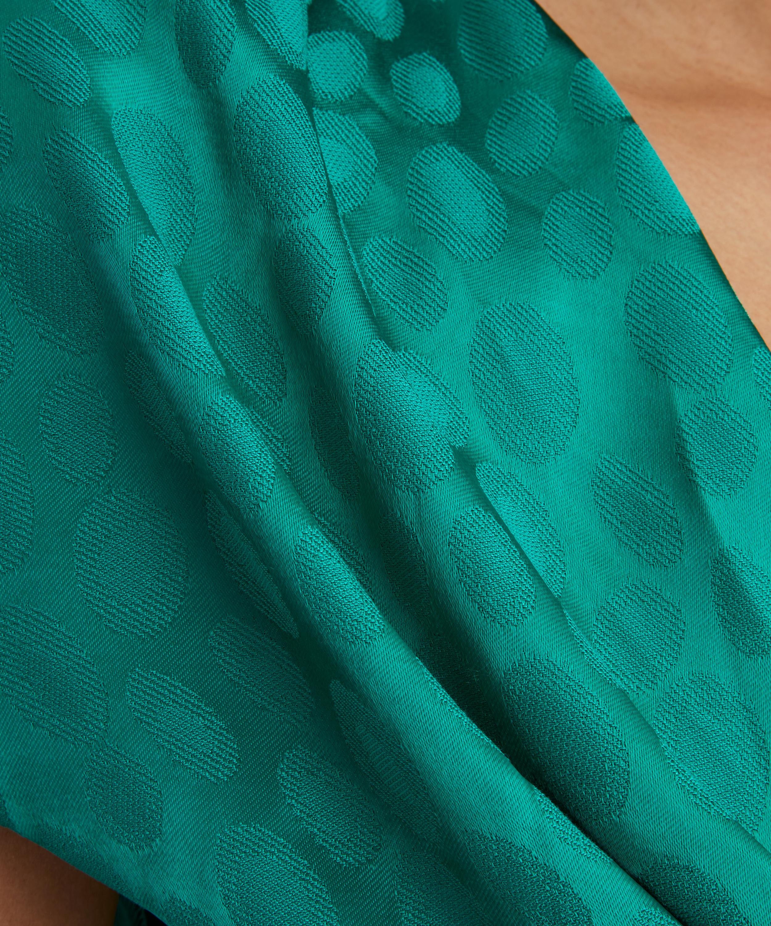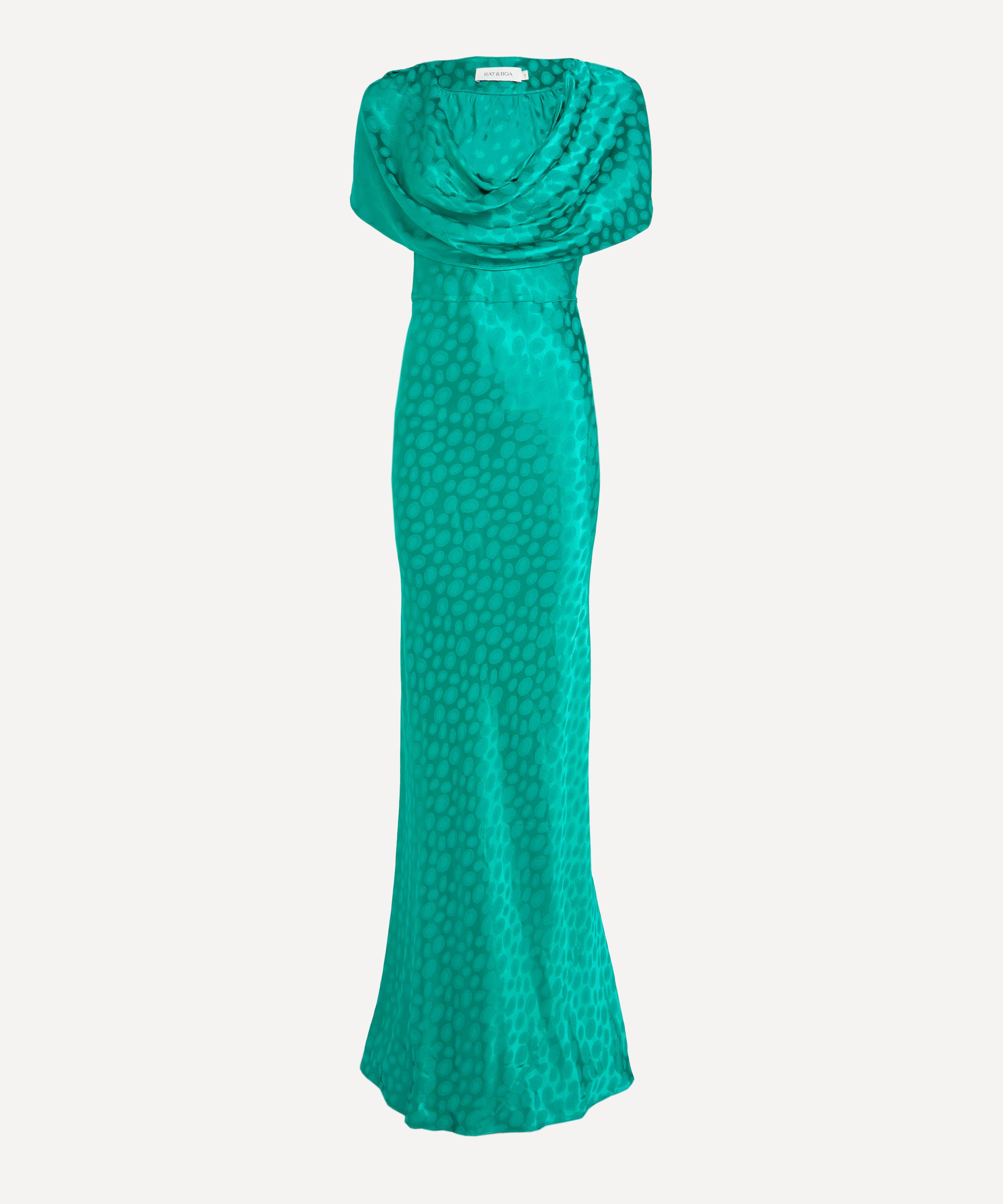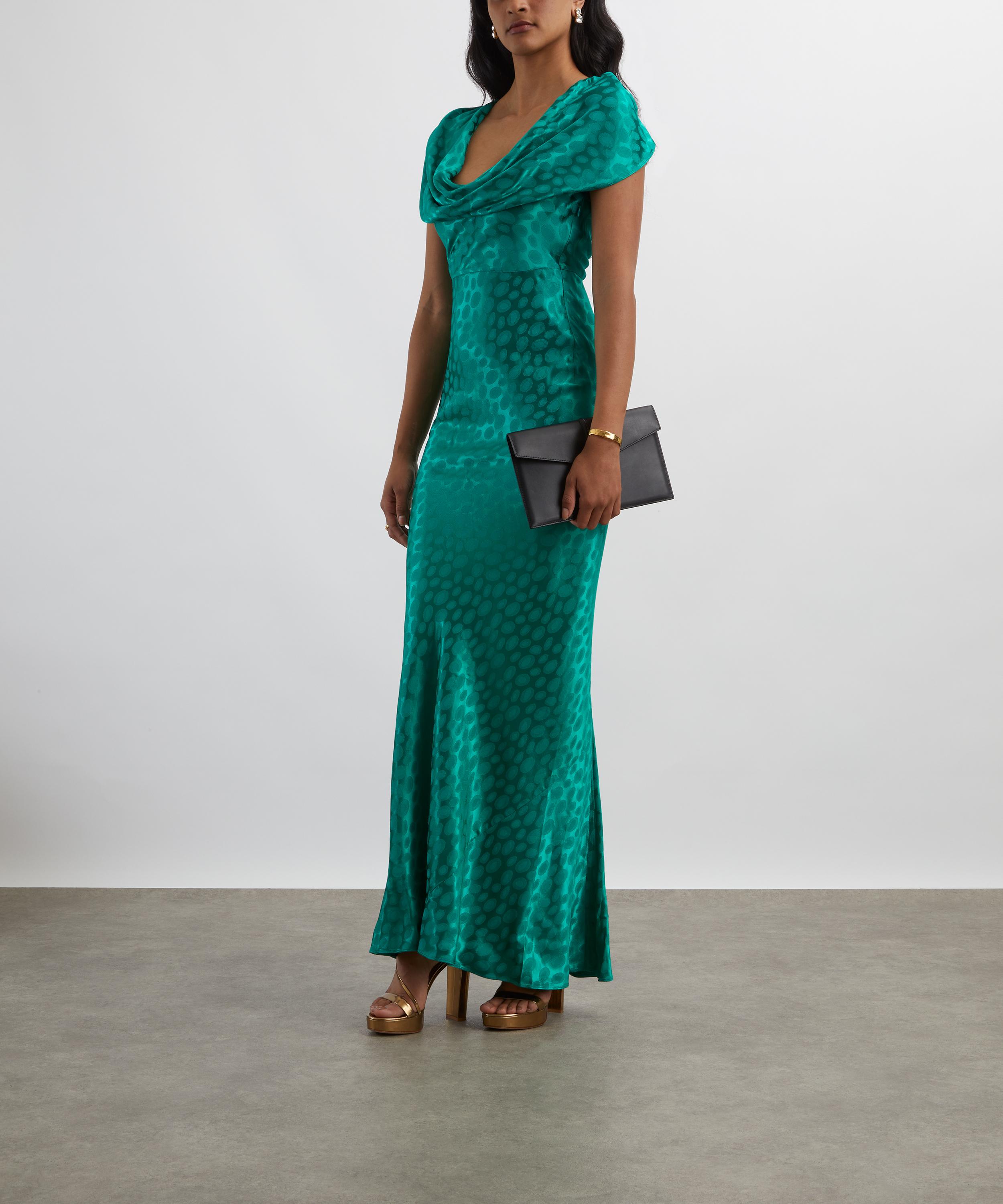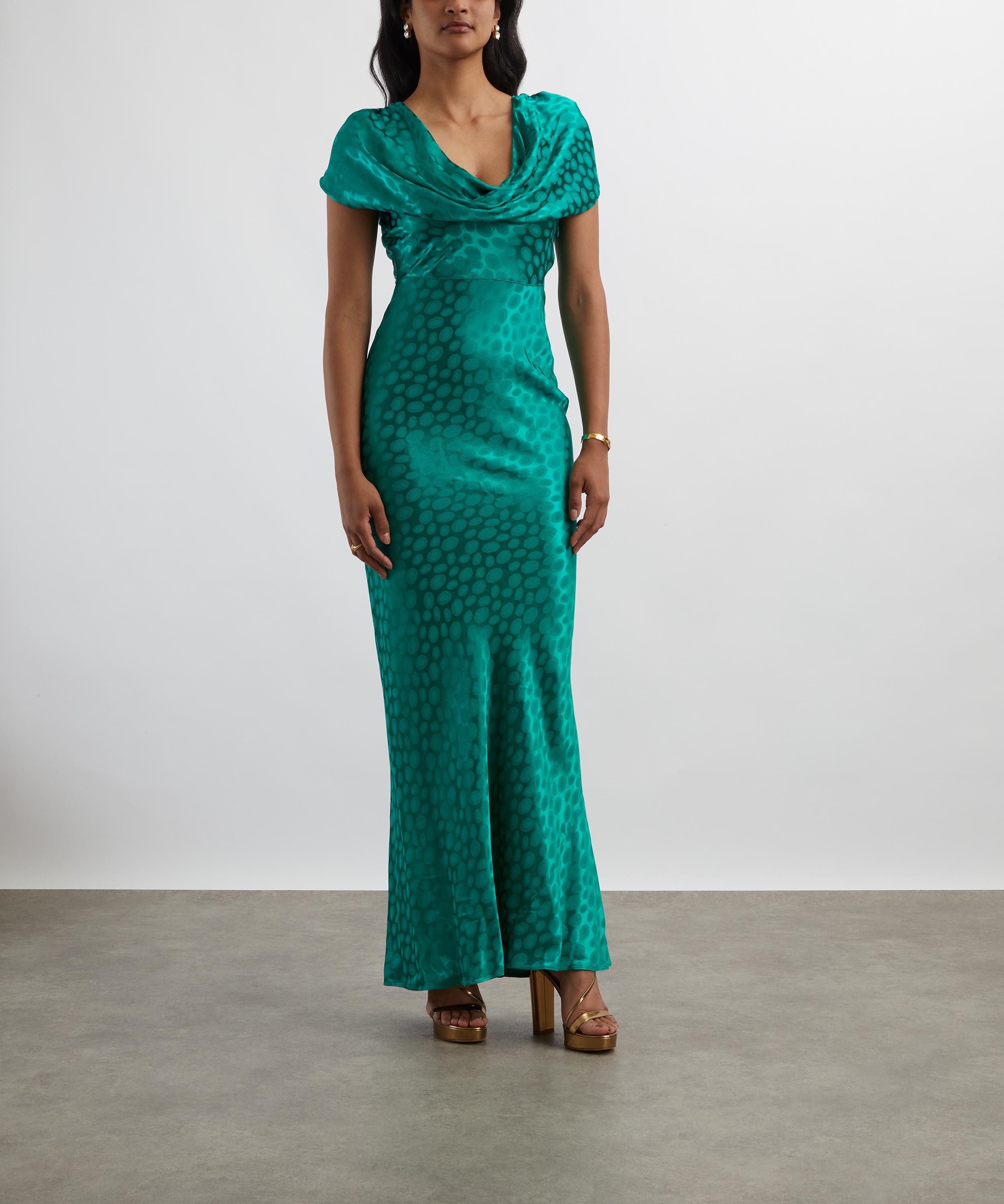 rafted from deep emerald jacquard satin scattered with spots, this sleek maxi dress exudes sophistication with its figure-skimming silhouette and elegantly draped cowl neckline.