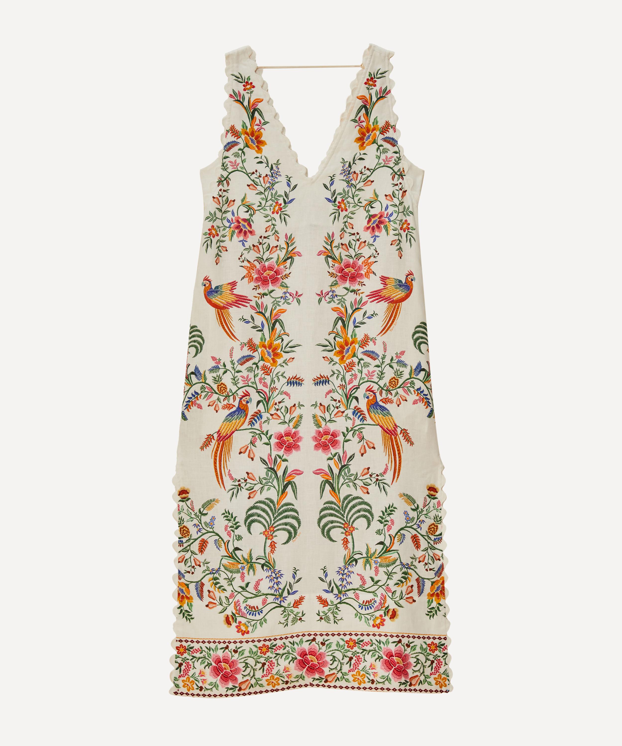 Embrace the enchanting allure of the Off-White Delicate Forest Linen Maxi Dress. Crafted from linen, it features a vibrant botanical print with colourful flora and avian motifs, scalloped detailing at the V-neckline, and a breezy silhouette for effortless elegance.