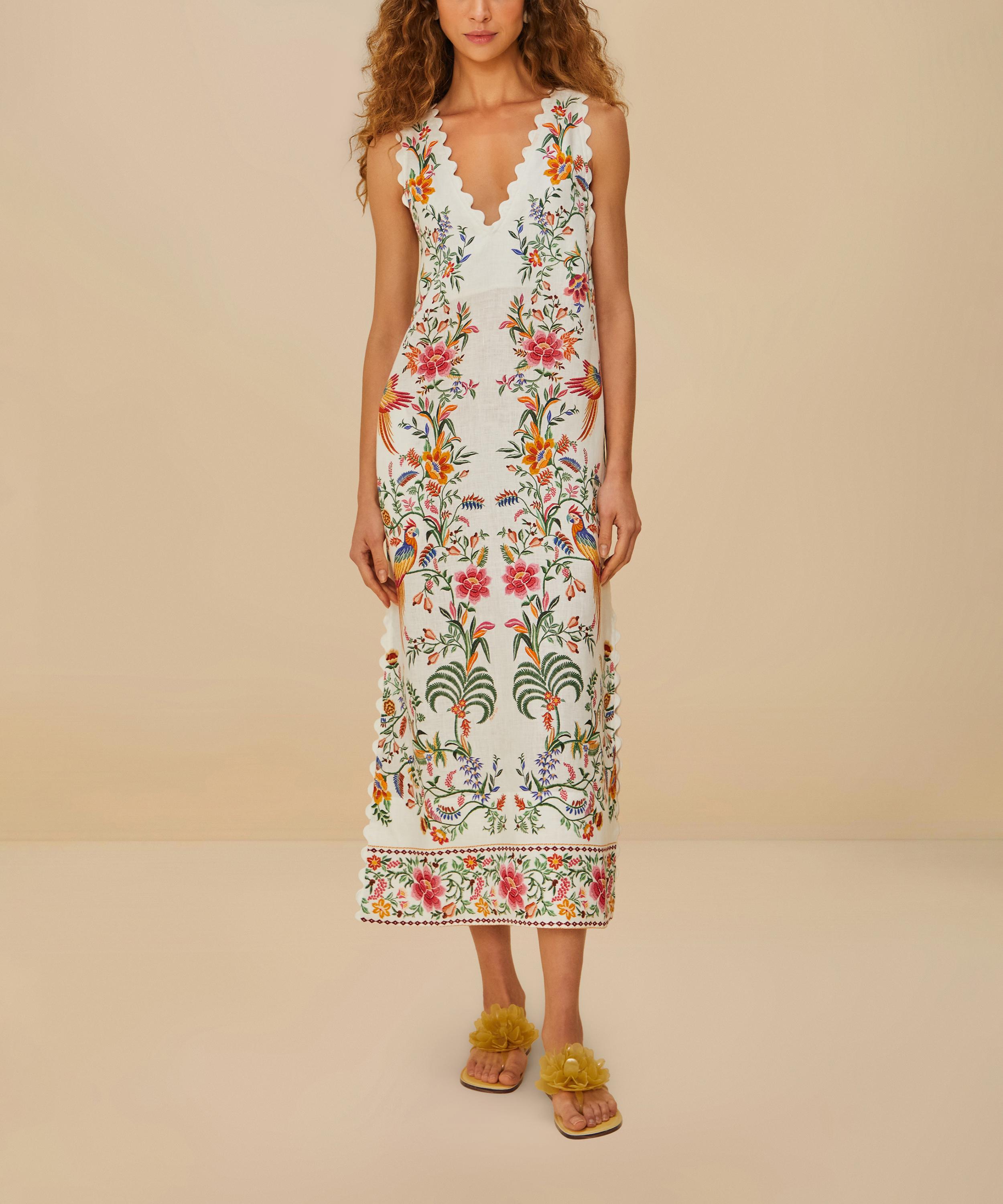 The Off-White Delicate Forest Linen Maxi Dress from Rio de Janeiro-based label FARM Rio brings some Brazilian vivacity to your new-season edit.