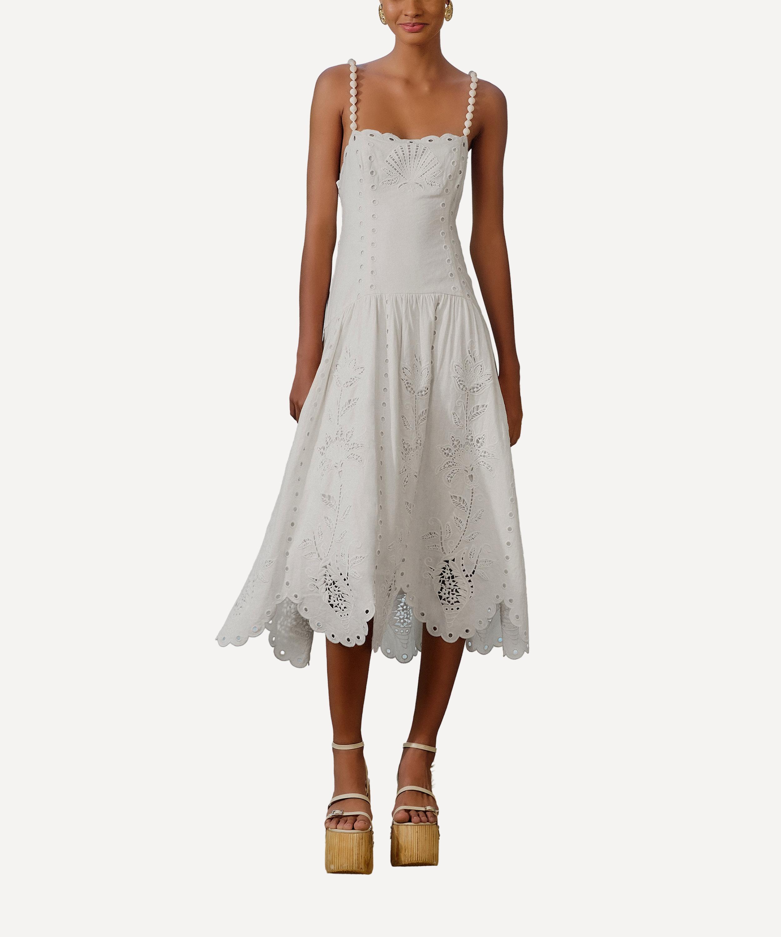 The Off-White Richelieu Linen Sleeveless Midi Dress blends elegance and whimsy with intricate eyelet embroidery, a scalloped hem, and a flowing flared skirt. Featuring a square neckline and braided straps, it’s crafted from responsible materials - offering both comfort and timeless charm.