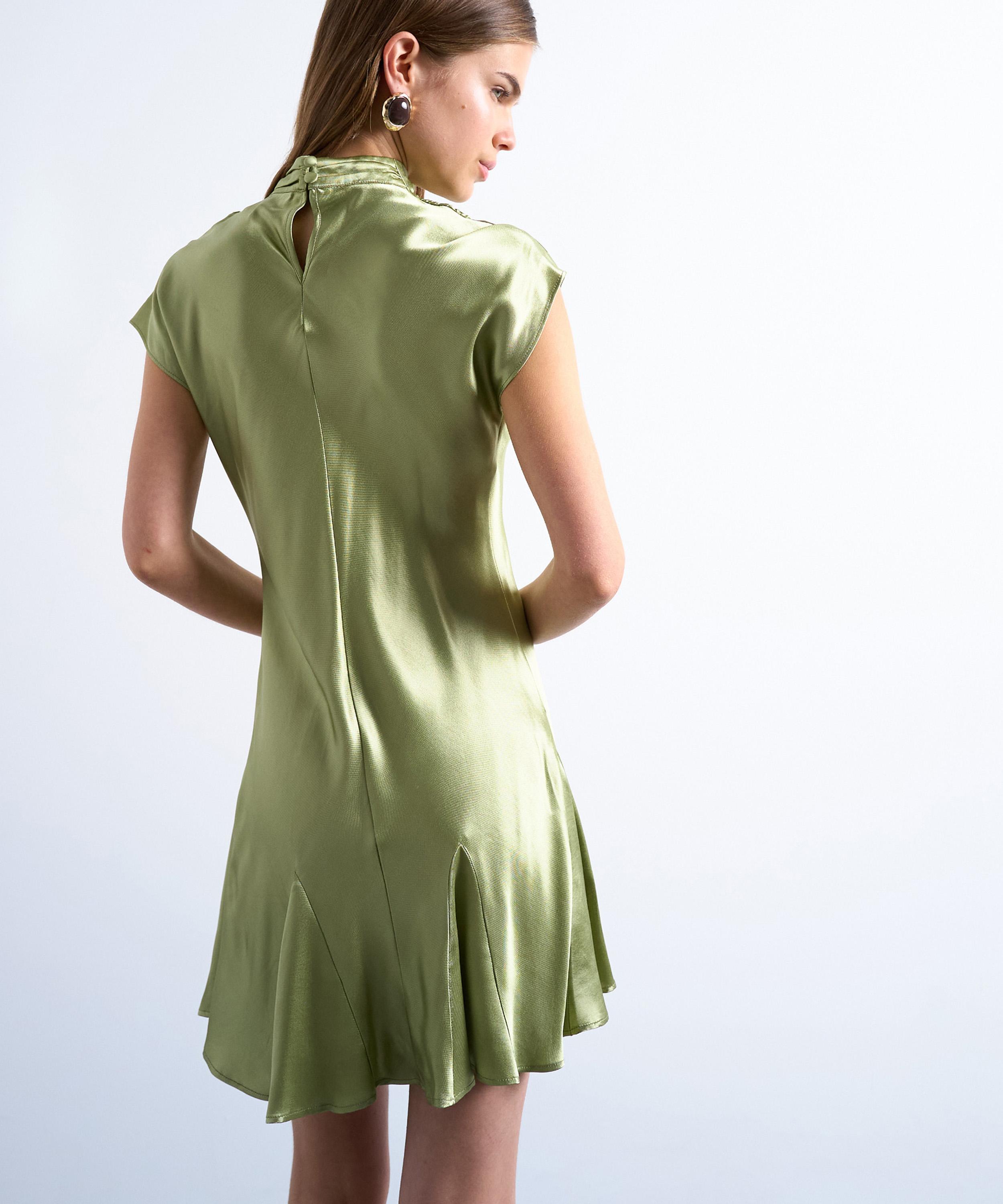 Crafted from glossy, satin-like fabric, this chic dress features a high neckline, cap sleeves, and a flowy, bias-cut mini skirt, creating an effortlessly refined and feminine finish.