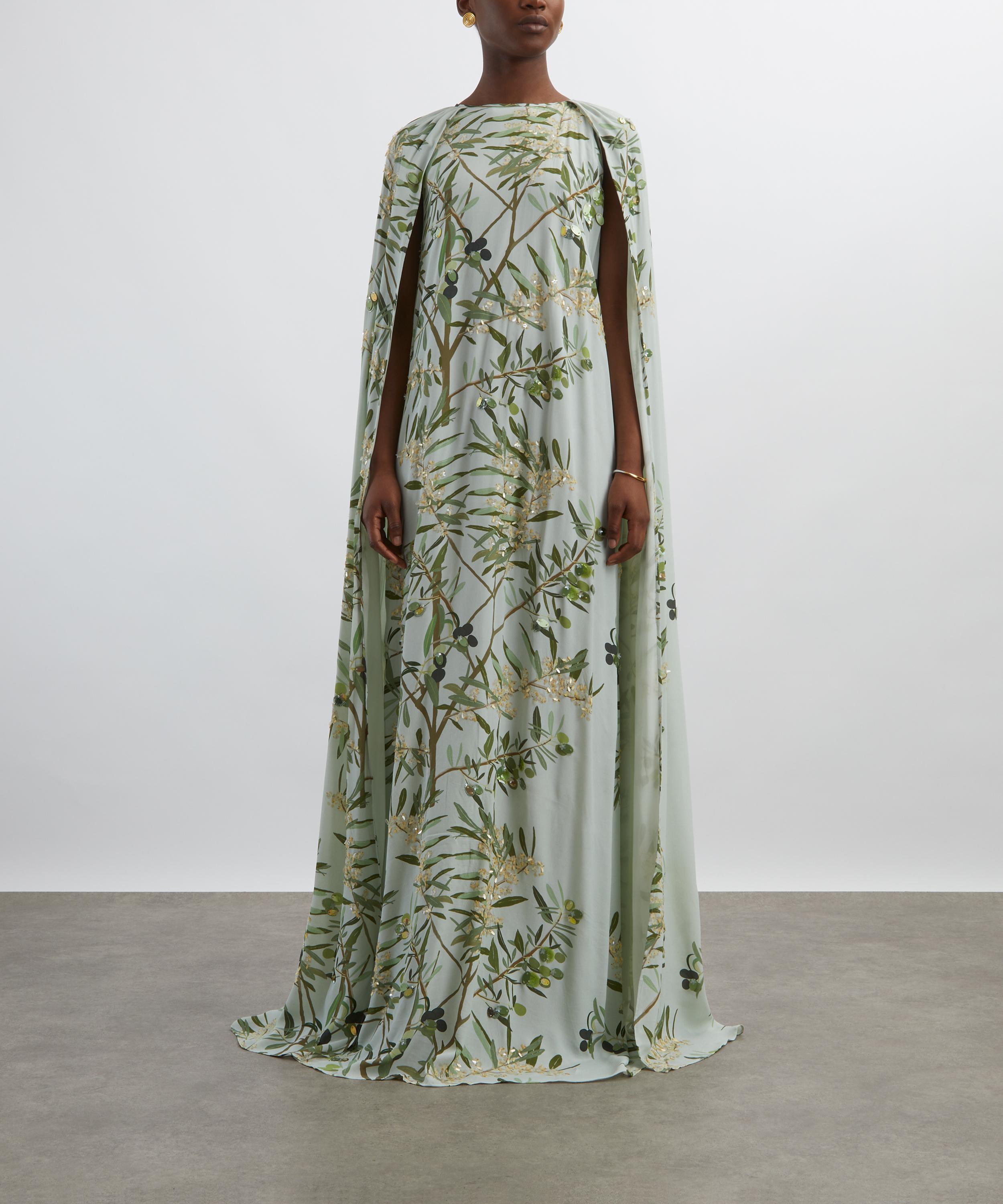 Crafted from lightweight crepe and adorned with intricate embroidery and this season’s Olive Tree print, this floor-length gown features a delicate cape gathered at the neckline, cascading gracefully to the floor for a striking statement look.