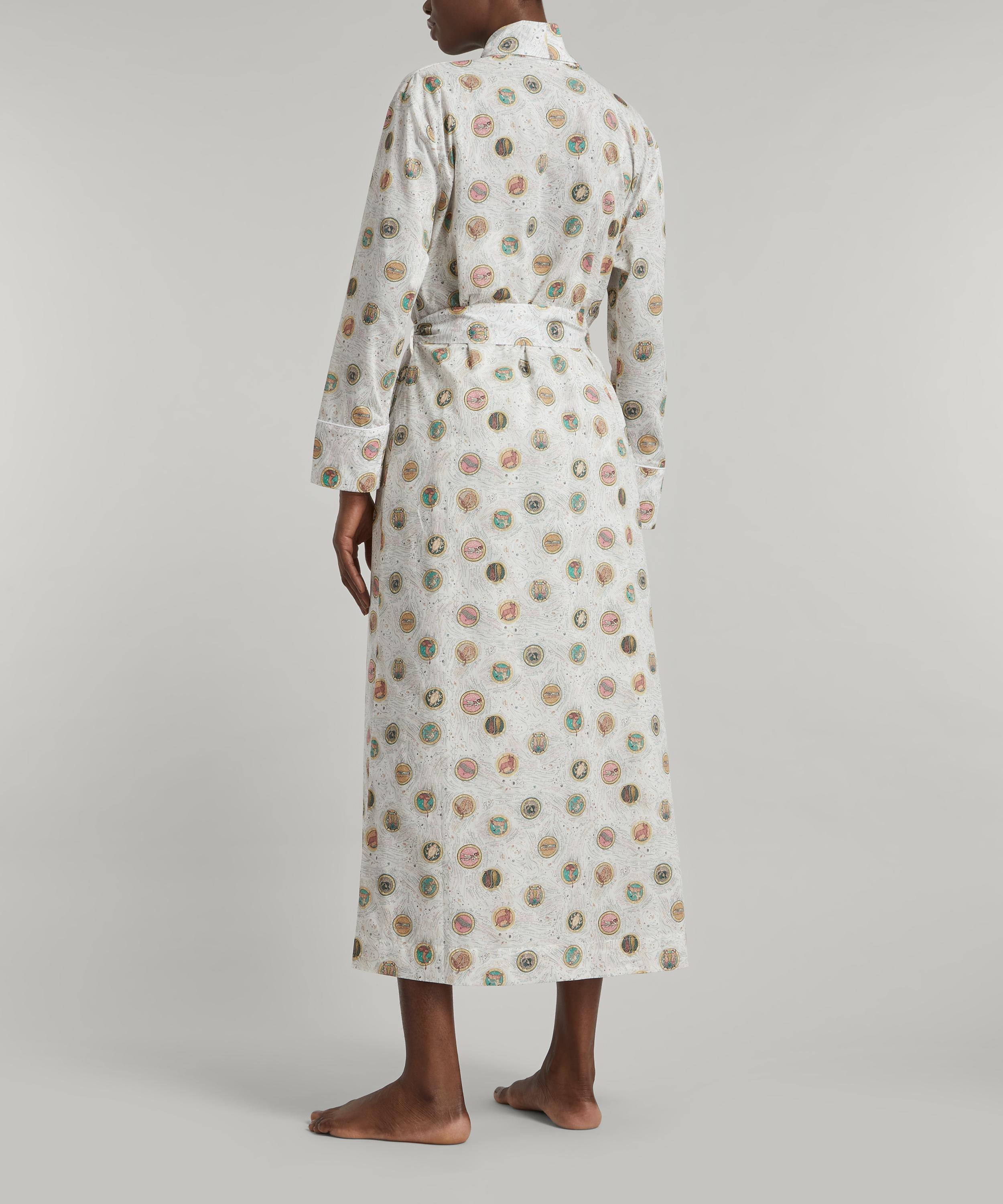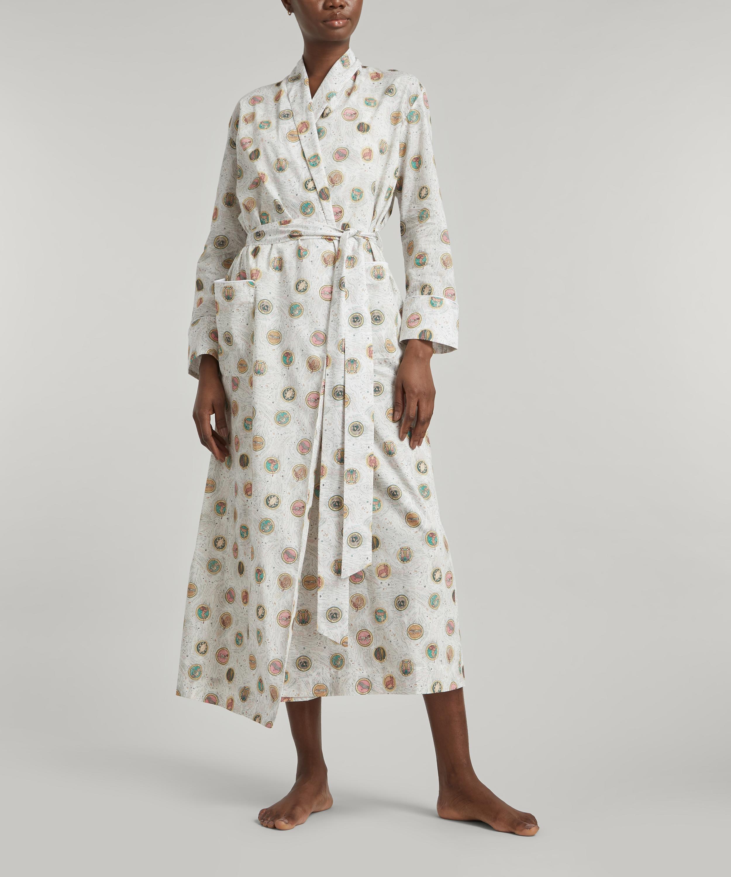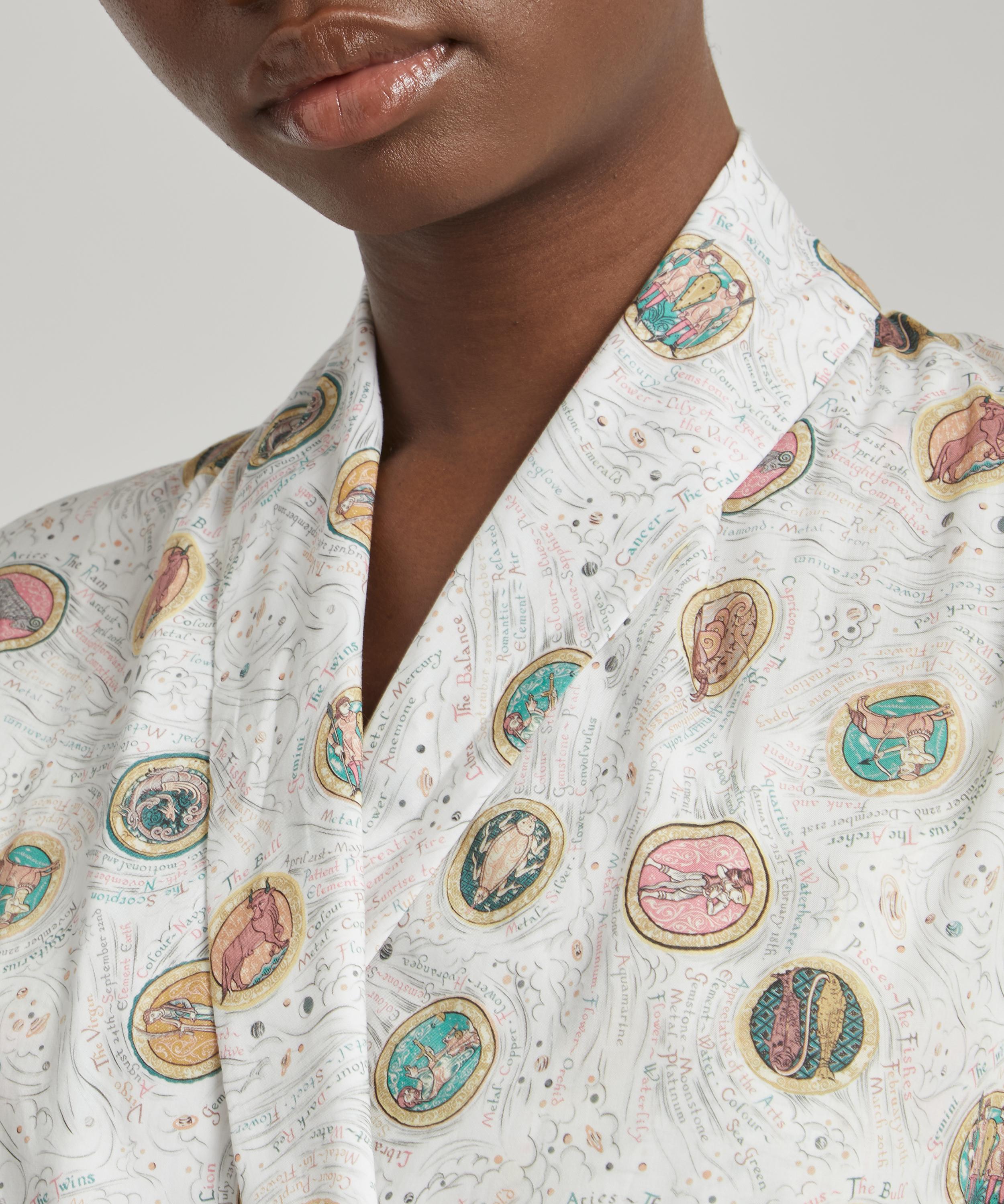 Tana is a true Liberty signature – a light, fluid revelation of a fabric that we’ve been perfecting for over a century, ultra-smooth to the touch and ideal for keeping cosy yet cool at night. Finished with elegantly piped trims, two front patch pockets and a tie waist belt, this classic long women’s dressing gown robe spotlights our Orion print – drawn from a hand-painted Liberty scarf artwork, Orion invites us to enter a dreamlike cosmos. Its mesmerising conversational pattern depicts a phantasmagorical arrangement of astrological signs and their symbols, along with planets, stars and distant galaxies.