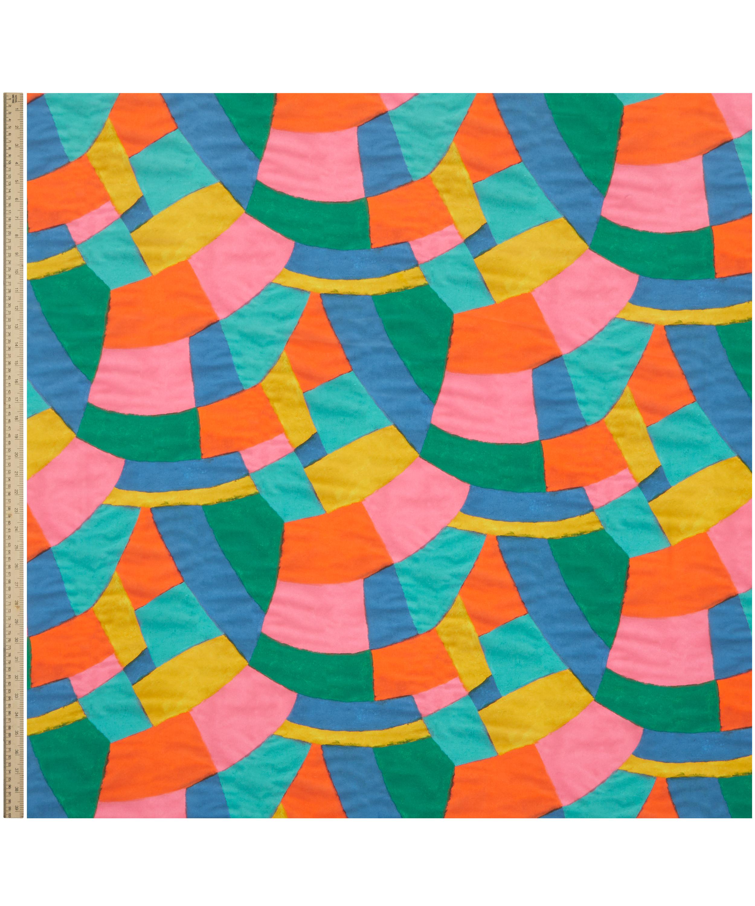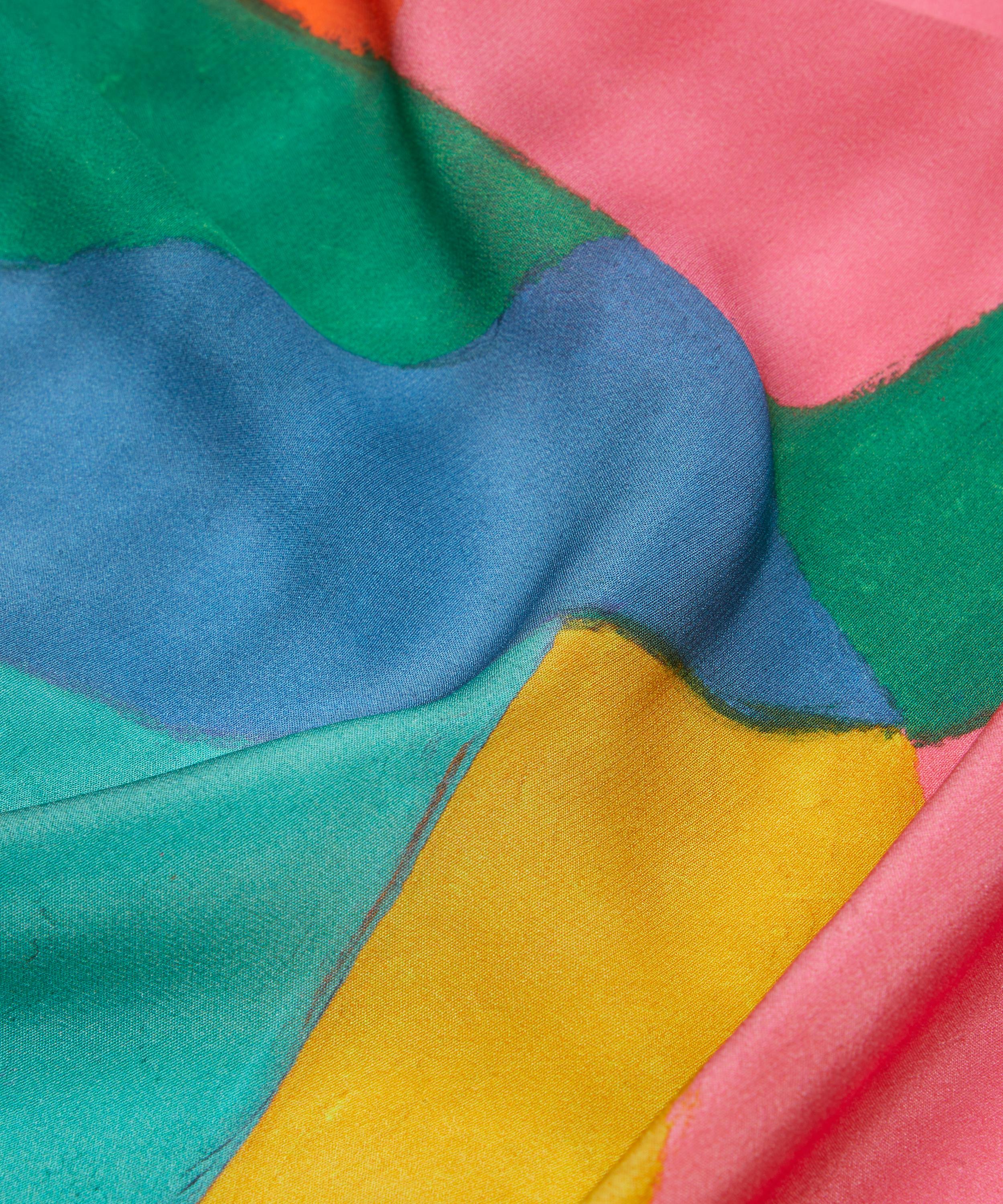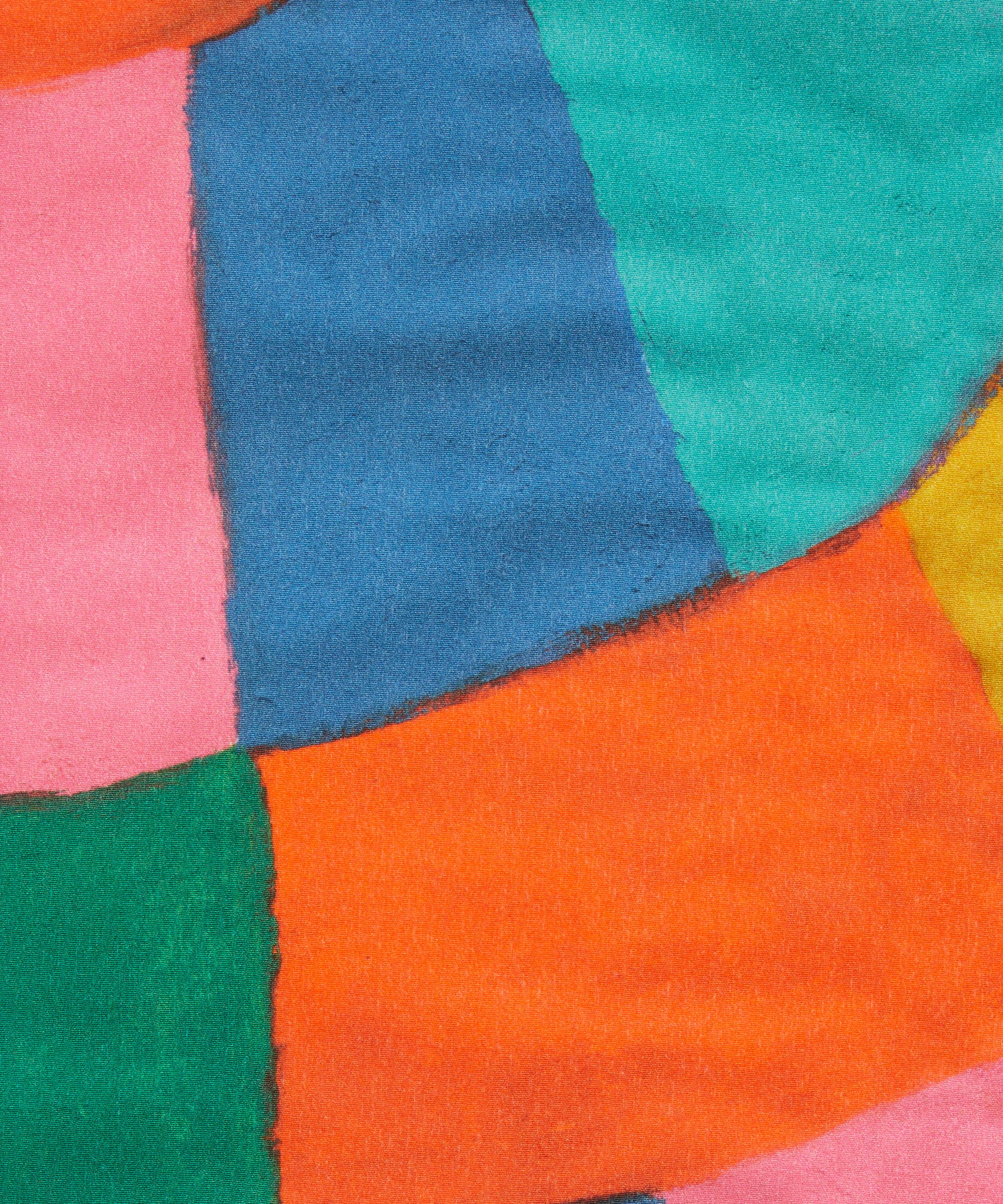 Created in textured acrylic paint with a large brush, Orphism was inspired by dancing fragments of light. Its loose geometric design captures a sense of pure abstraction in bold, bright colours. This print is part of the Spectrum story of our Spring/Summer 2024 collection - influenced by eclectic modern art movements, from the bold complementary hues of Fauvism to the synesthete musicality of the Orphists, with designs paying tribute to a vibrant array of colourful phenomena and pigment conception.