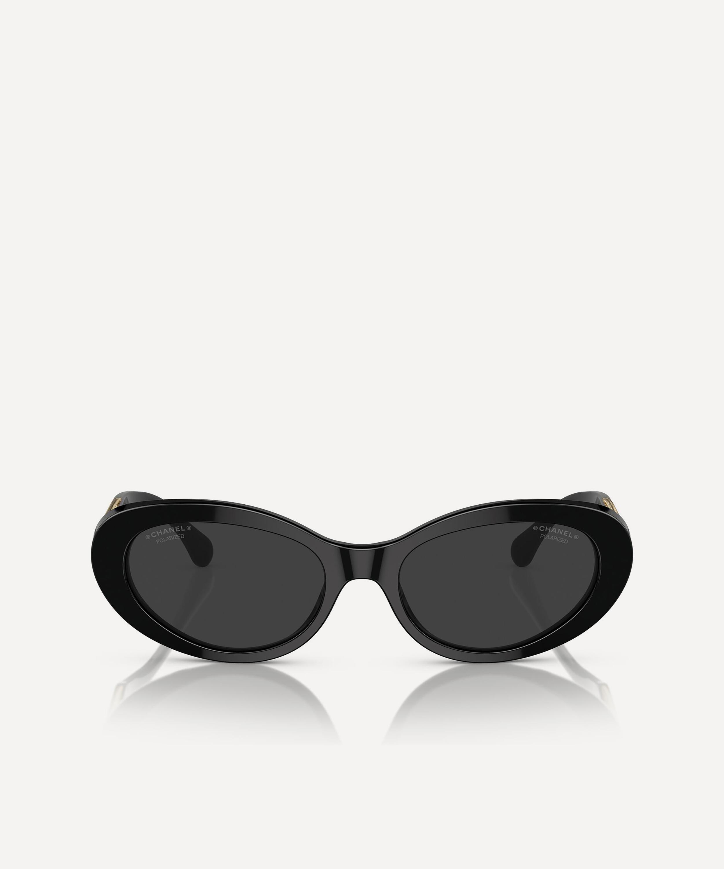 Add a touch of glamour to your everyday look with these oval sunglasses from Chanel. Crafted from premium acetate in a black colourway, they feature a sleek silhouette with a comfortable saddle nose bridge and black polarised lenses to protect your eyes from UV light. Complete with chain detailing and the iconic CHANEL emblem logo to the temples, style them with pulled-back hair to show off the details.