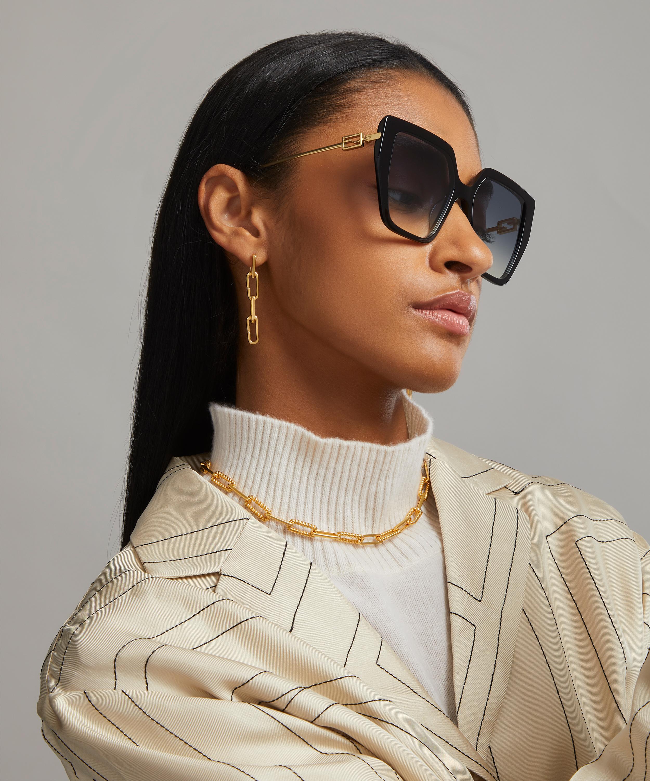 Crafted from glossy black acetate, these oversize sunglasses are balanced by their slim gold-toned frames, signed off with the Italian house’s motif to the temples. Complete with gradient grey lenses that deliver complete UV protection, this pair is destined to be styled with pulled-back hair to flaunt the details.