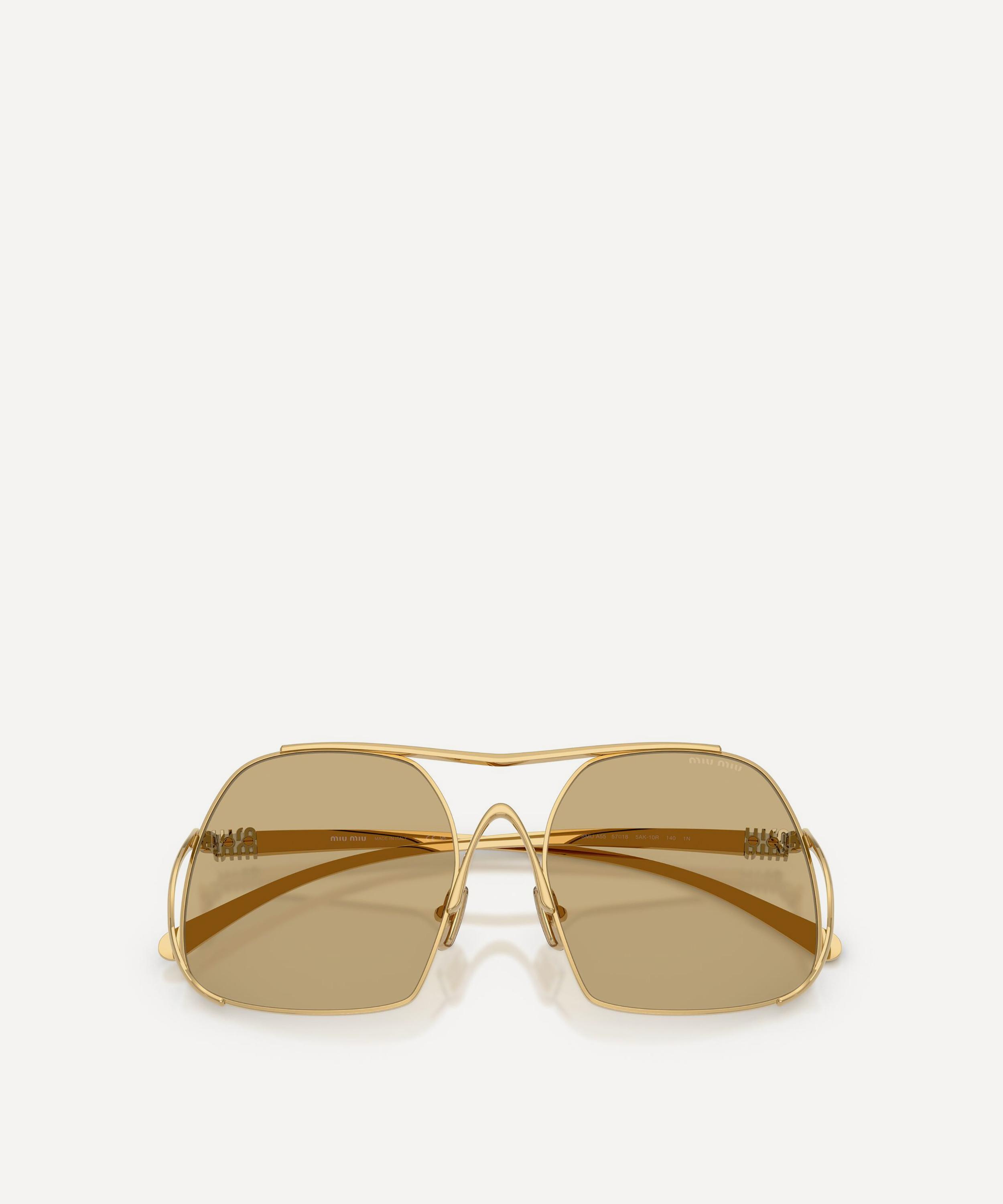 Heighten the impact of any attire with these square sunglasses from Miu Miu. Expertly crafted from gold-tone metal, to create a statement pair that instantly draws the eye, these oversized sunnies are fitted with adjustable nose pads and light-brown lenses to shade and protect your eyes from UV light. Complete with a decorative top bar and the signature branding at the temples, they make for an ultra-chic finish to your curated looks.