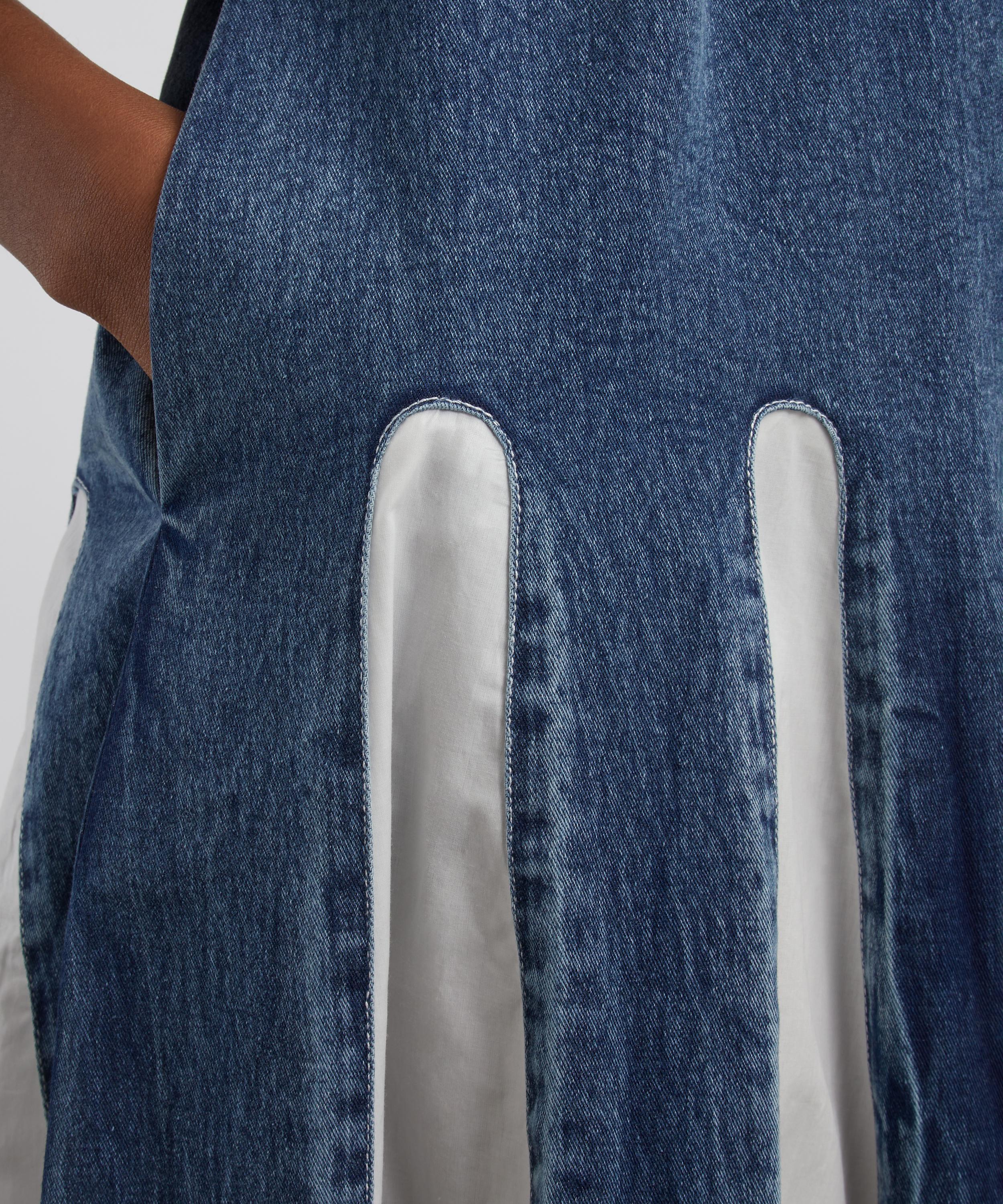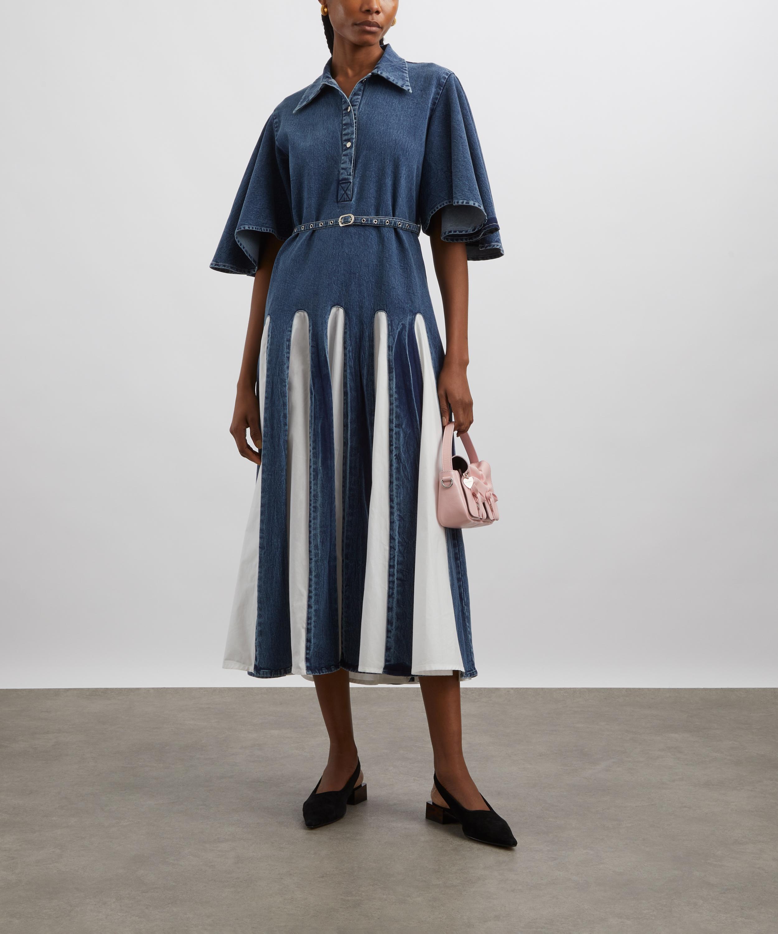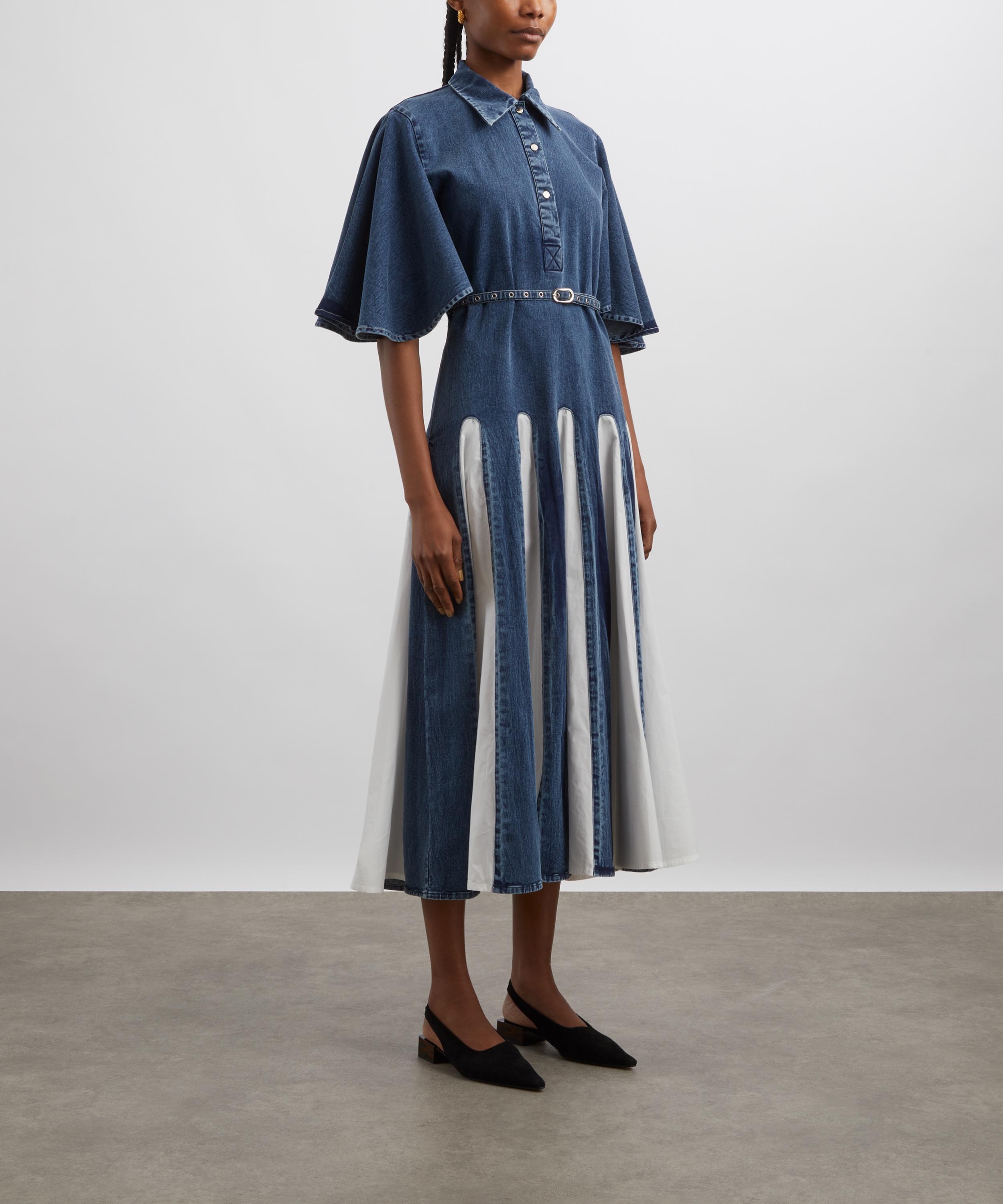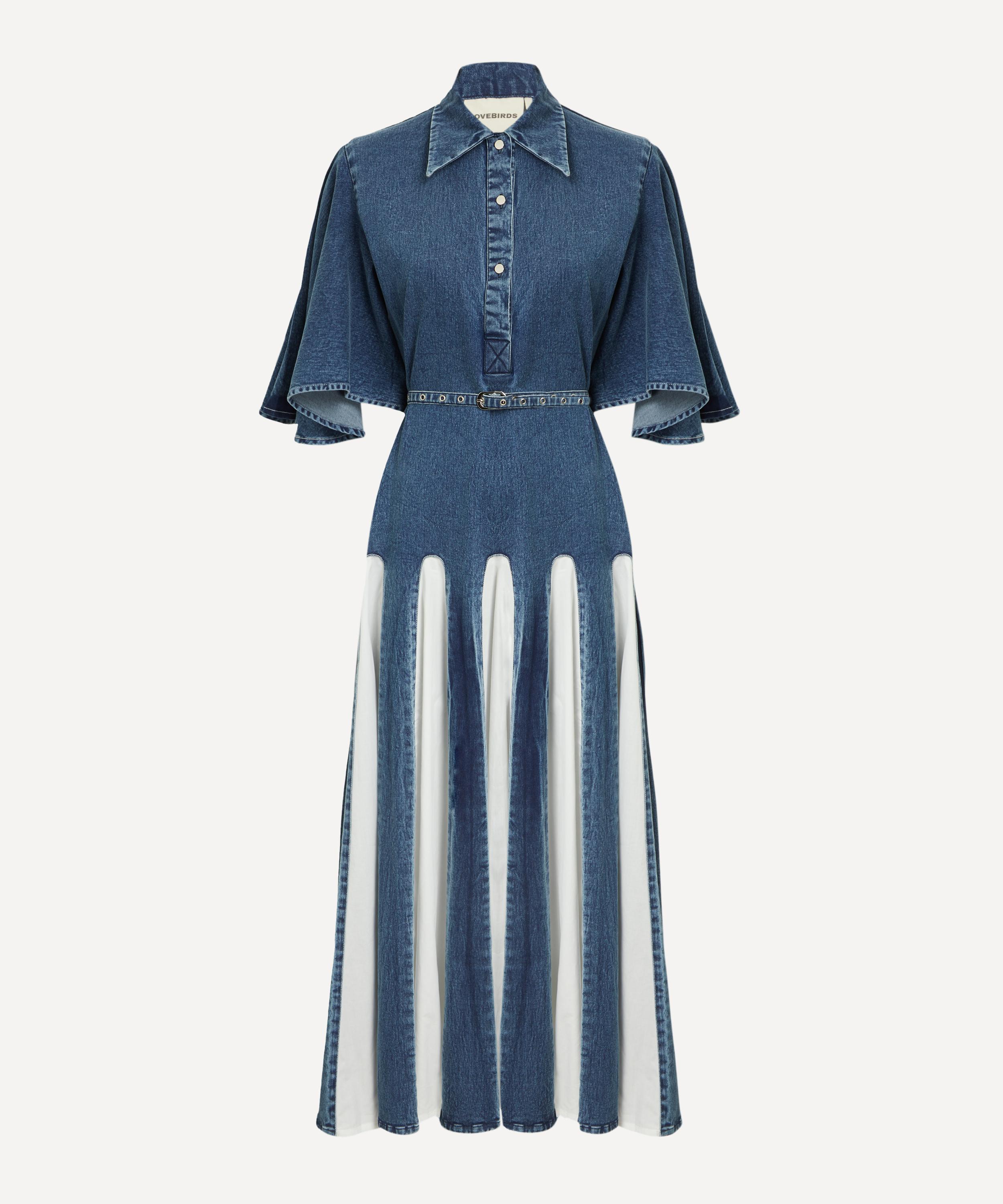 Functional, modern, and playful, the Oxford Colourblock Denim Godet Dress from Lovebirds Studio captures the brand’s signature blend of sophistication and effortless style.
