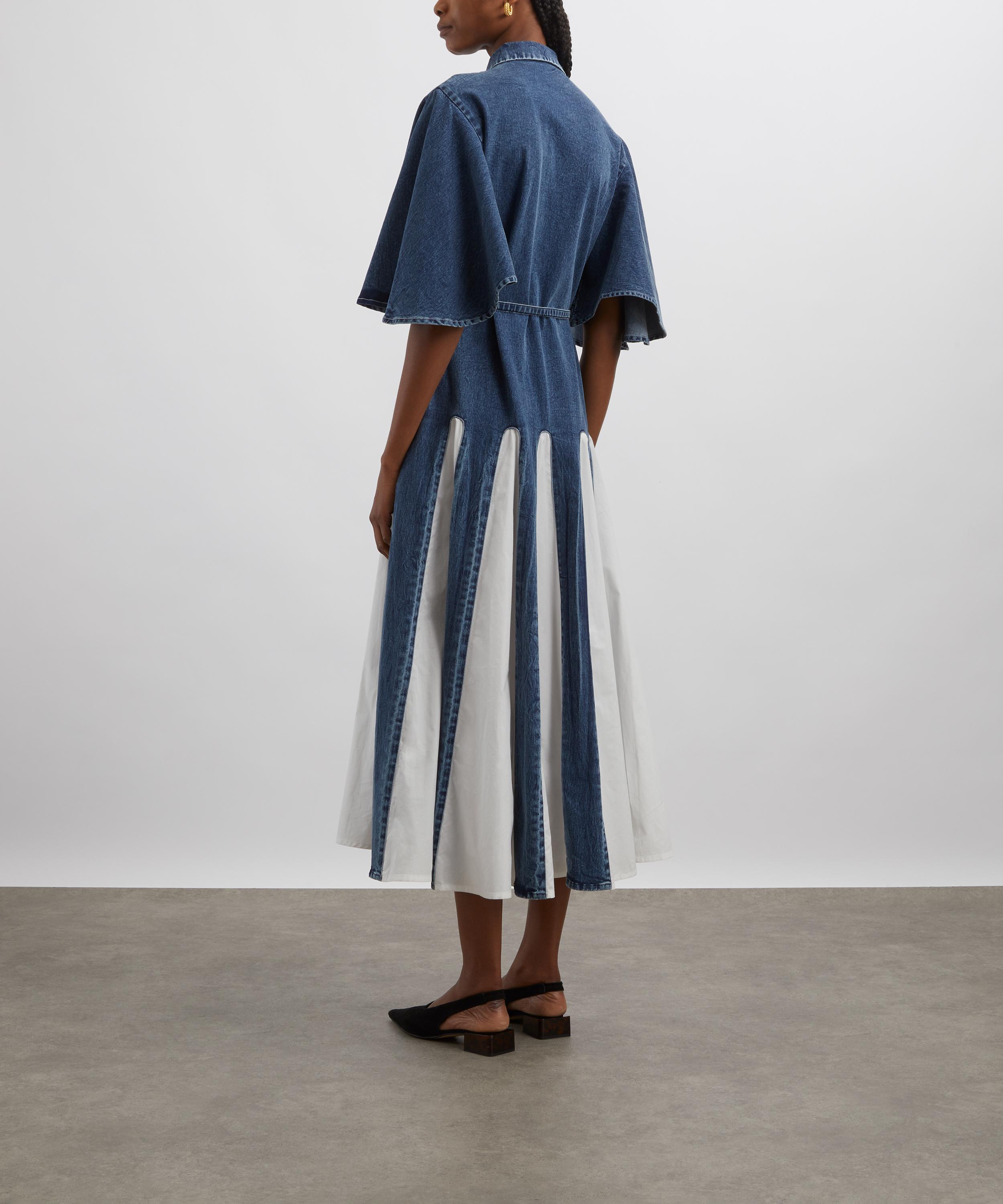 Featuring a flattering A-line silhouette, short butterfly sleeves, and a shirt collar, this denim dress is elevated by a flared skirt with contrasting white pleats for a stylish twist.