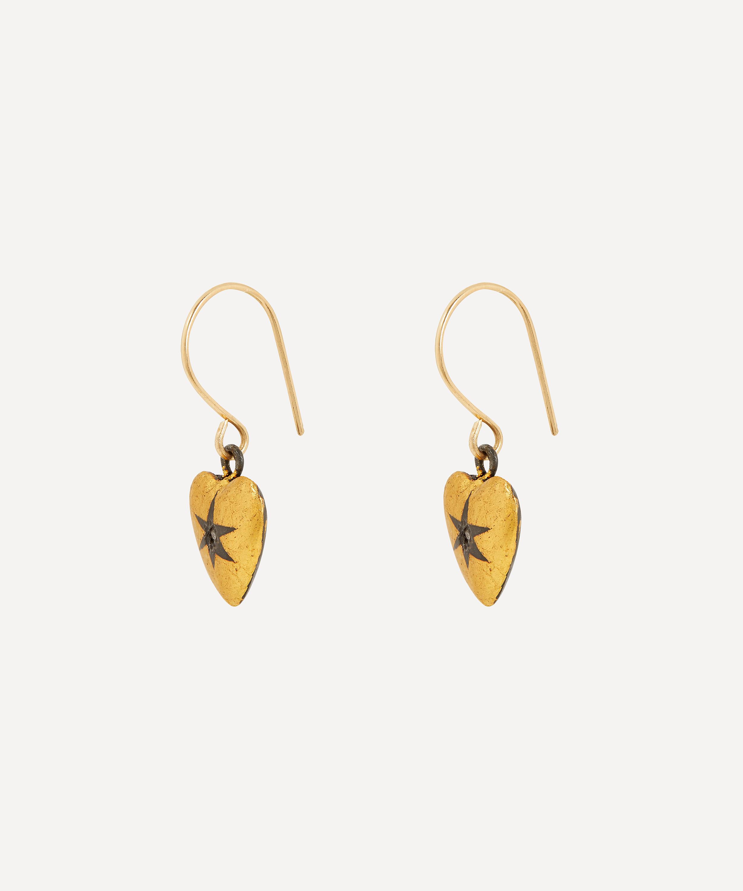 Each of these drop earrings features a small, oxidised silver heart with a brilliant cut white diamond centre and a 14 carat gold wire hook. Hand-applied 24 carat gold foil is painstakingly cut, placed and bonded to the silver using the ancient Korean gilding technique of 'keum-boo' to create the heart's cut-out star design. Team it with the coordinating diamond heart pendant necklace for an enchanting evening look.