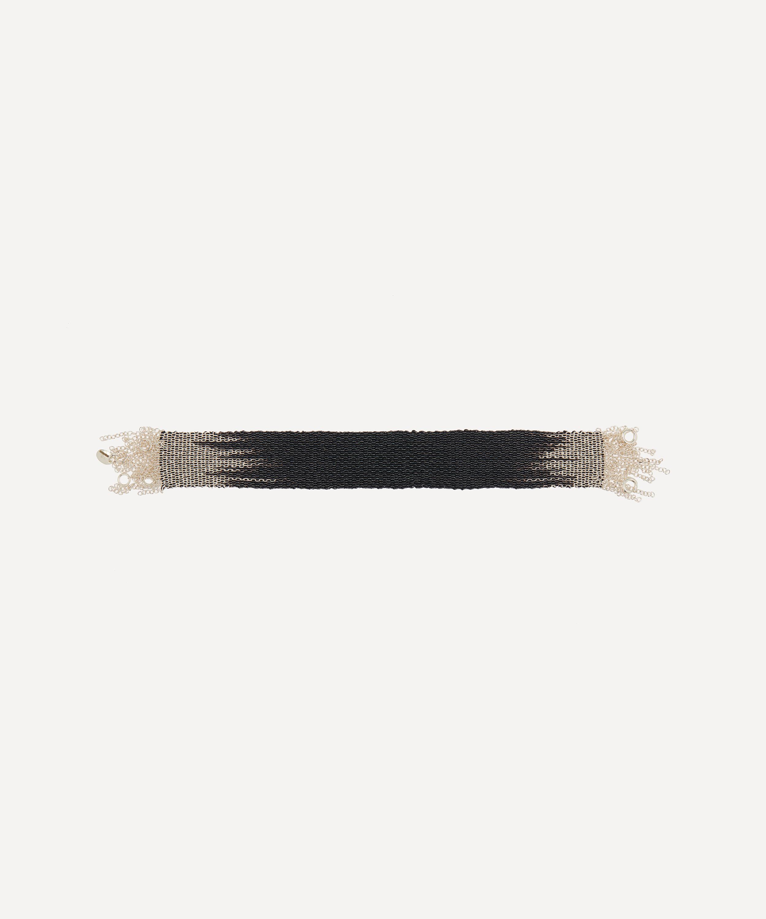 Handcrafted from oxidised silver, this bracelet is an exquisite example of Stephanie Schneider’s unwavering attention to detail and unique design aesthetic. A cluster of fine trace chains are threaded together to create a slightly wide, chainmail cuff with contrasting sterling silver fringed ends. Drawing on the designer’s textile background, this piece is interwoven with black silk thread for a tonal effect. Wear it alone, or style it with one of the brand’s coordinating chain drop earrings for an edgy curation.