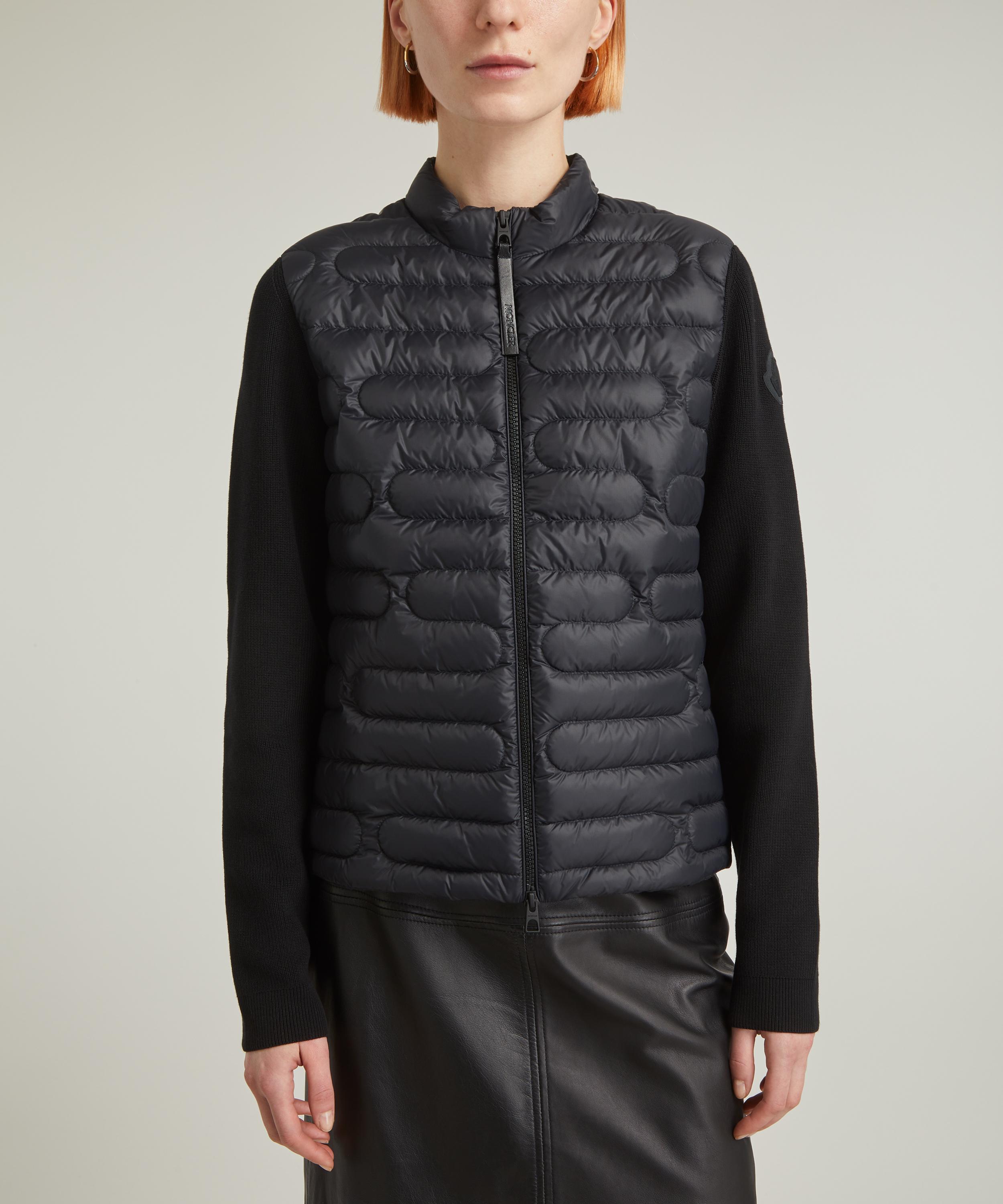 Keeping the chill at bay with its down-filled front, this padded cardigan provides ultimate insulation with its Merino wool ribbed-knit collar, sleeves, and back. Secured with a snap closure, it features four welt pockets at the front, and a signature logo patch embossed on its left sleeve.