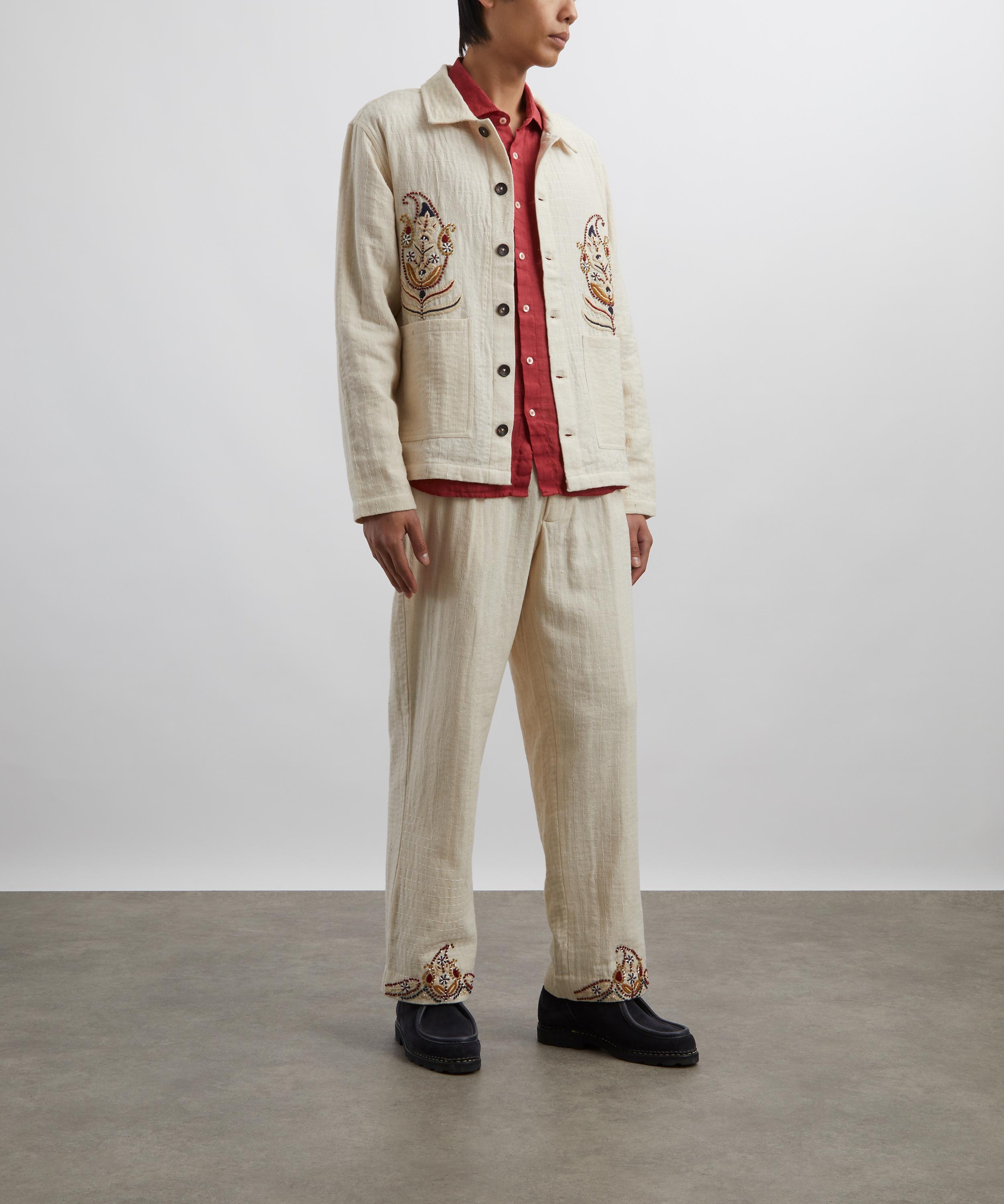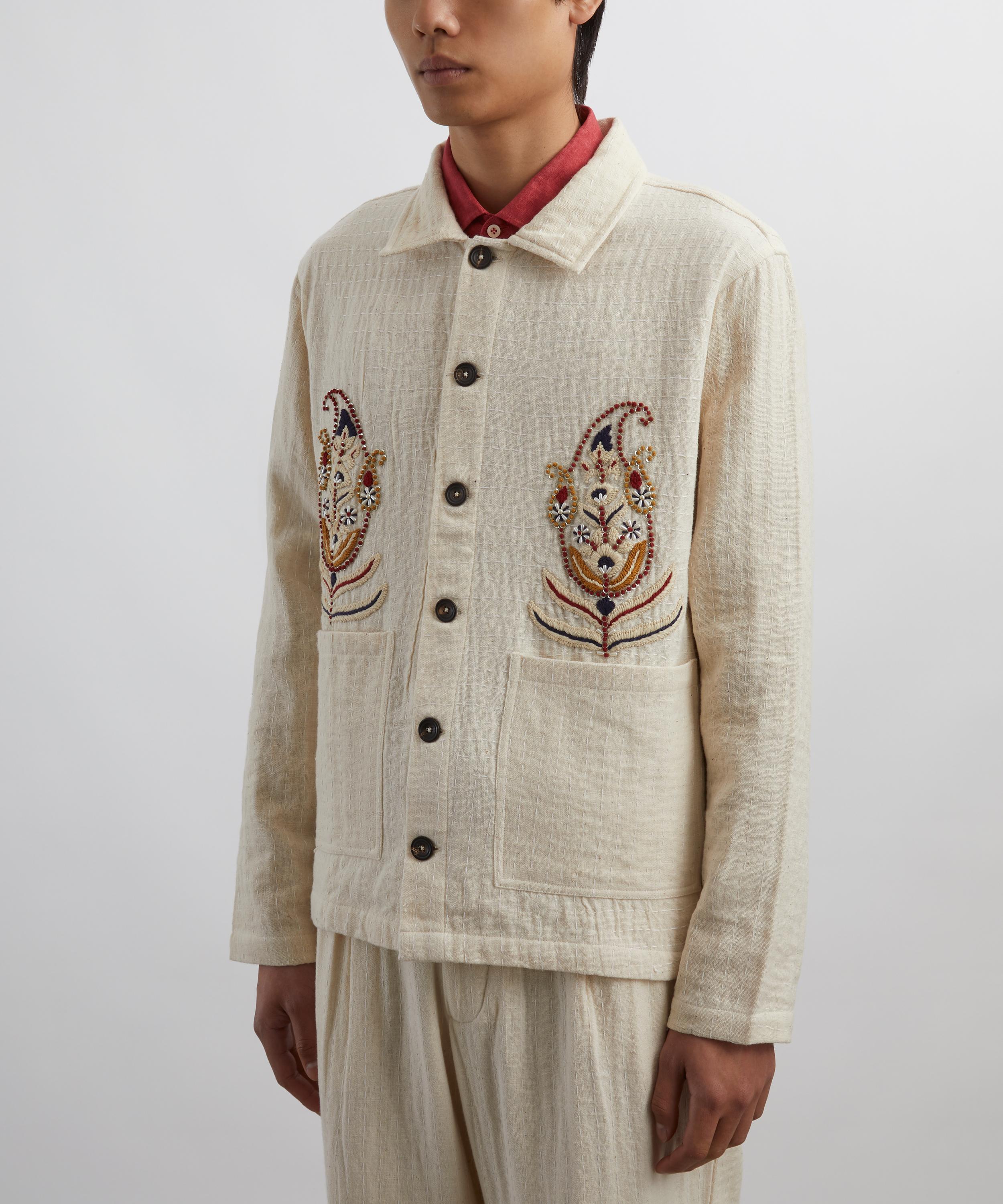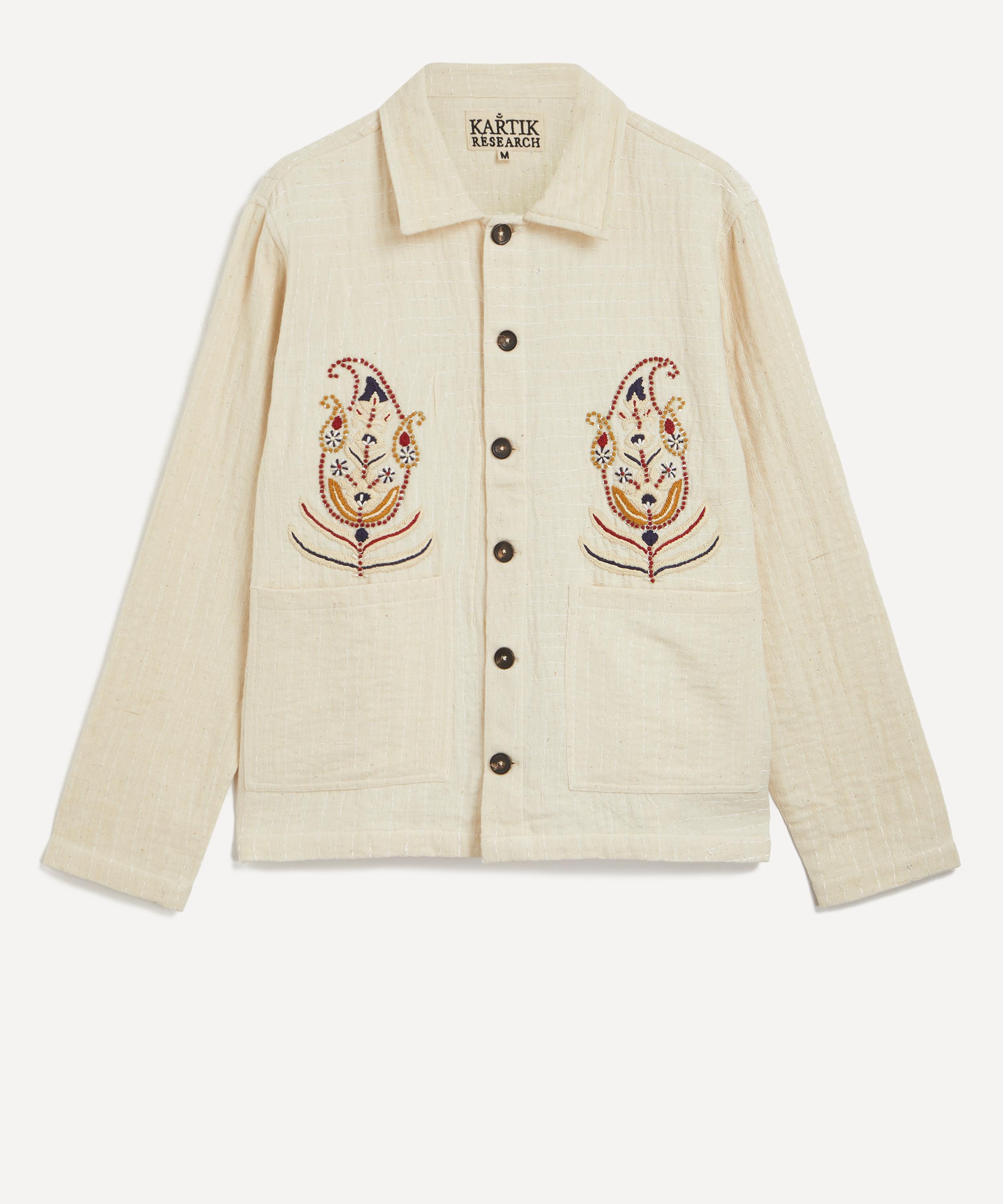 Exclusively made for Liberty, this cropped cotton jacket is adorned all over with delicate kantha stitching and elevated with intricate Zardoni embroidery, adding a unique and artisanal touch. Patch pockets and a spread collar enhance the refined silhouette, making this piece a tailored essential that effortlessly blends craftsmanship with utilitarian style.