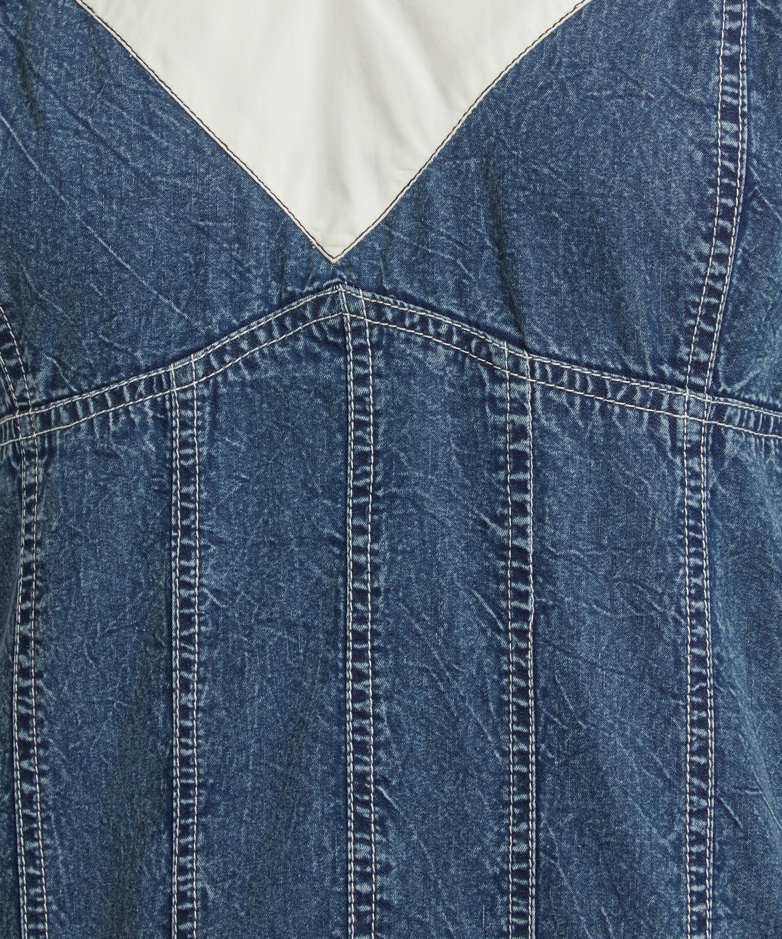 Update your eclectic wardrobe collection with Lovebirds’s playful Panelled Denim Midi Dress. Echoing a subtle vintage aesthetic, this dress is crafted from cotton denim, cut to a straight mid-length, featuring a panelled skirt and puff sleeves with cotton poplin panelling. Complete with two side slip pockets and a concealed zip fastening at the back, this dress is wearable for work, or weekends.
