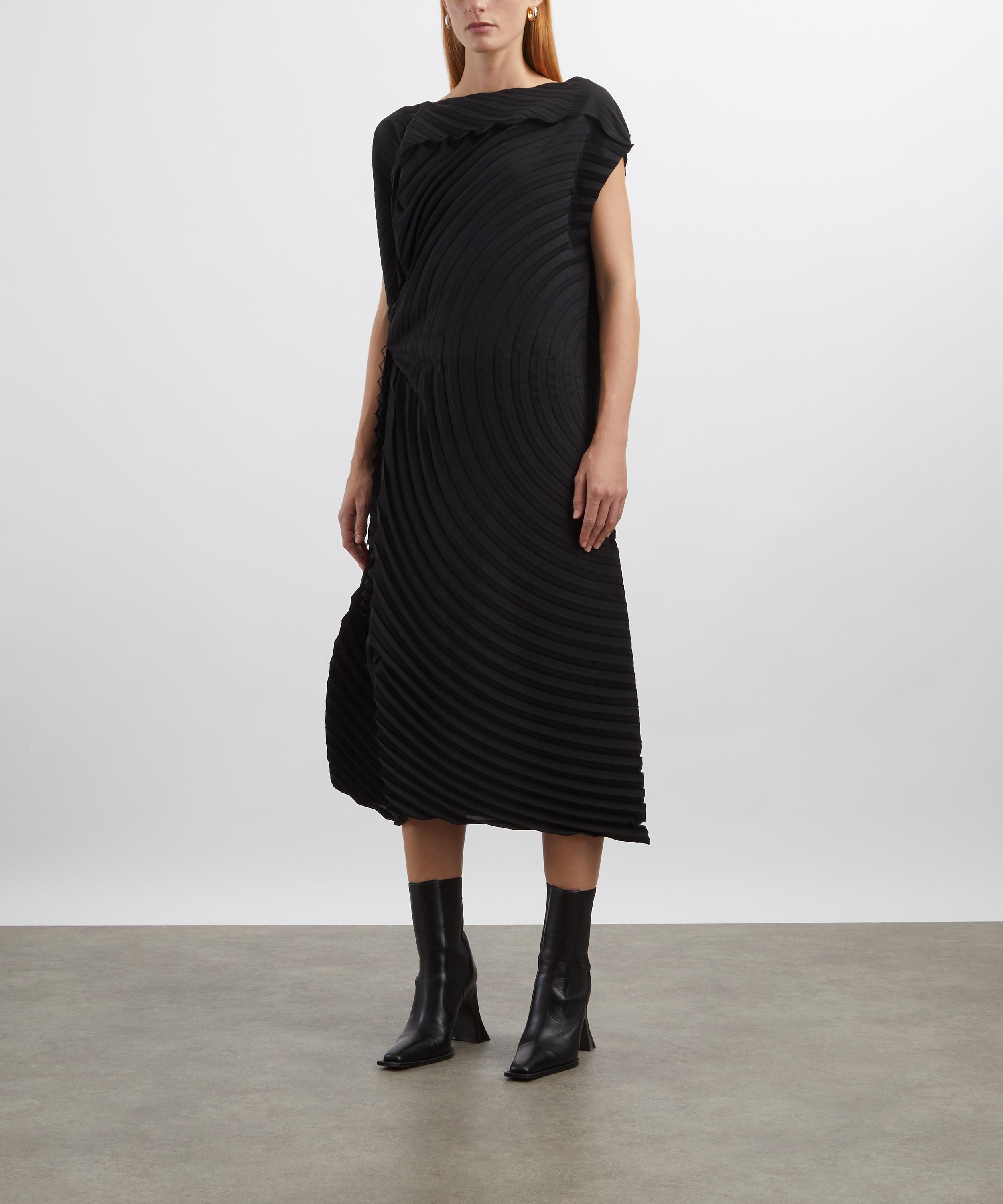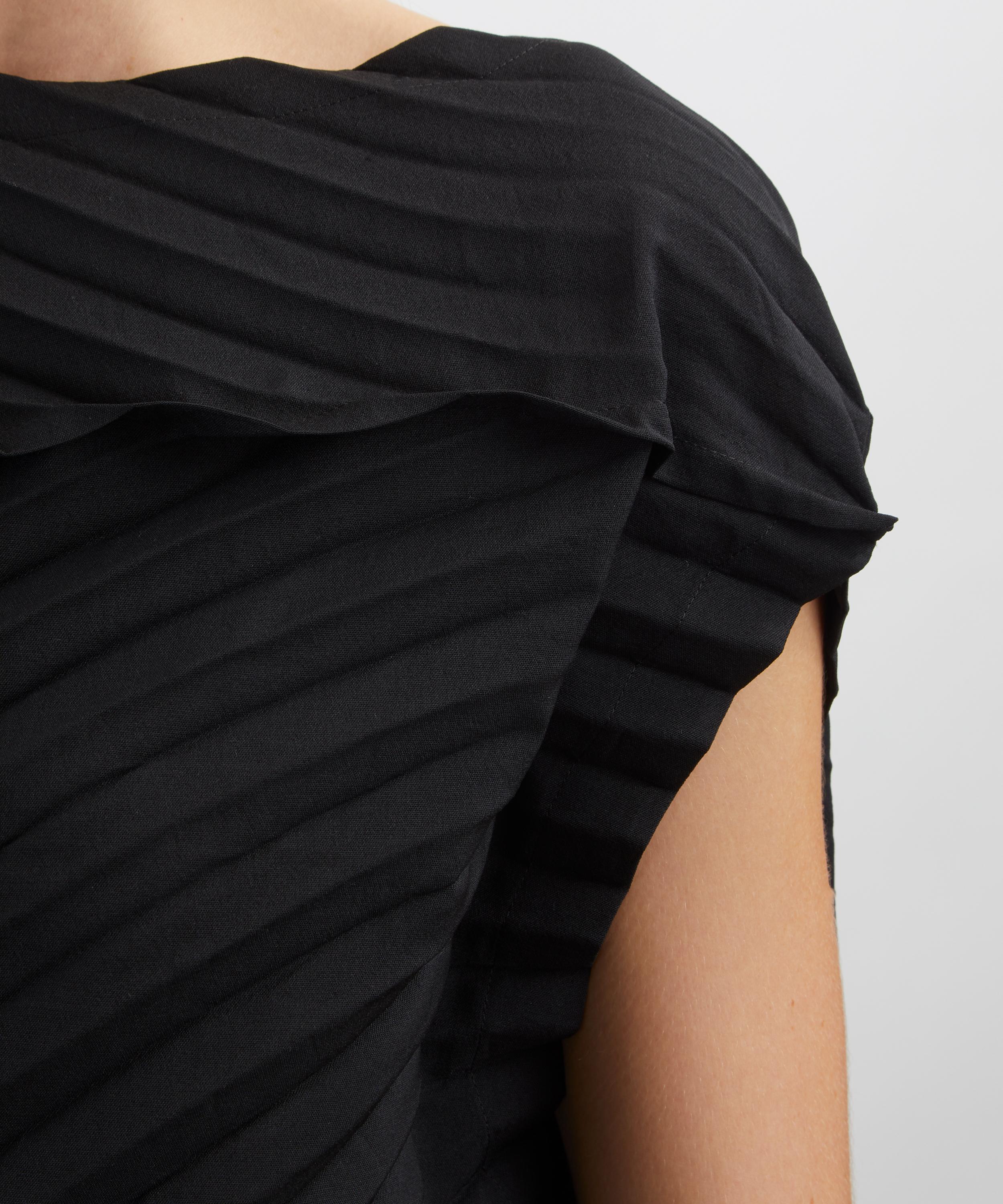 Crafted from lightweight, bouncy PAPER BAG PLEATS, this black midi dress features a boat neckline, cap sleeves, and a draped fold-over detail. Inspired by the shape of folded, gusseted paper bags, each piece is hand-shaped and pleated to create a bold, sculptural silhouette.