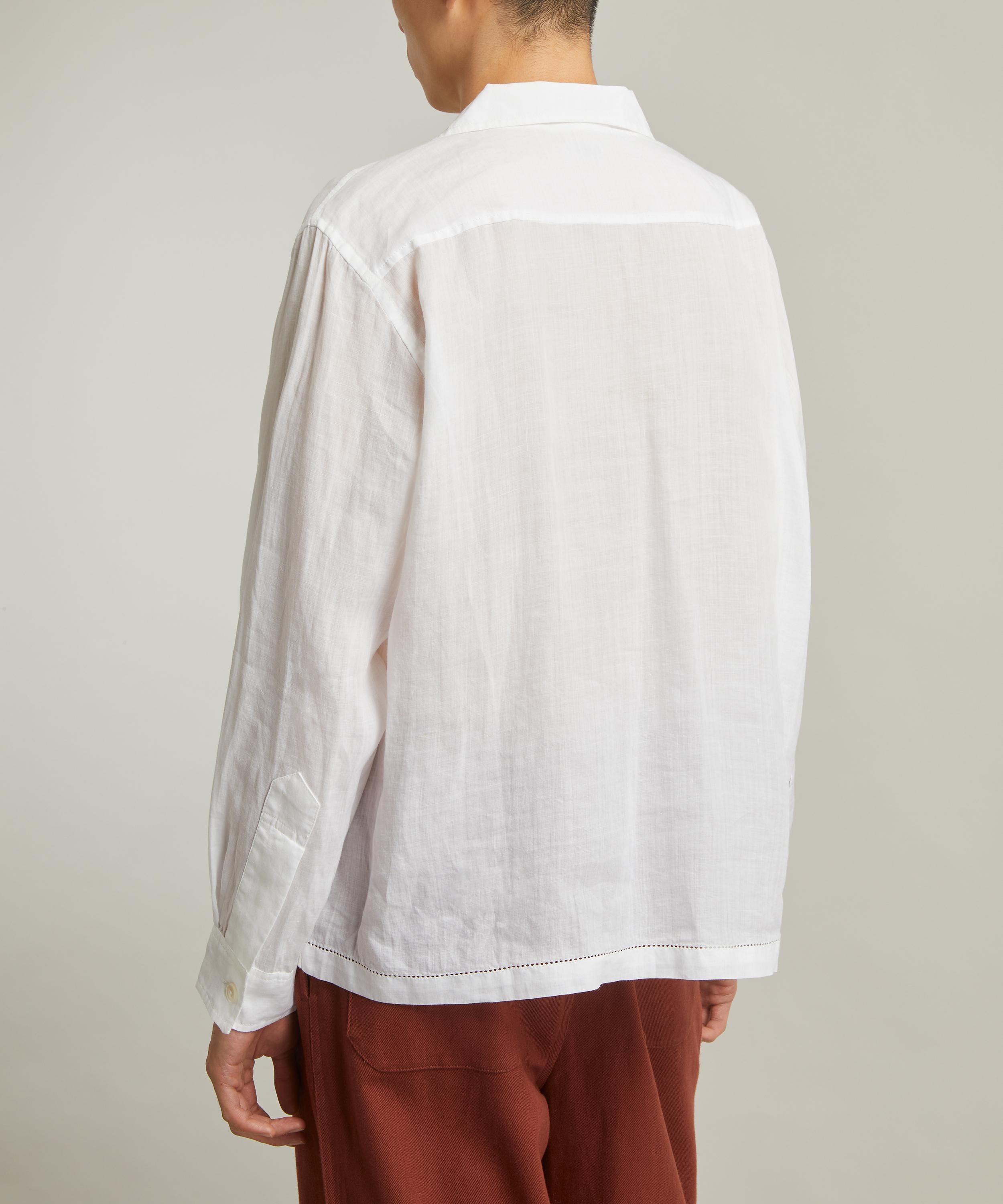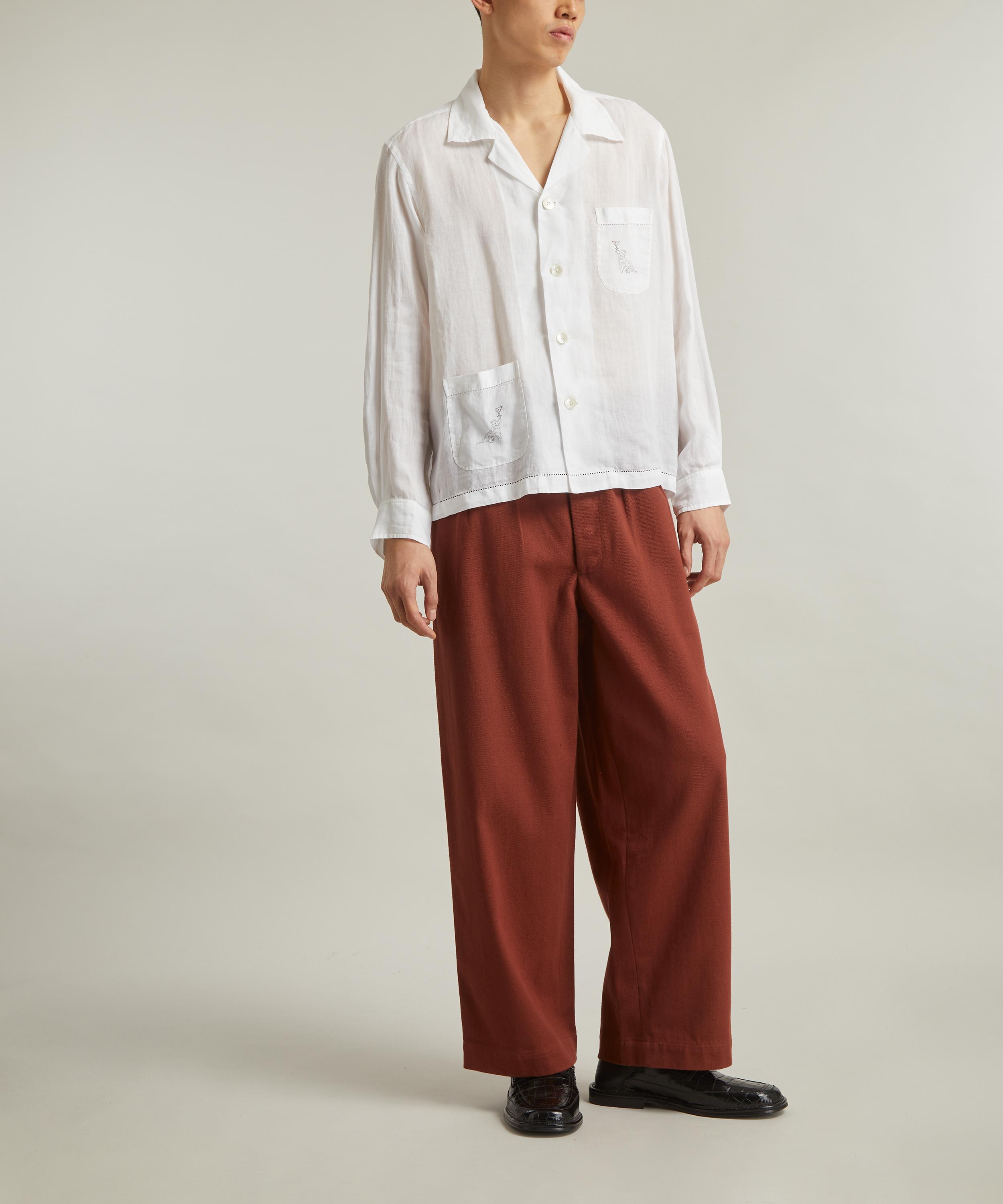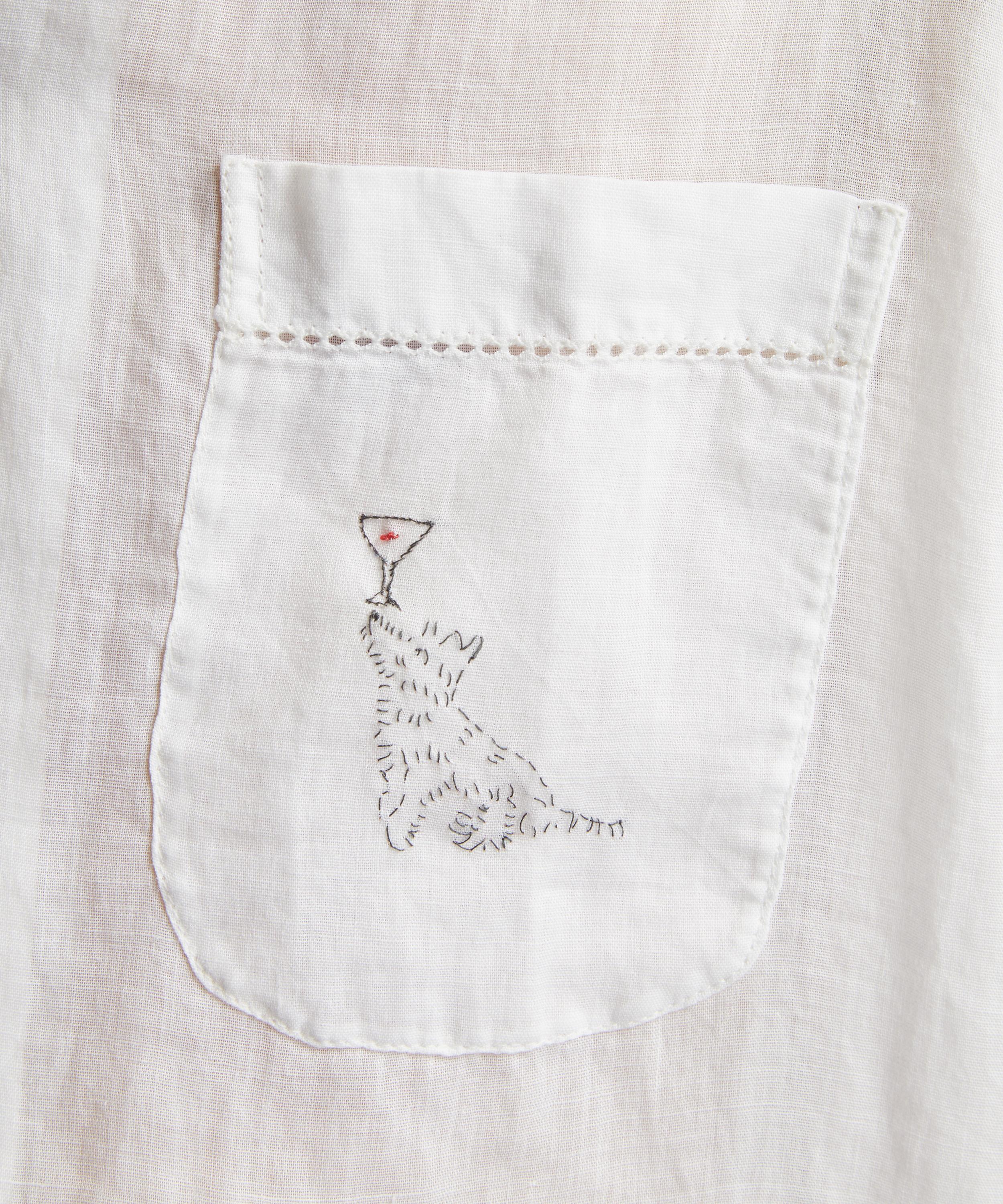 Inspired by an embroidered placemat from the 1960s-70s, the long sleeve cotton shirt is embroidered with a dog balancing a martini glass on both of its front patch pockets.
