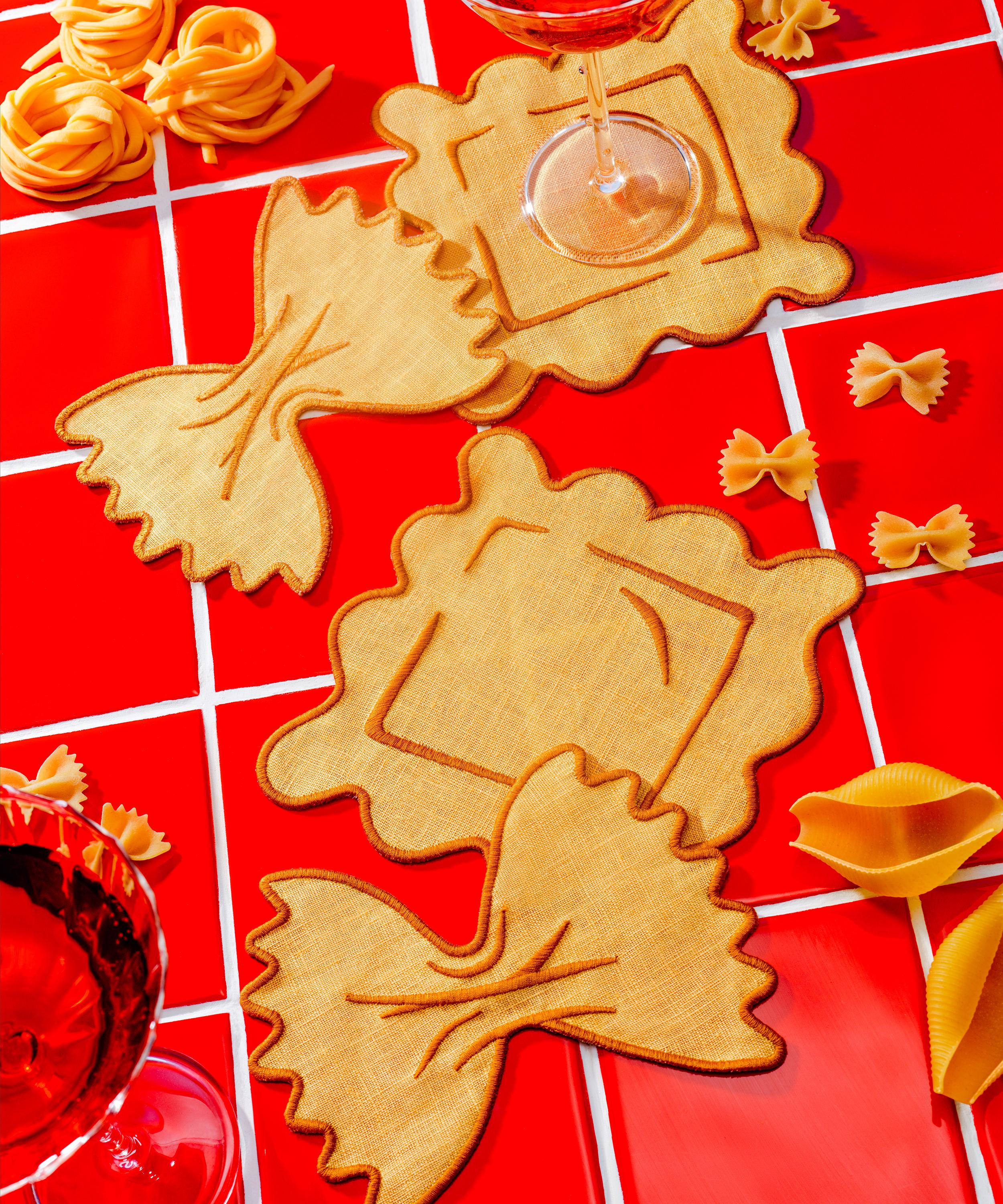 This set of four is crafted from airy linen and showcases embroidered ravioli and farfalle designs that lean into the brand’s signature blend of bold colour and sweet, playful pattern. The most stylish way to bring carbs to your brunches and lunches, they come in a flawlessly decorated box – perfect for thoughtful gifting.