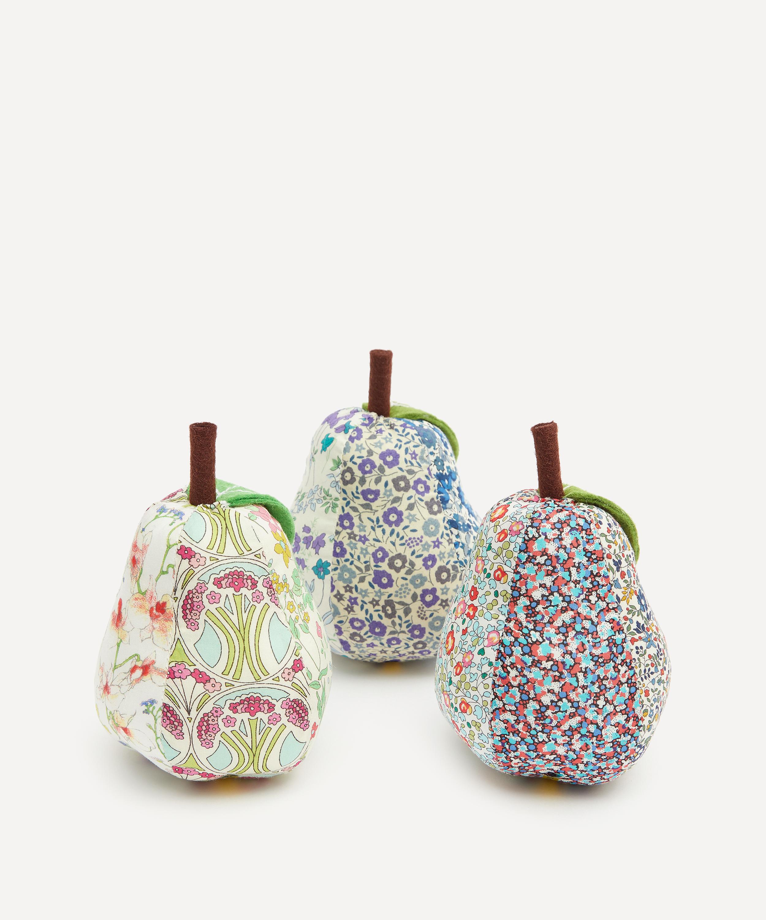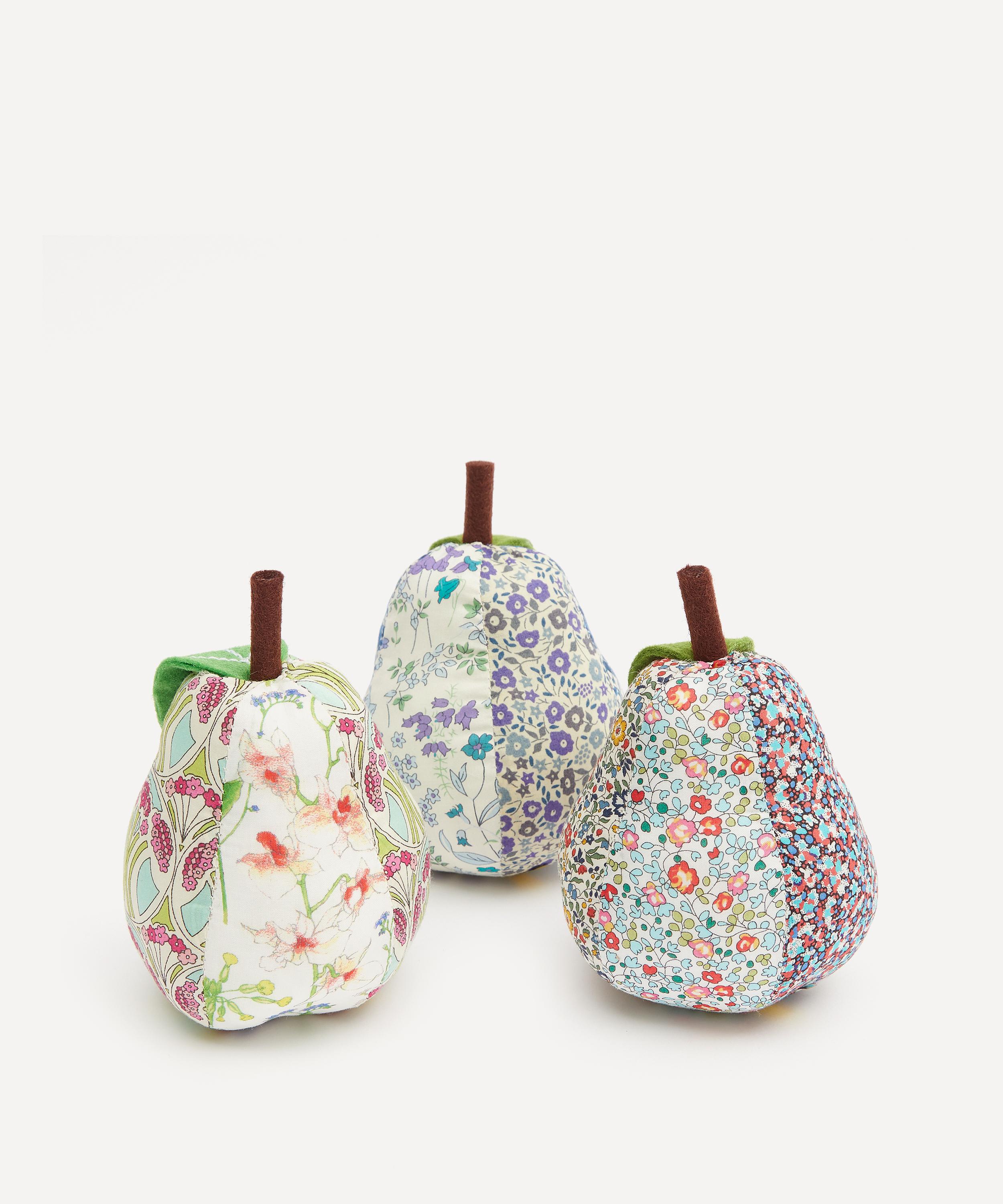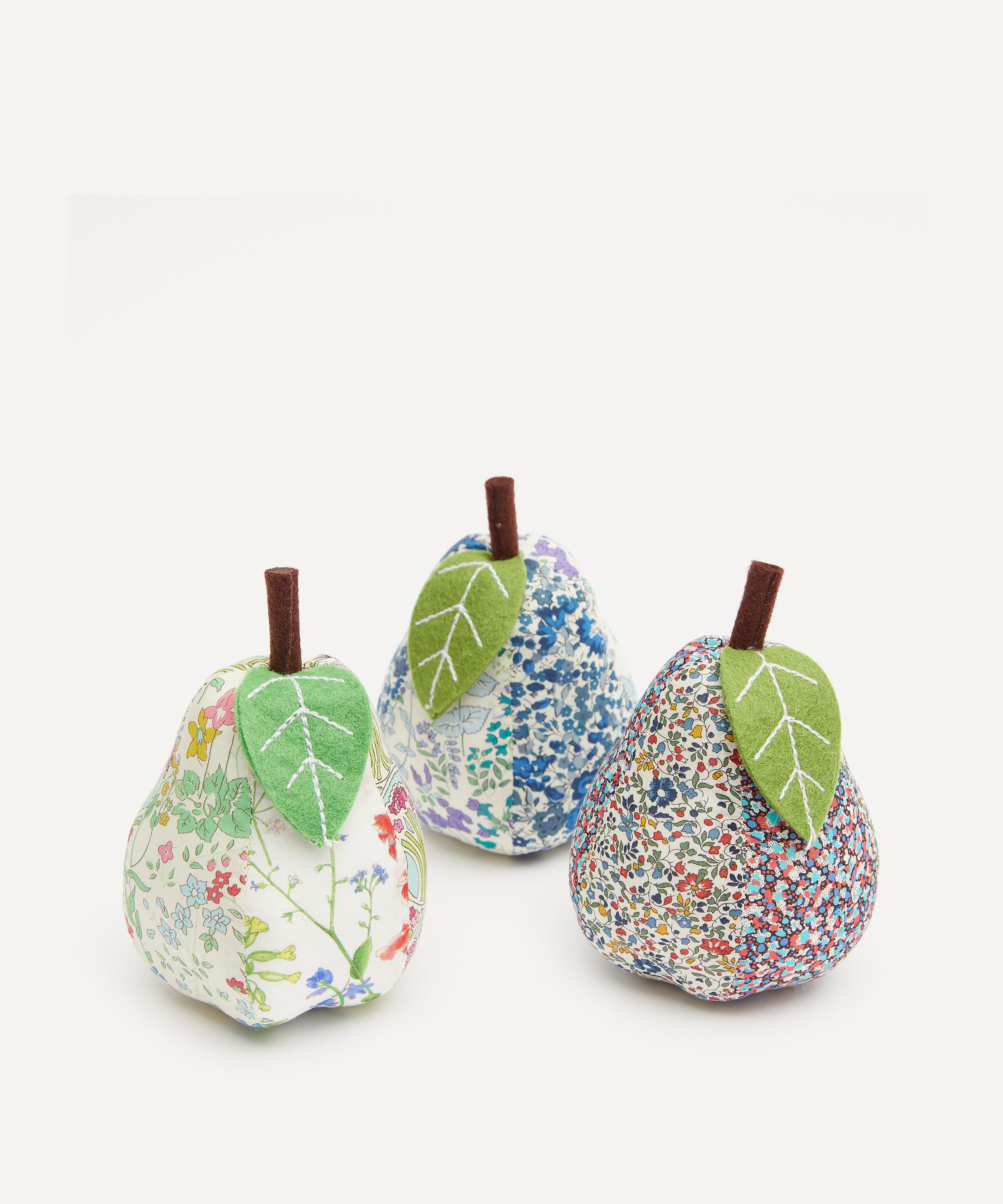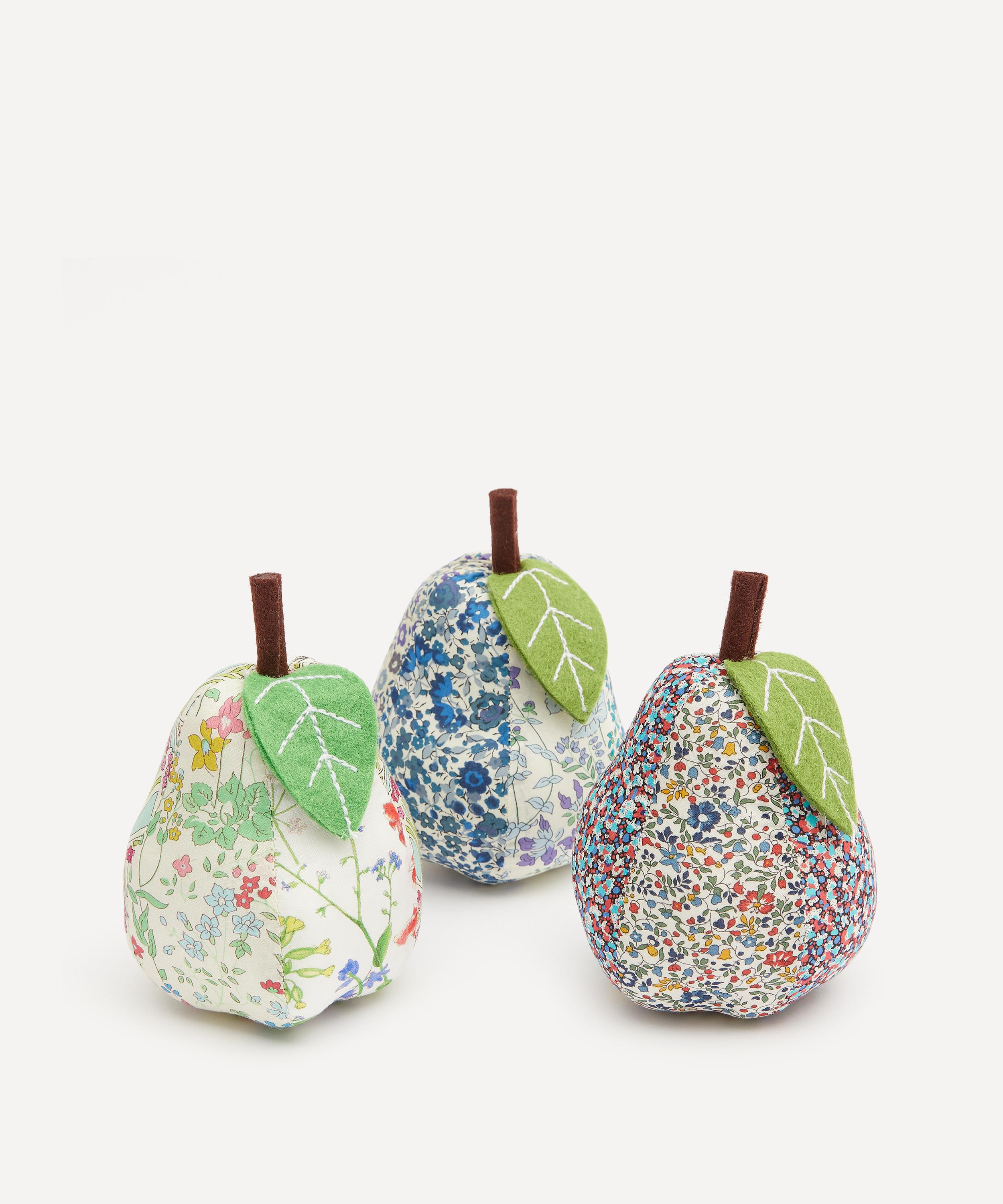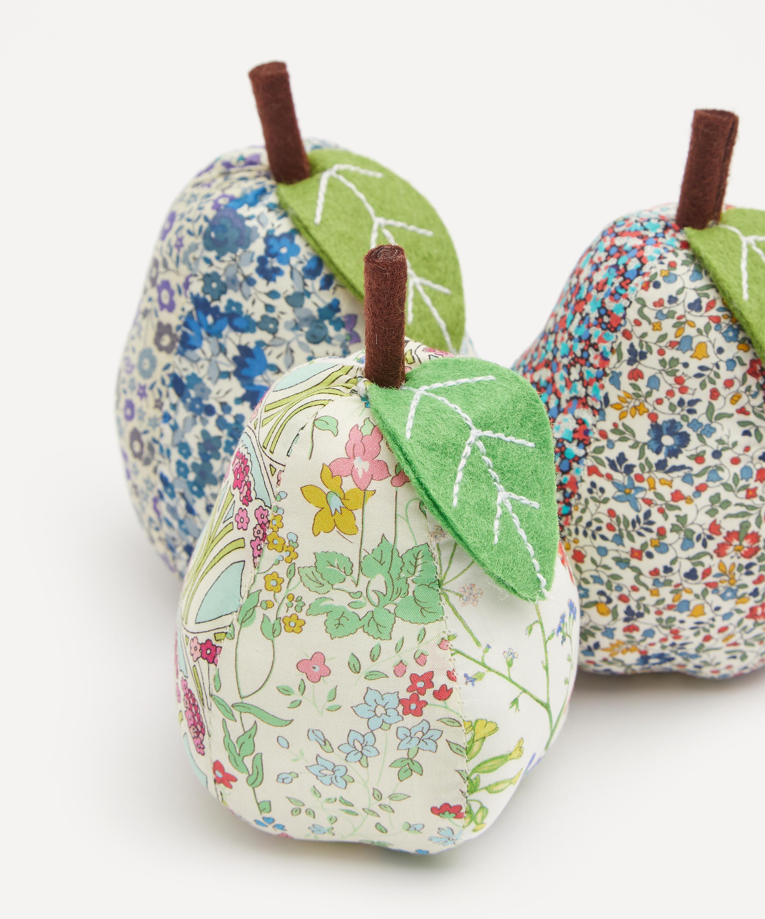 The pin cushion is covered in cotton, featuring an assortment of quintessential Liberty prints. Offering a way to keep from losing pins, needles and safety pins mid-project, this little pear makes a great gift for a crafty loved one, or a smart addition to your own haberdashery arsenal.