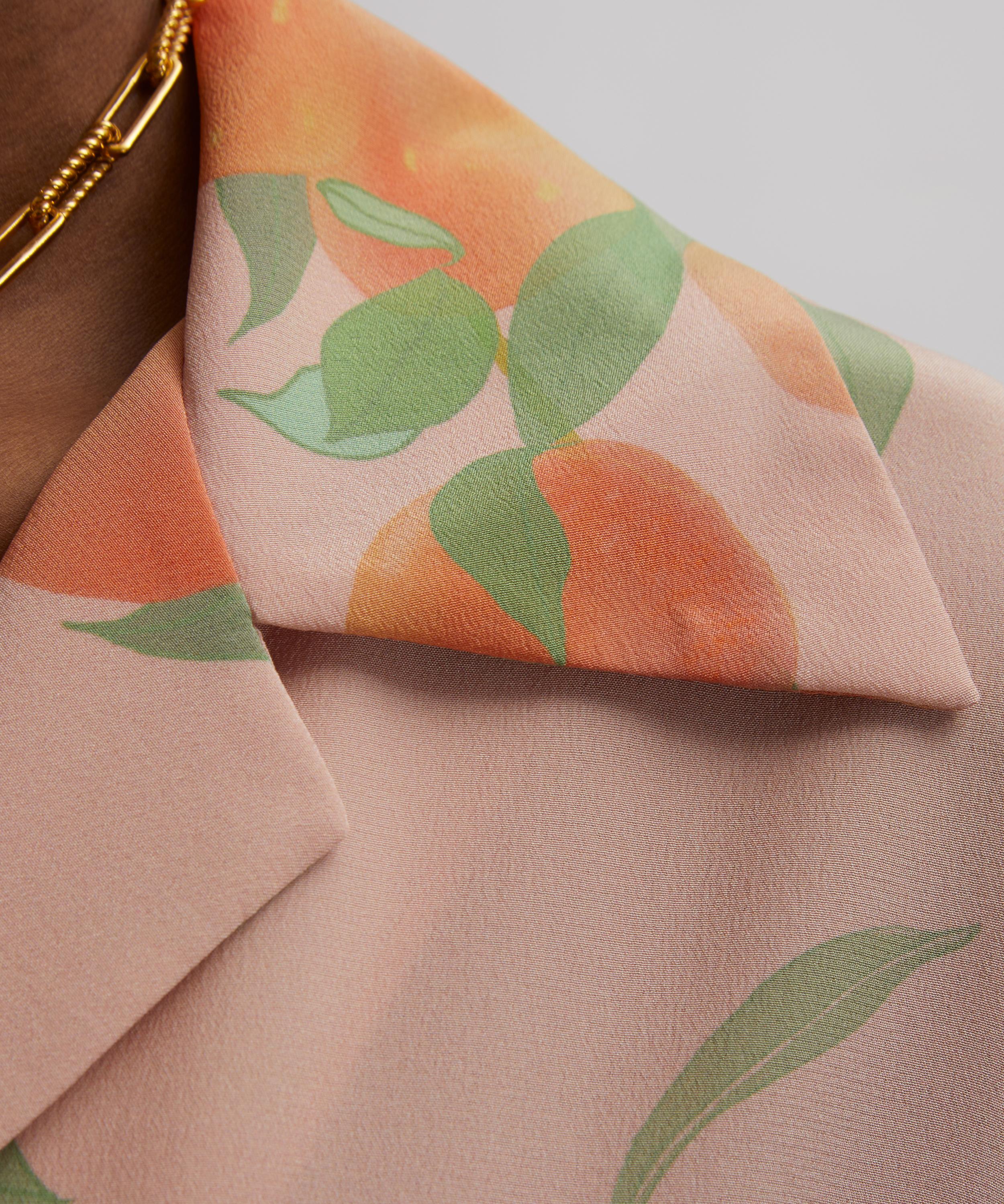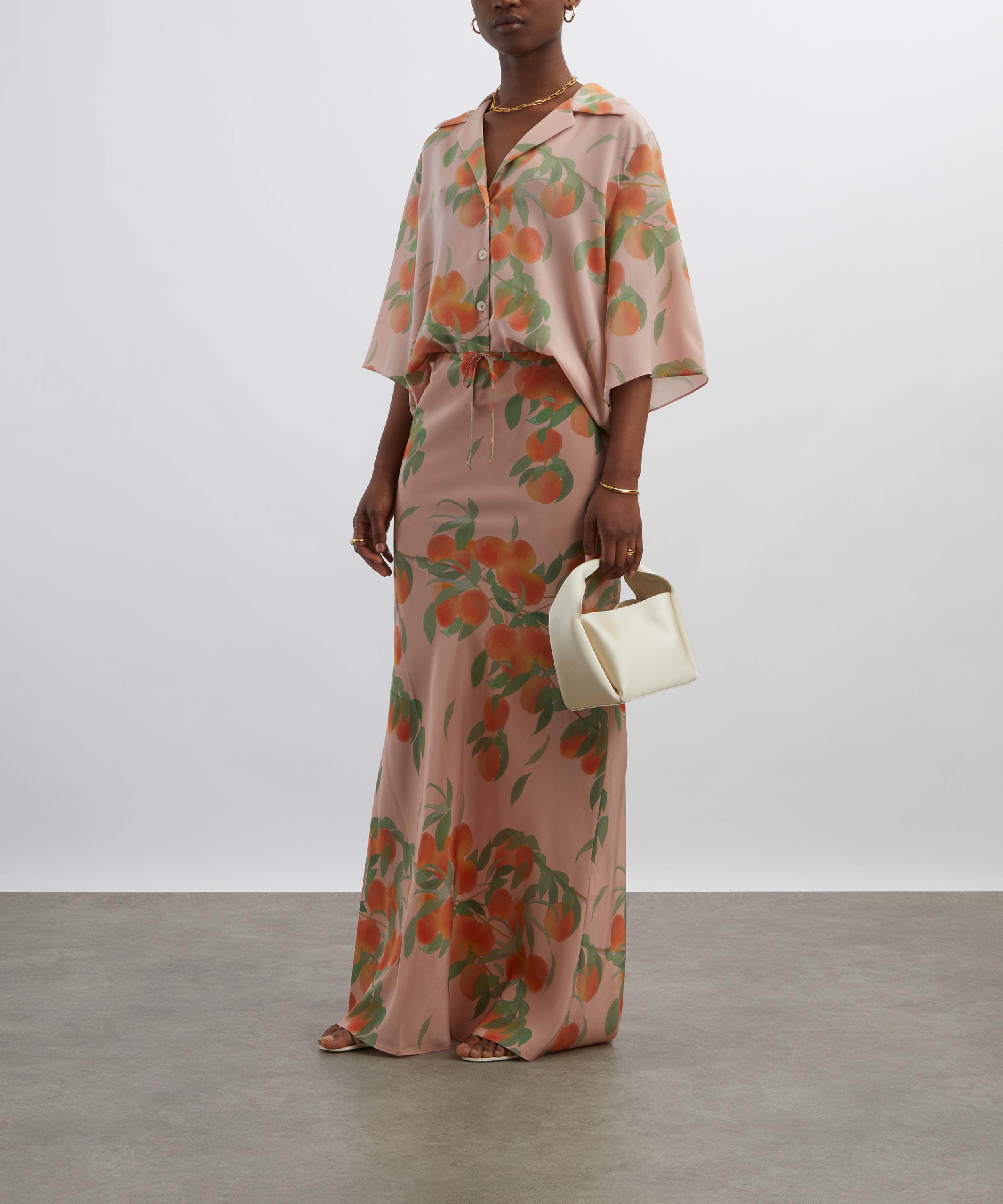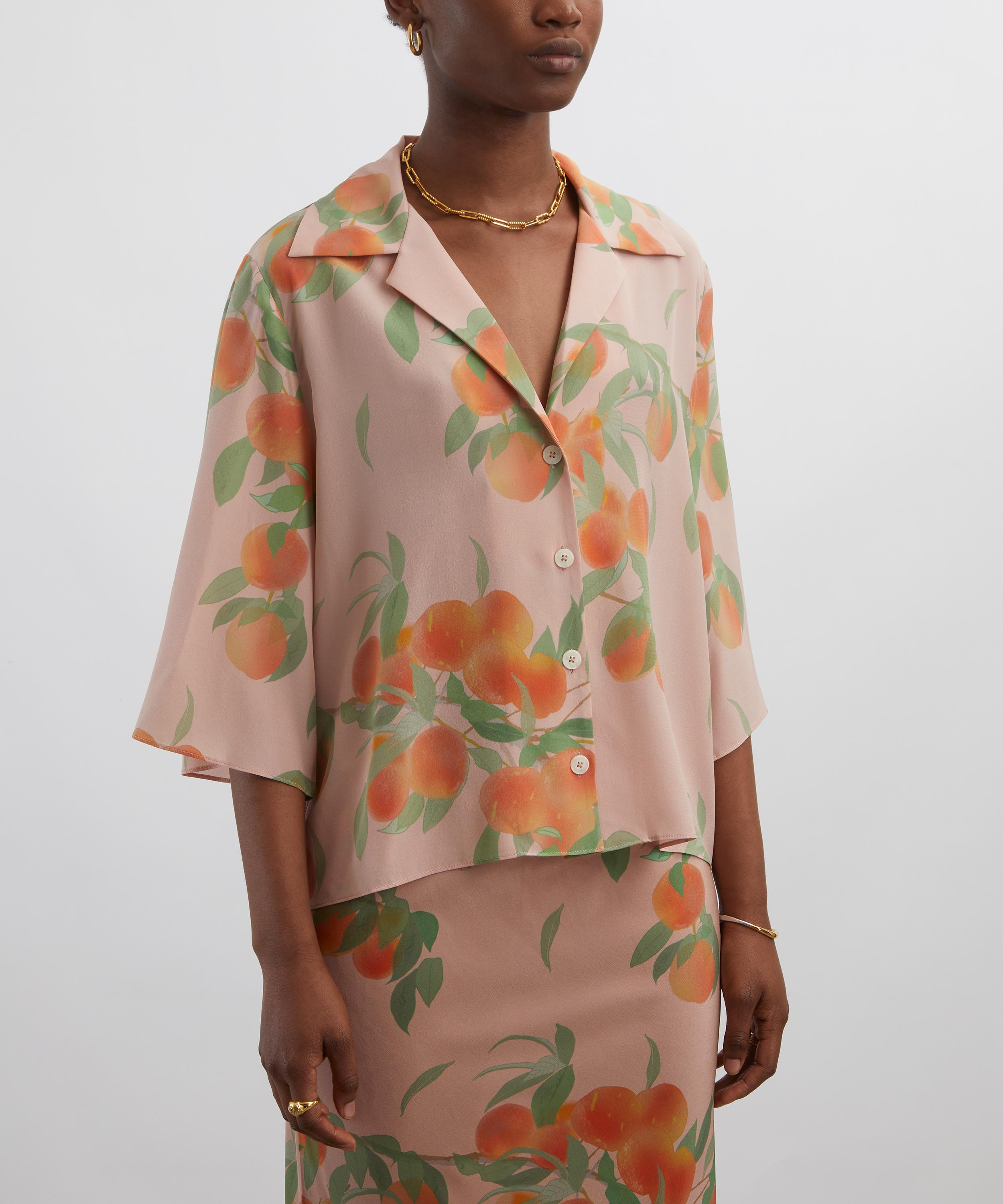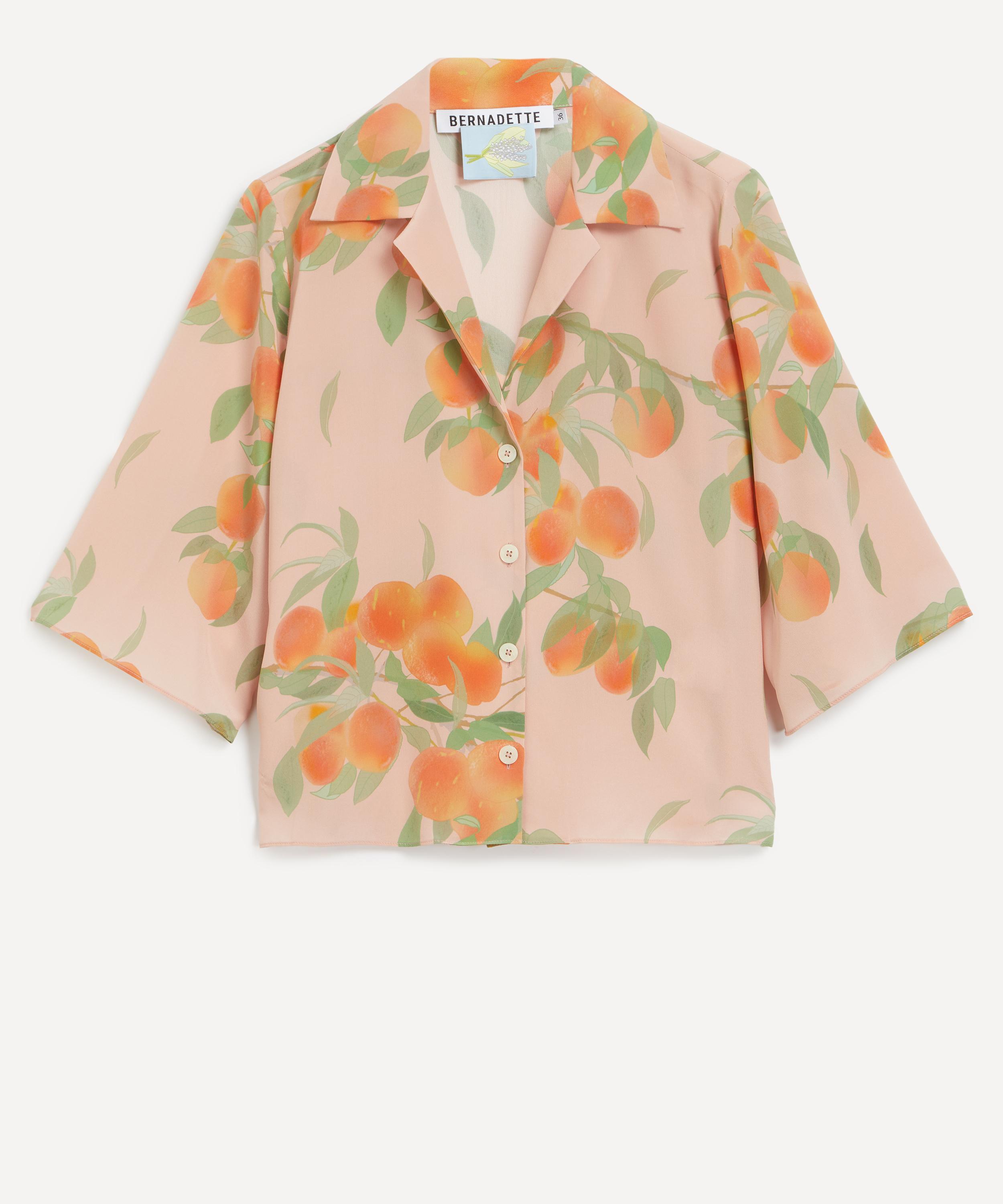 Adorned with this season’s Peachtree print, this oversized shirt features a polo neckline, three-quarter-length sleeves, and a placket secured with BERNADETTE branded buttons. Crafted from pure silk, it’s a must-have summer essential.