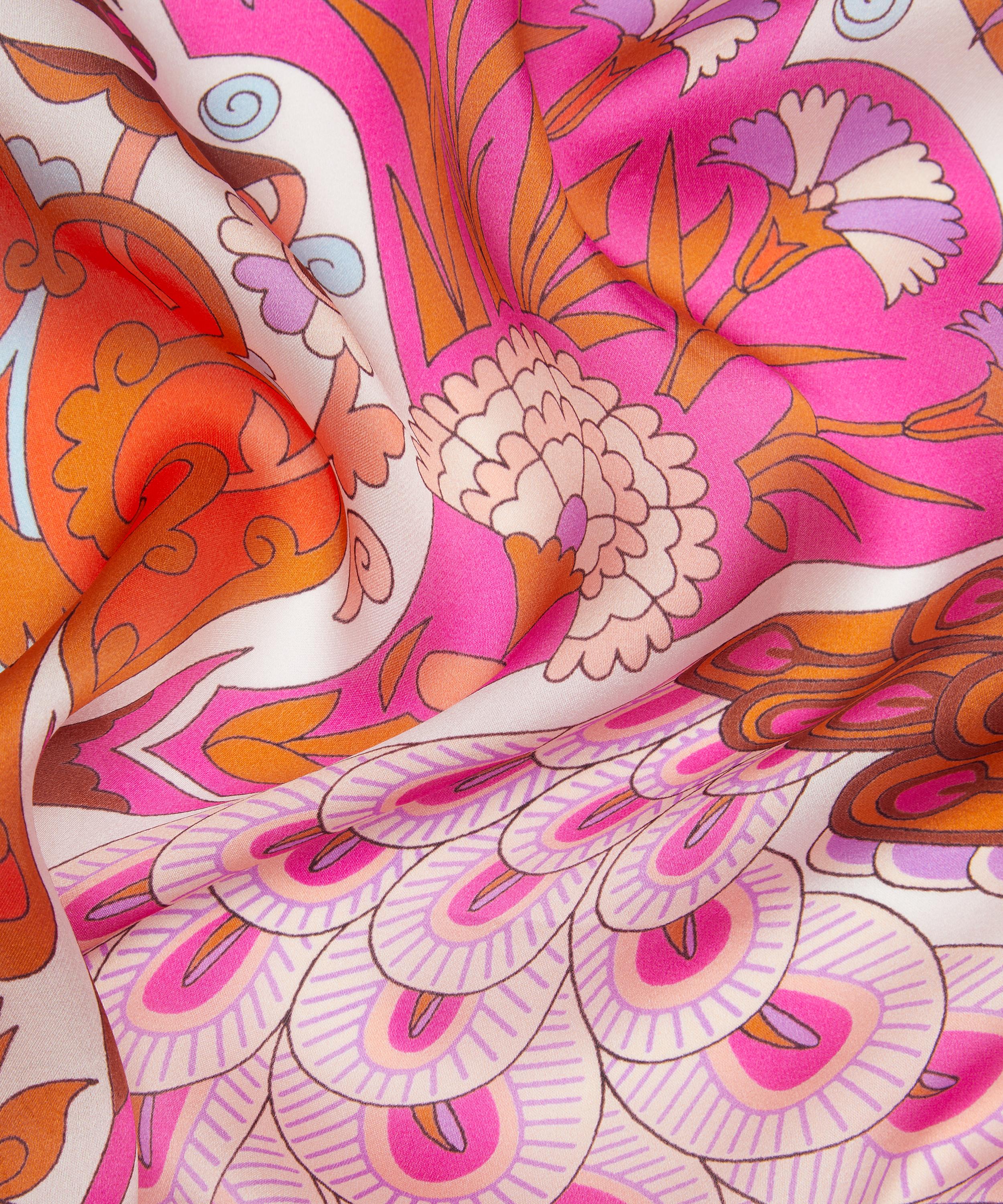Meticulously crafted in Italy from a luxurious and ultra-soft silk fabric, it’s characterised by our showstopping Peacock Fiesta print – featuring opulent peacocks, ornate vases, and luxurious, fan-shaped fronds. Designed to stand the test of time, this versatile accessory staple will breathe new life into your wardrobe with its rich colouration and texture. Try draping it over neutral outerwear for bold style statement, experiment with monochromatic looks, or knot it close to the neck to lock in warmth, the possibilities are endless.