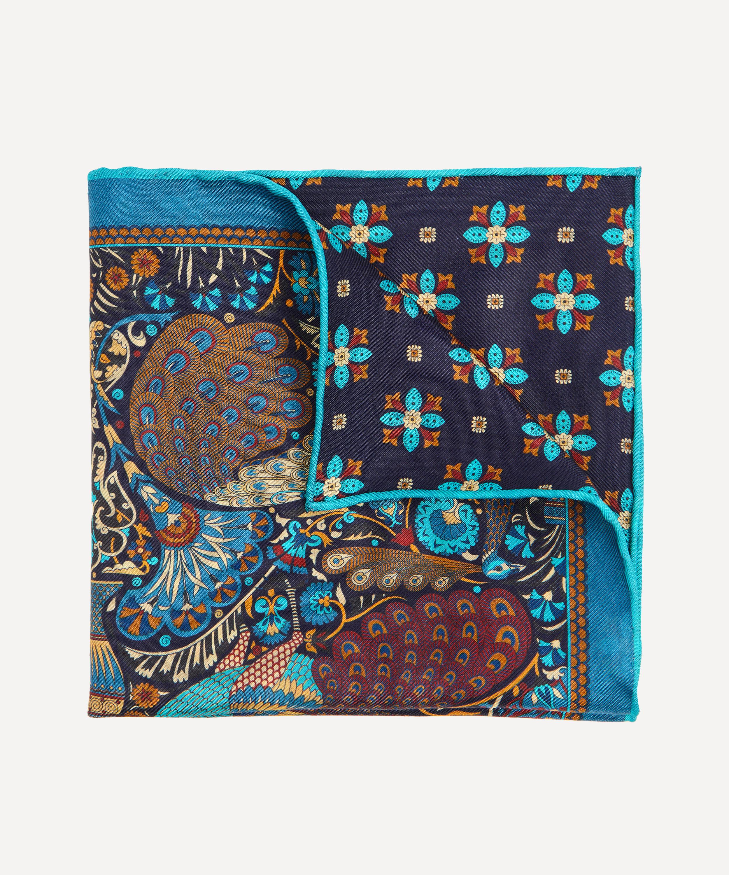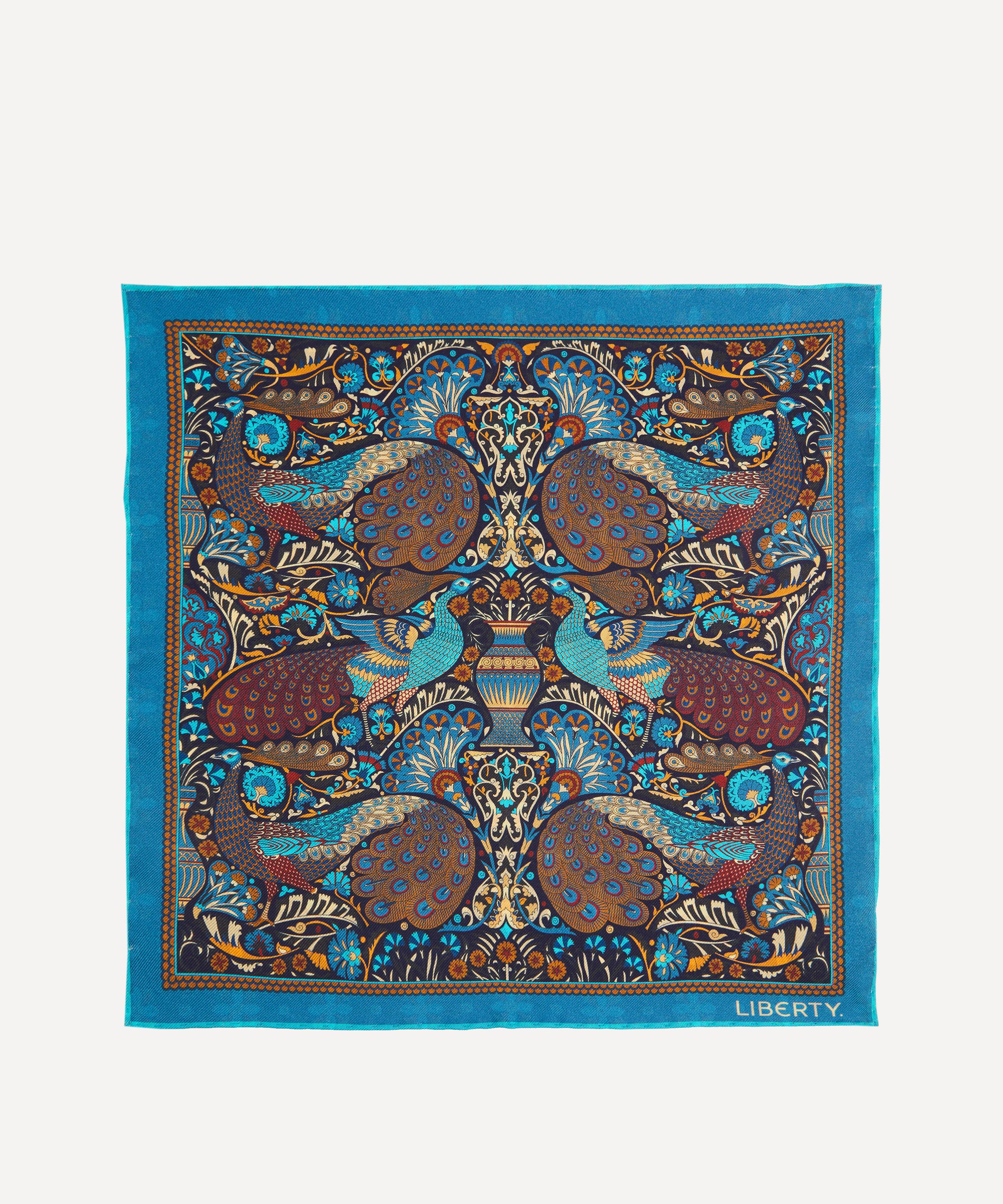 The Peacock Garden pocket square features an archival Liberty design, made and printed on silk by experts in England – a celebration of our long-standing love affair with British talent and style.