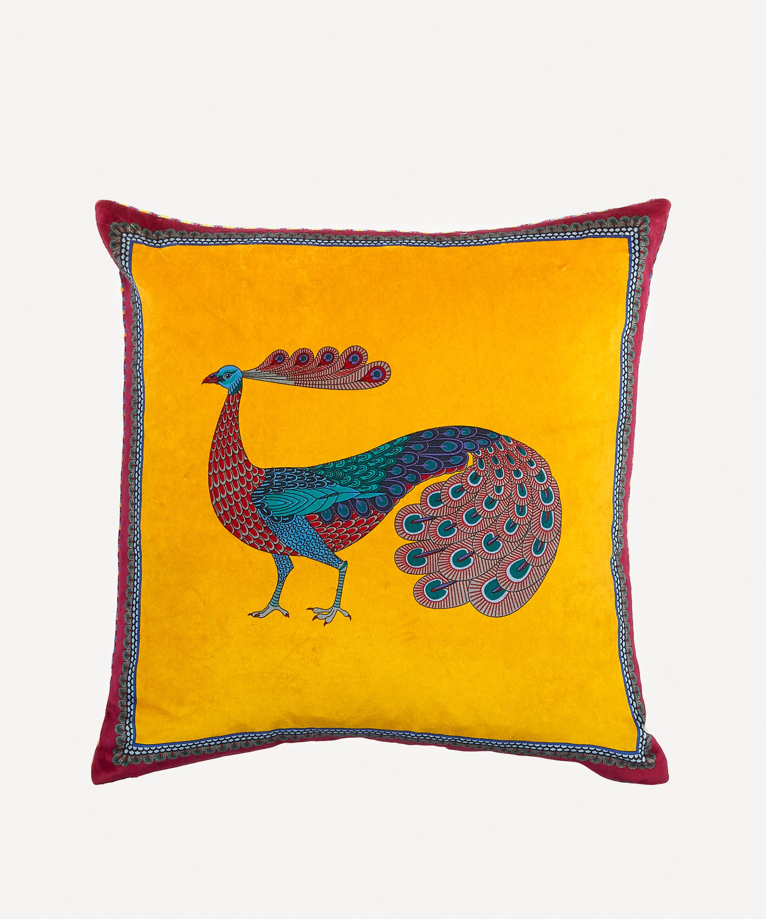 With its vibrant pattern and plump velvety form, the Peacock Garden cushion elevates a snug living space to elegant new heights. Dating back to 1990, Peacock Garden is a classic Liberty scarf design that was originally based upon an intricate tile mosaic by William de Morgan, where flowers and peacocks intertwine in an Oriental conversational design. This updated version centres on a single peacock in full profile, with a minutely detailed border that emphasises the design’s ornate decorative flourishes. Use the cushion to punctuate a favourite armchair or reading nook, for irresistibly cosy appeal.