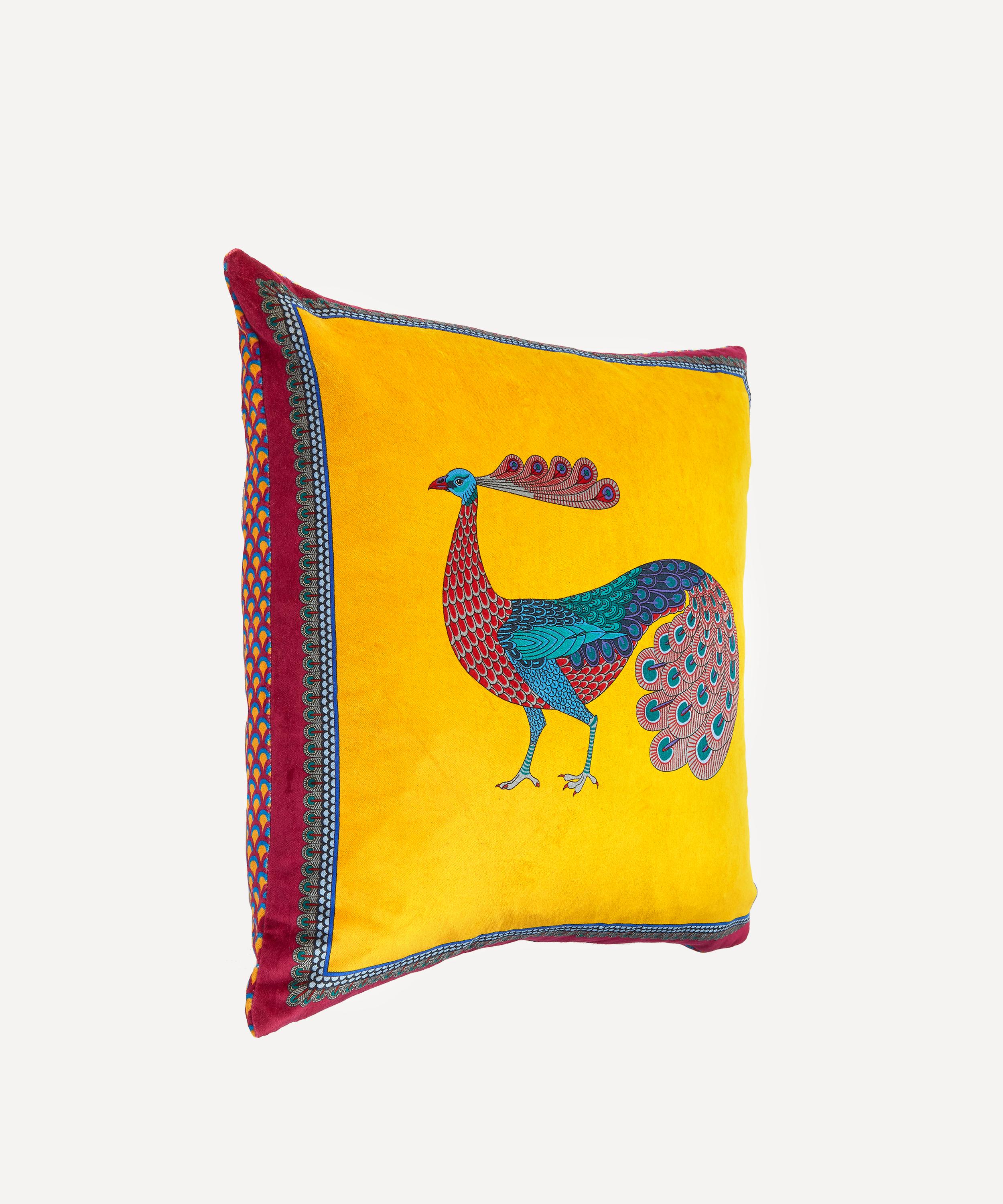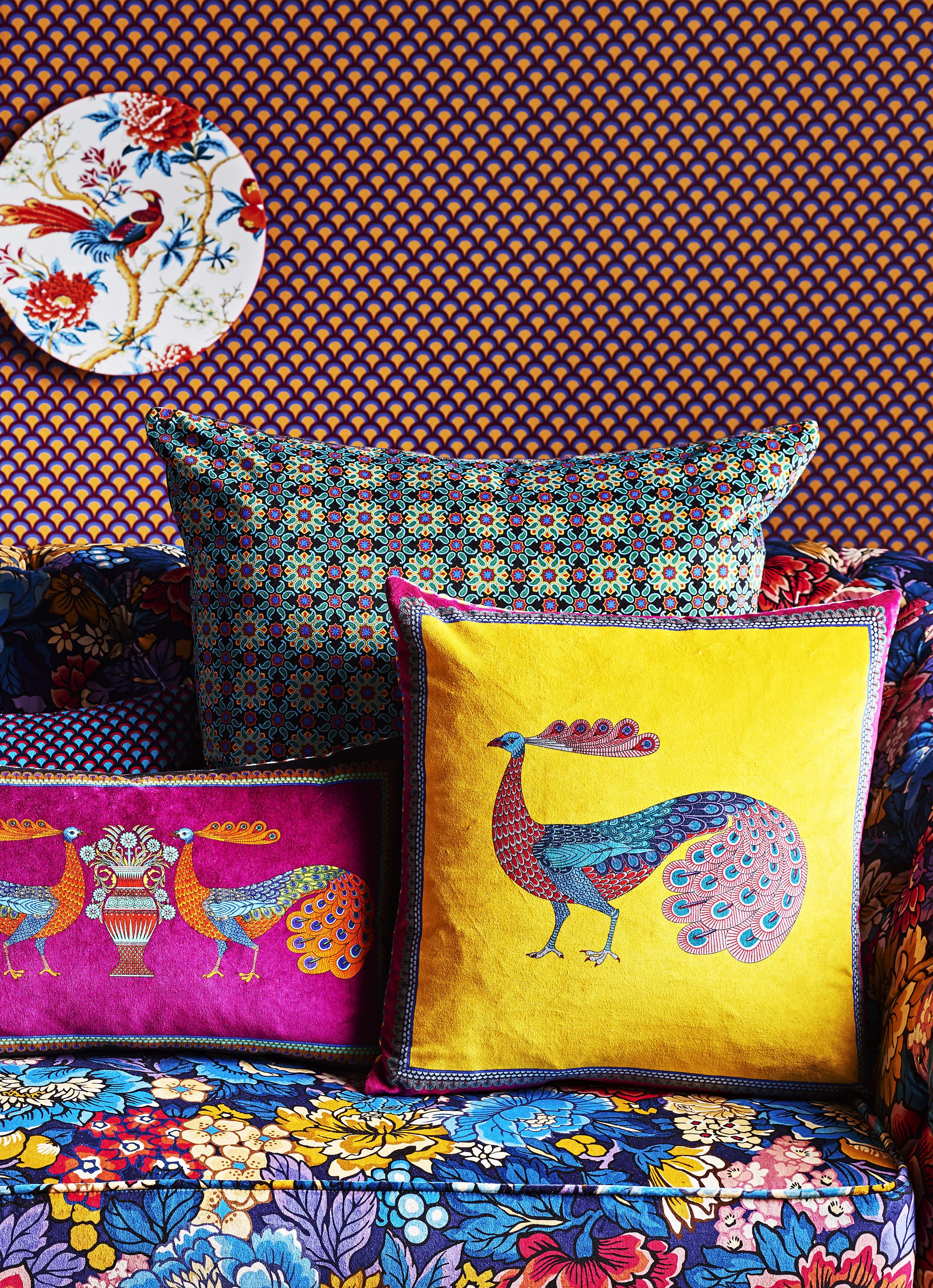 The Liberty Peacock Garden printed velvet cushion adds a decadently soft accent to home interiors.