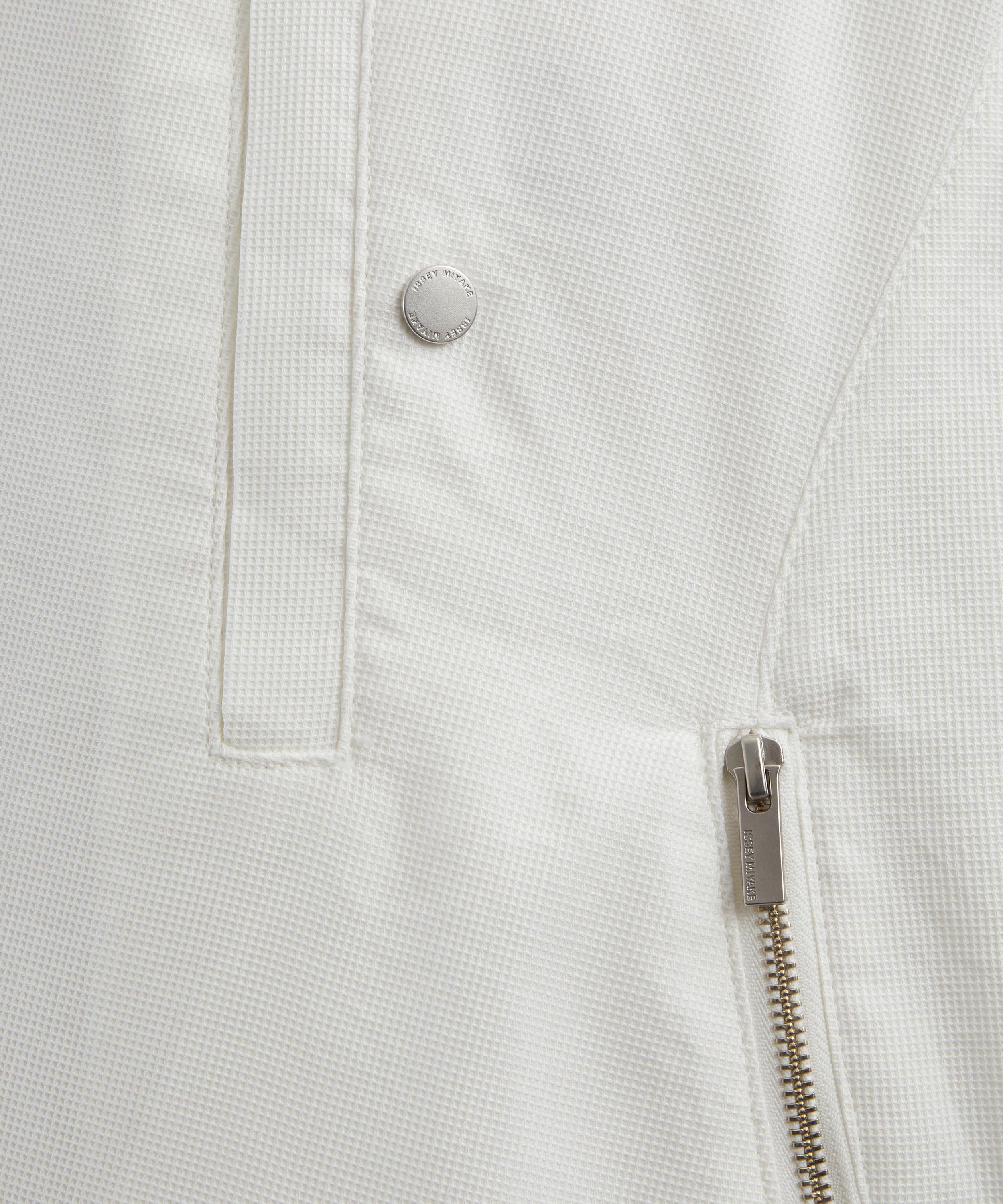 From the PEEKABO collection, which highlights garments with unexpected design details, this long, voluminous coat is made from a waffle-textured polyester and linen blend. It features a zippered high collar that unveils a large unfolding yoke, along with raglan sleeves and multiple functional pockets for a utilitarian feel.