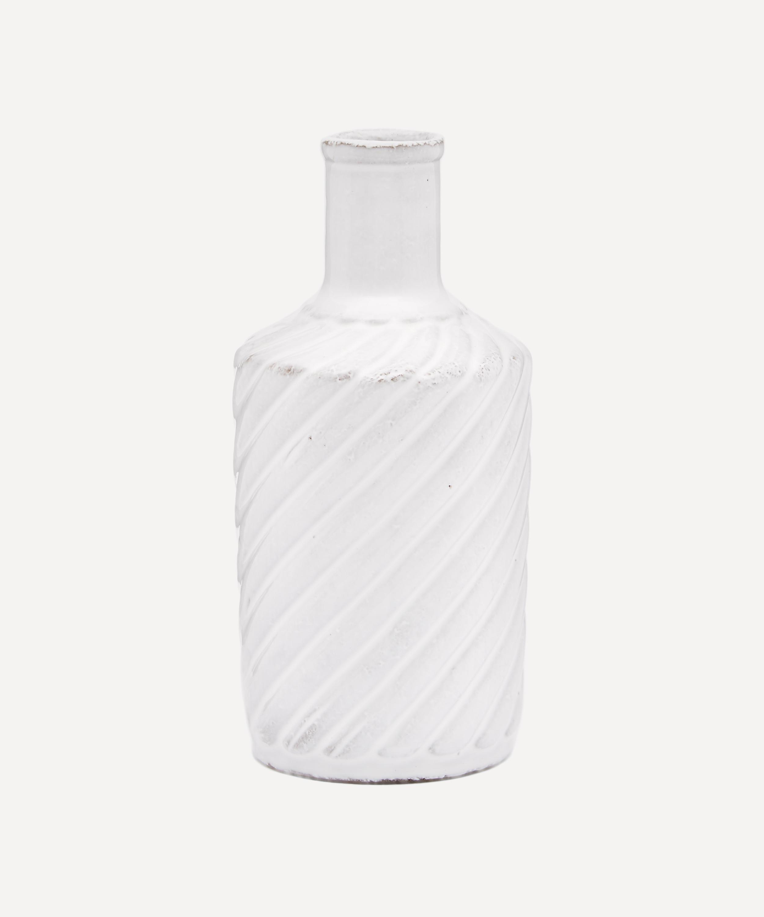 Votary of pre-industrial fabrication, Astier de Villatte is celebrated for being the one and only studio in Paris to hold and harbour the traditions of artisanal ceramic production. Restoring the ancestral systems of moulding and stamping, the Peggy vase is made using techniques from the Middle Ages which involve moulding a sheet of handmade clay, double firing the ‘biscuit’ piece and glazing the product in white enamel – a lengthy process that requires a drying time of up to one month. Characterised by its twisted, rippled exterior and thin lip, the bottle-shaped vase is engraved with the brand’s signature crest - depicting an interlacing A & V - alongside the initials of one of the 40 master artisans who created it. Each handmade piece tells a beautiful story, it romances and imparts a sense of nostalgia into its owner. Use this perfectly imperfect vase to display tall fronds.