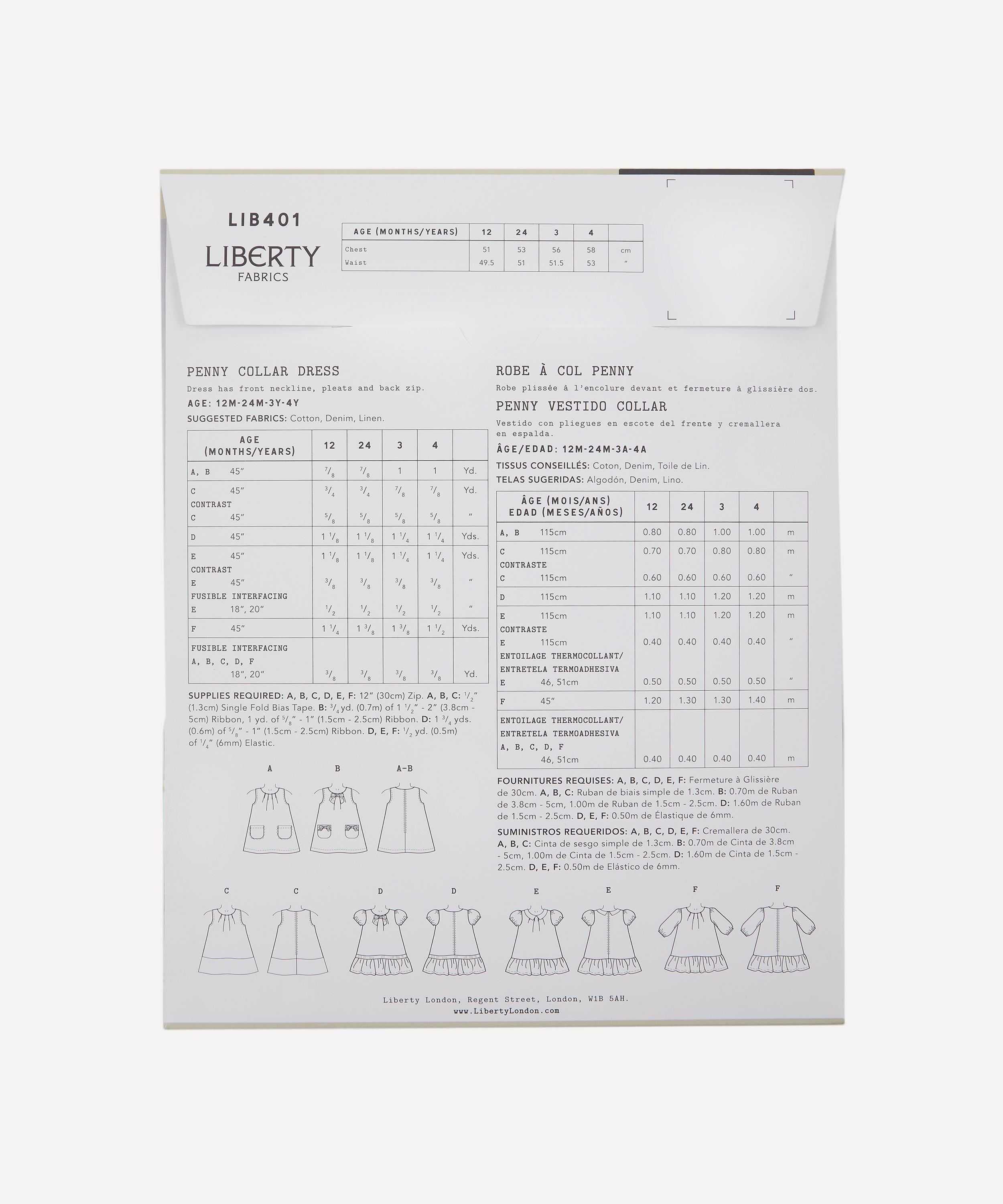 The new Liberty Fabrics dressmaking patterns draw inspiration from our fashion archive, with contemporary style details offering a fresh twist on classic vintage shapes. The Penny Collar Dress creates a loose, ruffled shape finished with puff sleeves and a flat collar option – a comfortable and cool design that’s perfect for playing. Make this Liberty pattern with linen, denim or Tana Lawn™ cotton, for ages 12 months to 4 years.