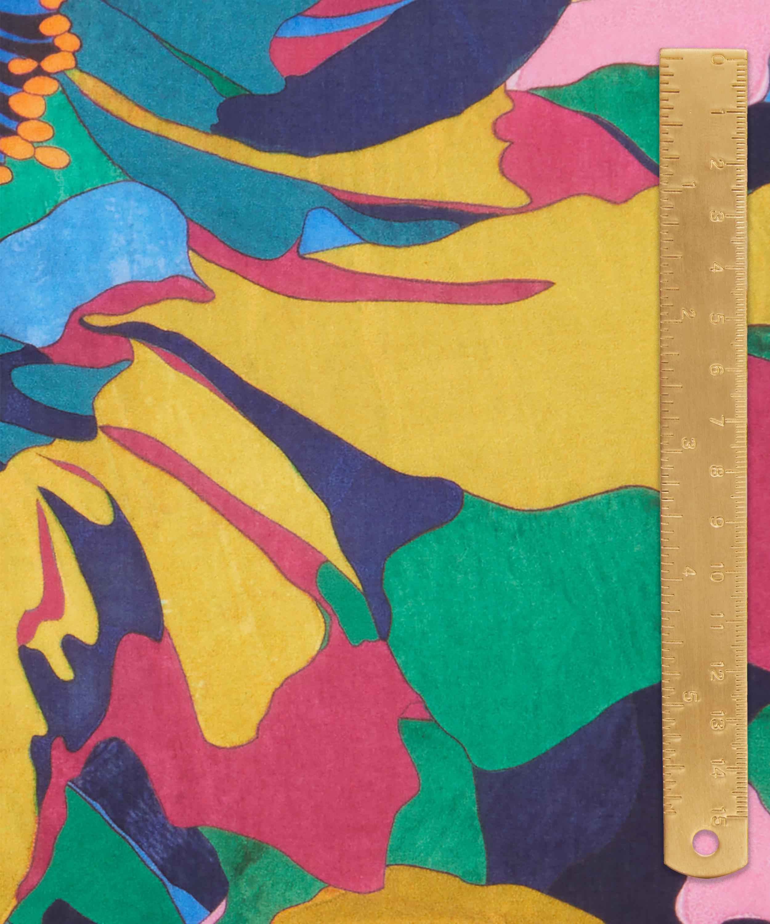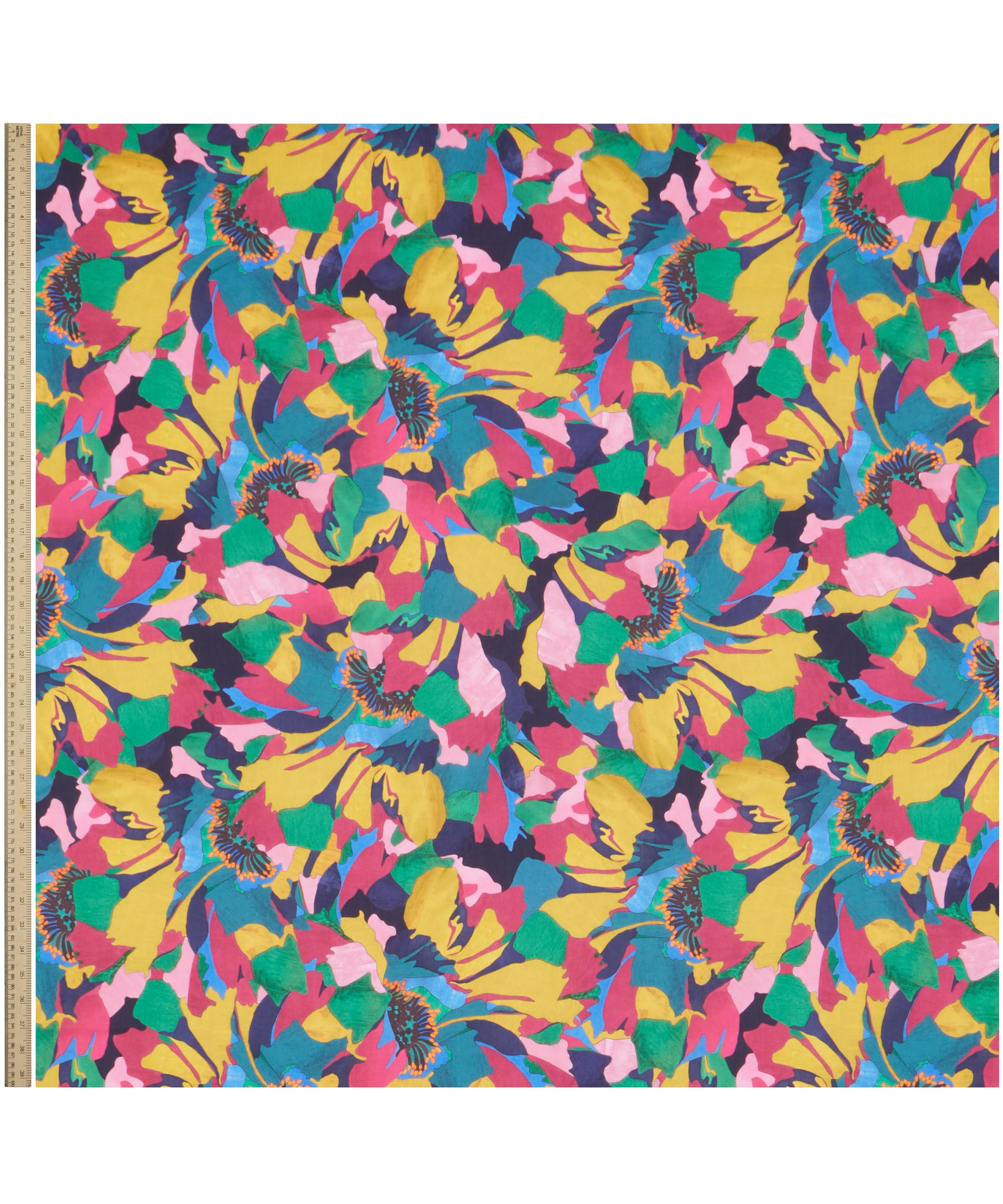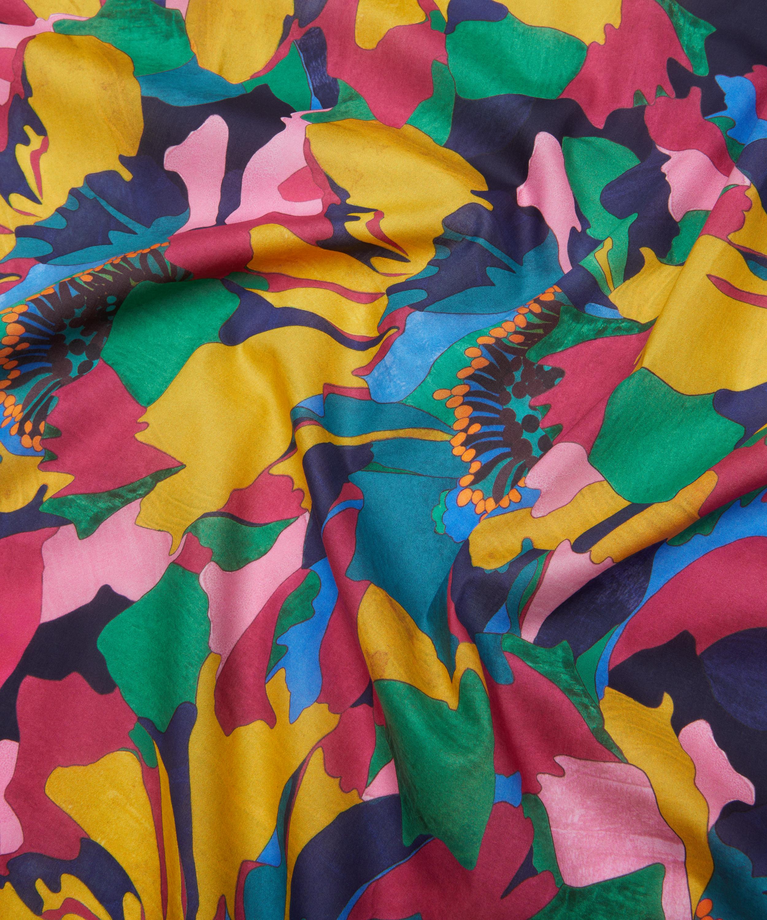 Exploring the flower as a vehicle for abstraction, this striking block coloured design was originally printed as a Liberty scarf in 1968. Dramatically cropped and zoomed-in, monumental peony petals create symphonies of contour and texture by revealing a fluid camouflage pattern. This print is part of the Floral Focus narrative of the AW24 collection – inspired by countless artists who have attempted to tame their unruly blooms through the genre of still life, this series is a true celebration of organic forms and flourishes.