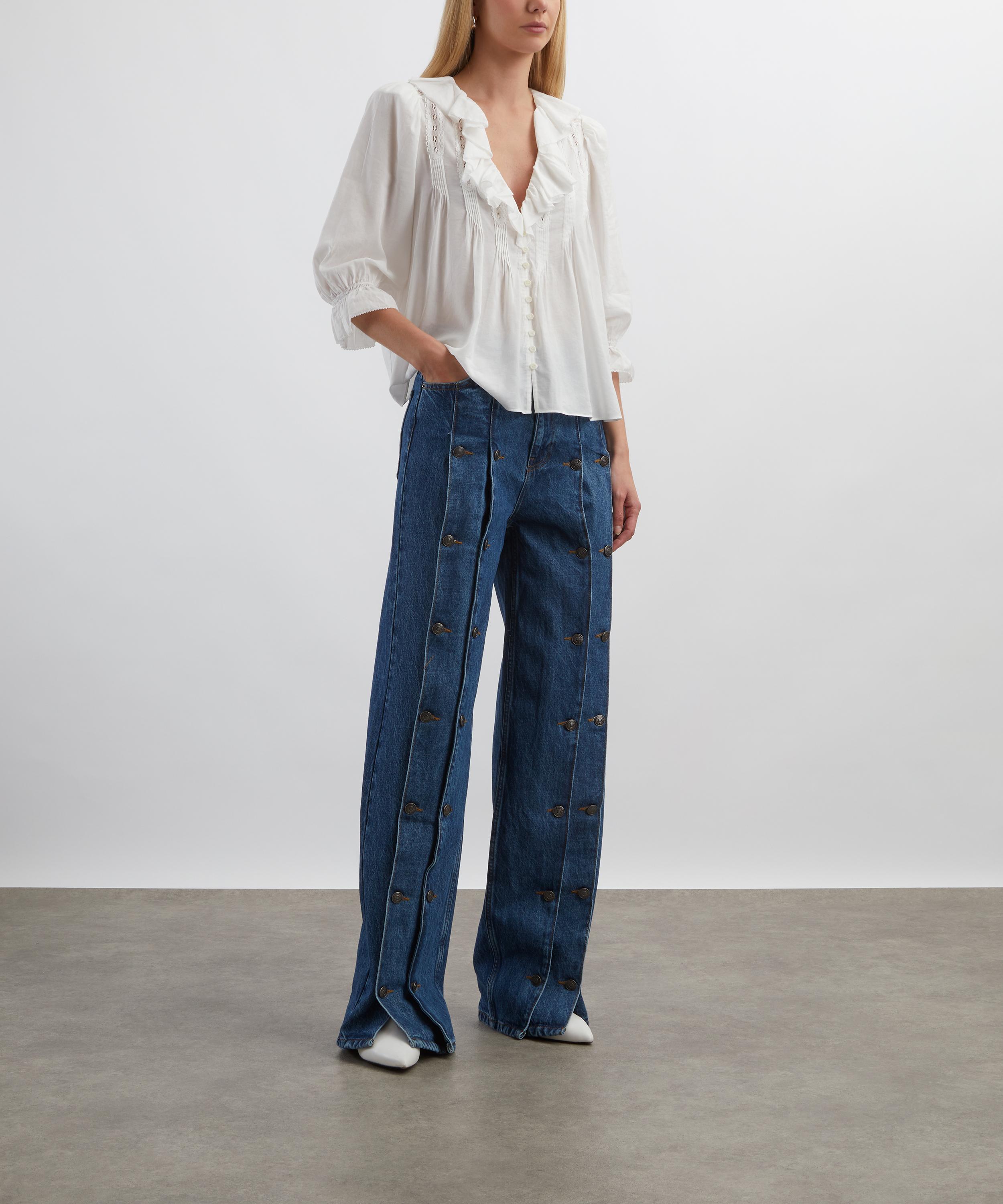 Crafted from lightweight voile, the Perry top exudes effortless elegance. Designed with a relaxed fit and mid-length blouson sleeves, it features a ruffled V-neckline accented by lace trims and a delicate buttoned placket.