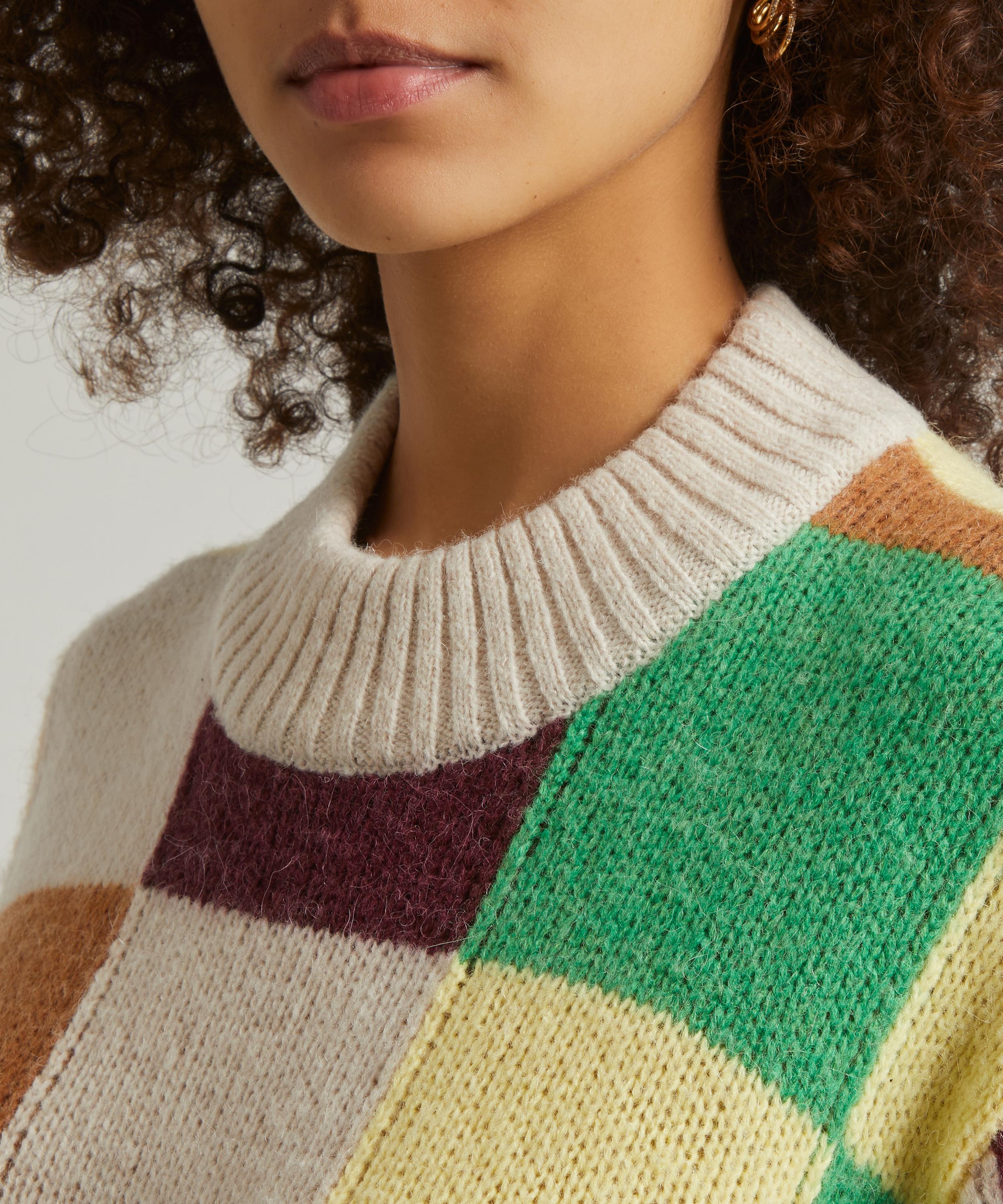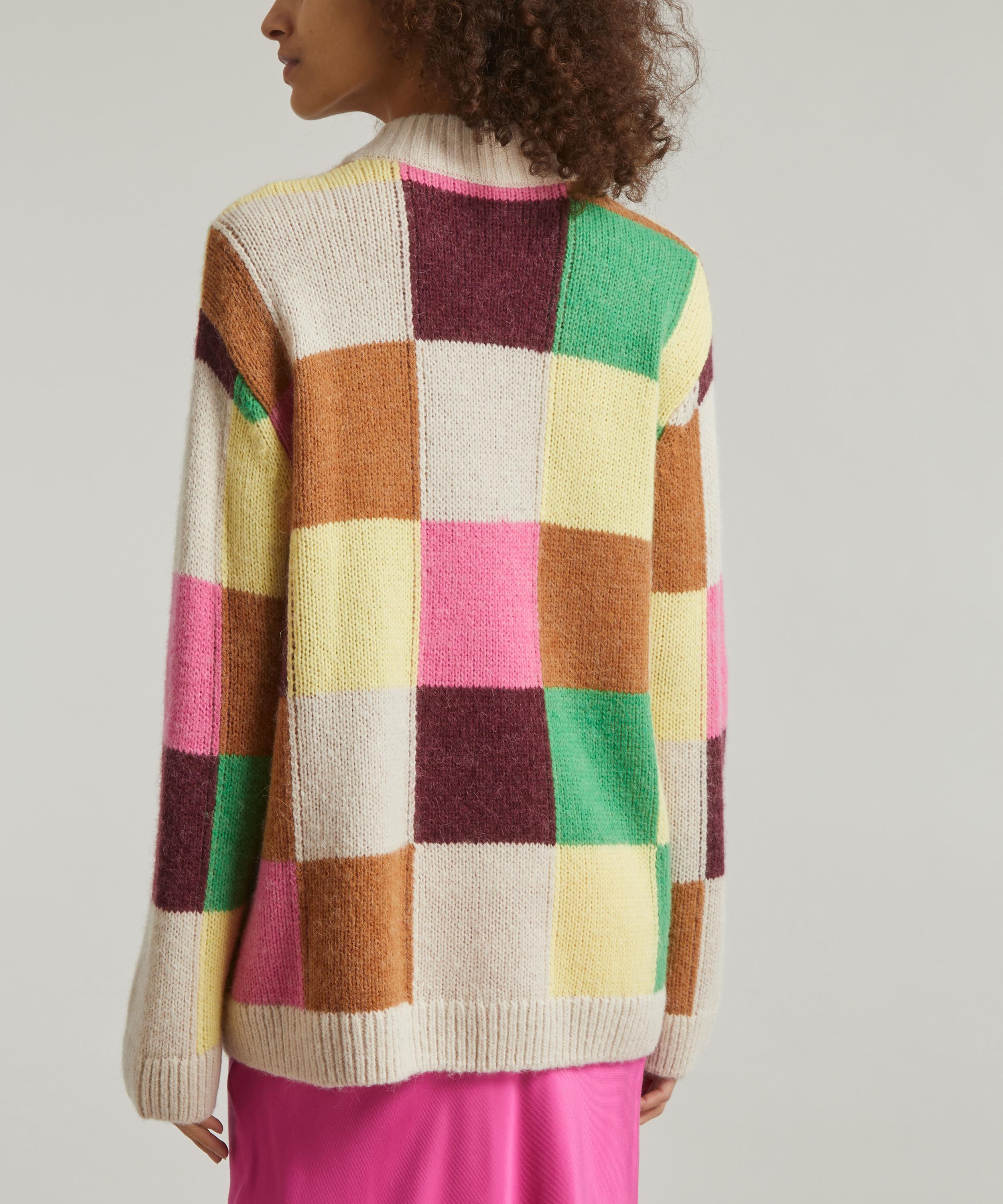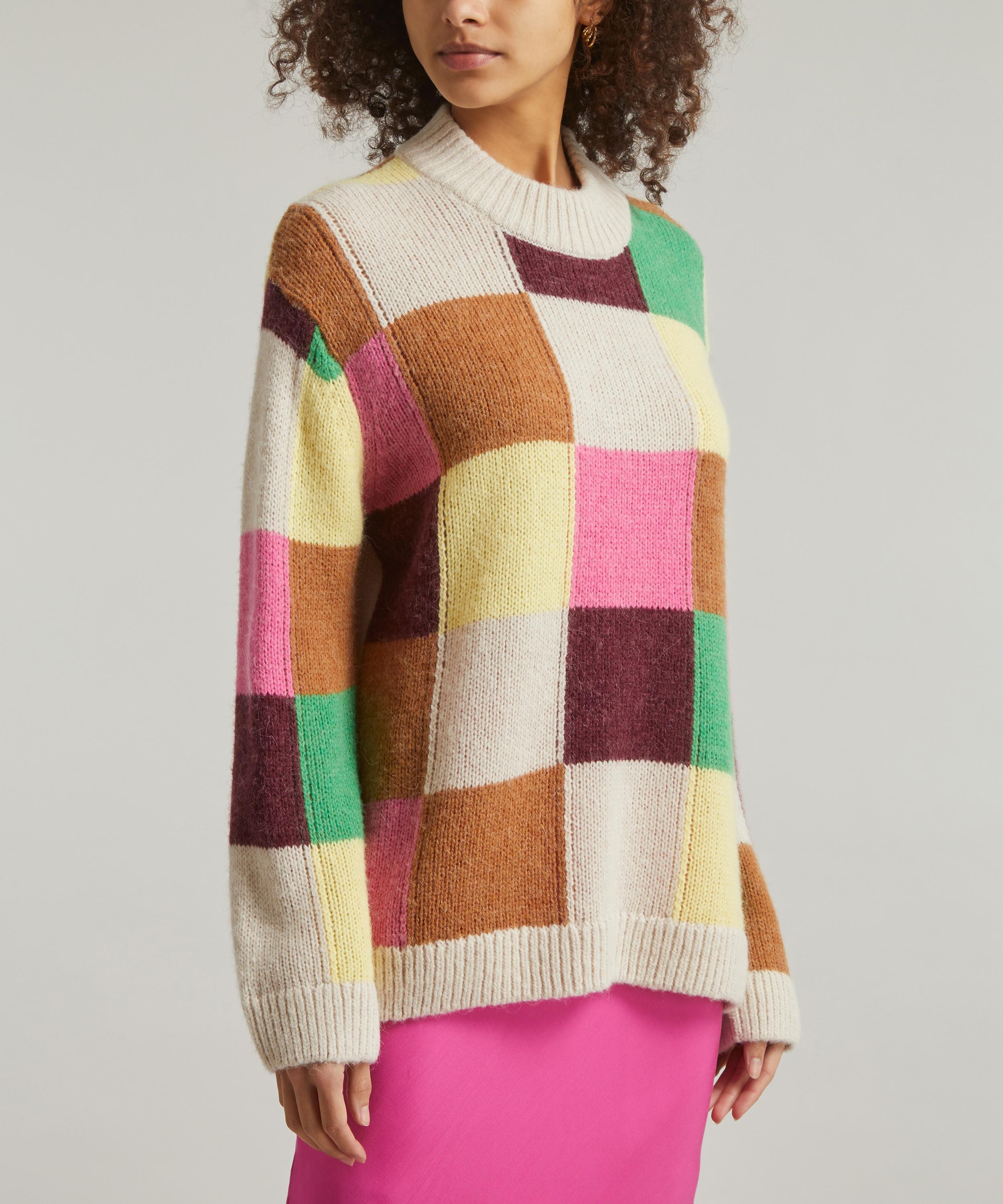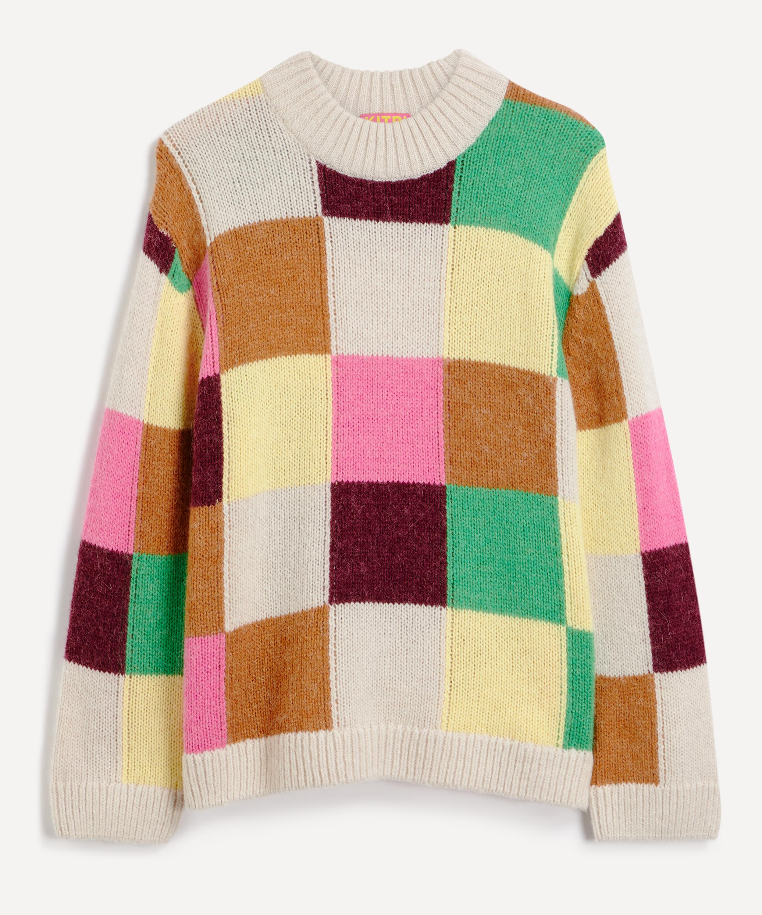 Cosy and colourful, elevate your knitwear edit with the statement Phoebe patchwork jumper from contemporary London label, KITRI. Spun from a super-soft wool and alpaca blend to a relaxed fit with dropped shoulders and long, slouchy sleeves, this crew-neck knit is elevated by its multicoloured patchwork construction.