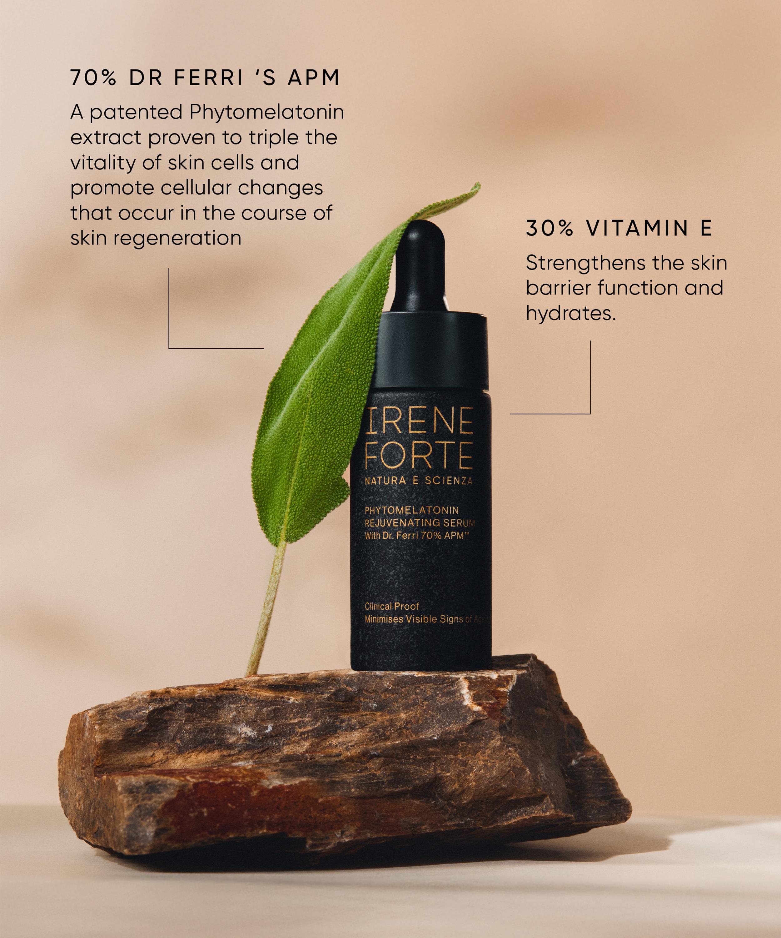 Irene Forte's age-defying Phytomelatonin Rejuvenating Serum with Dr. Ferri’s 70% APM is a transformative addition to daily skin care regimes.