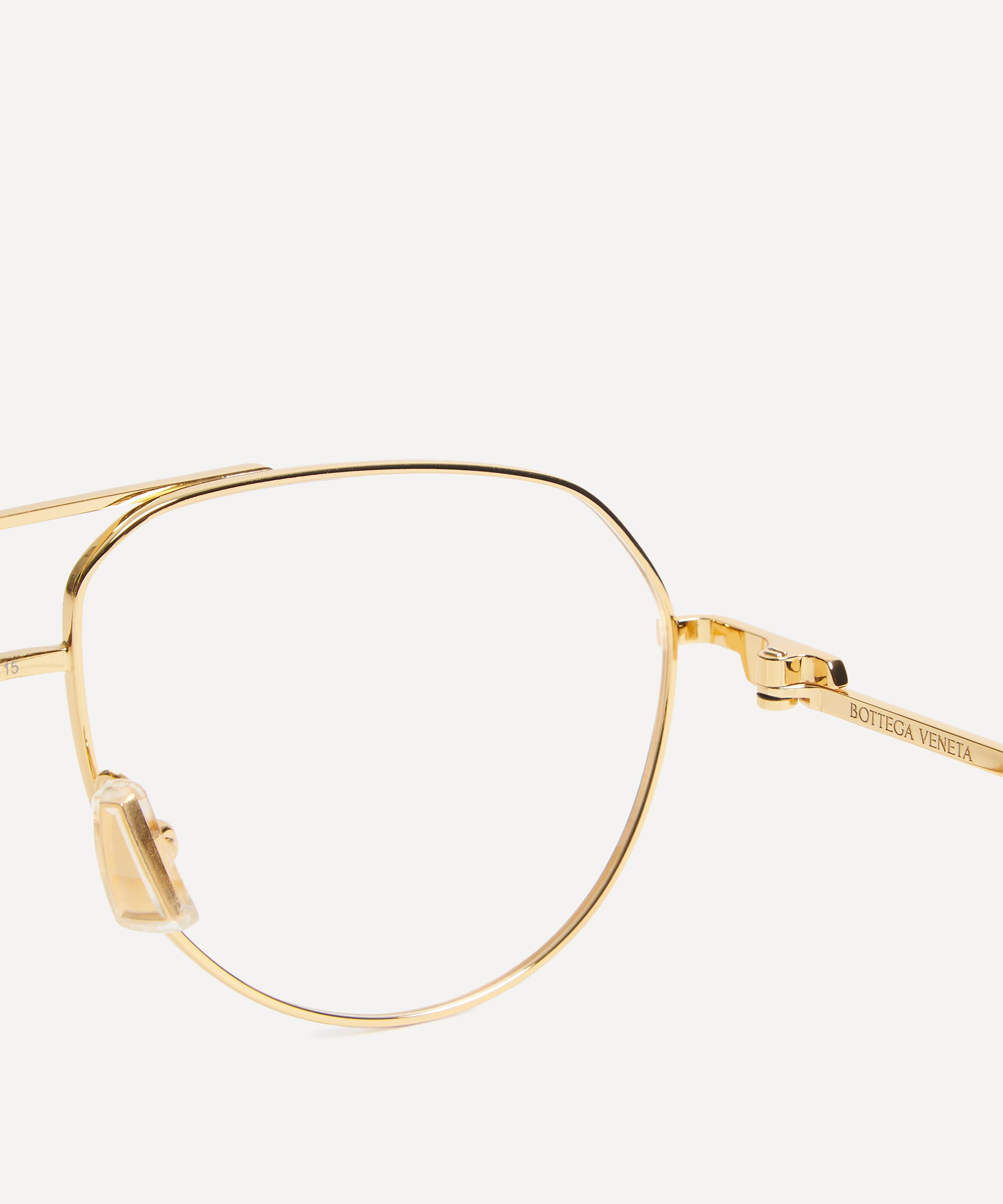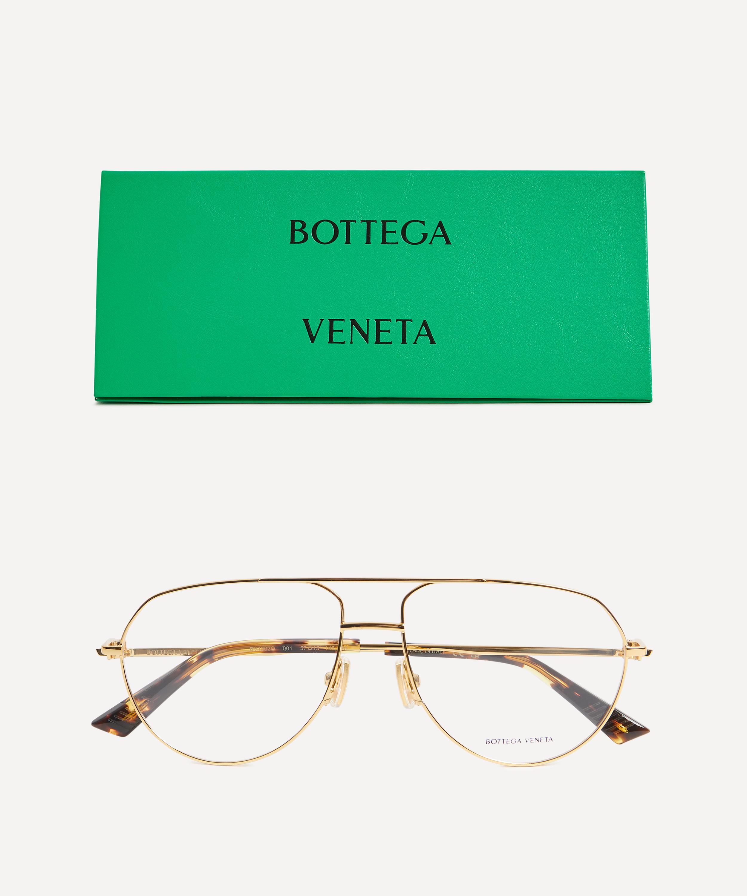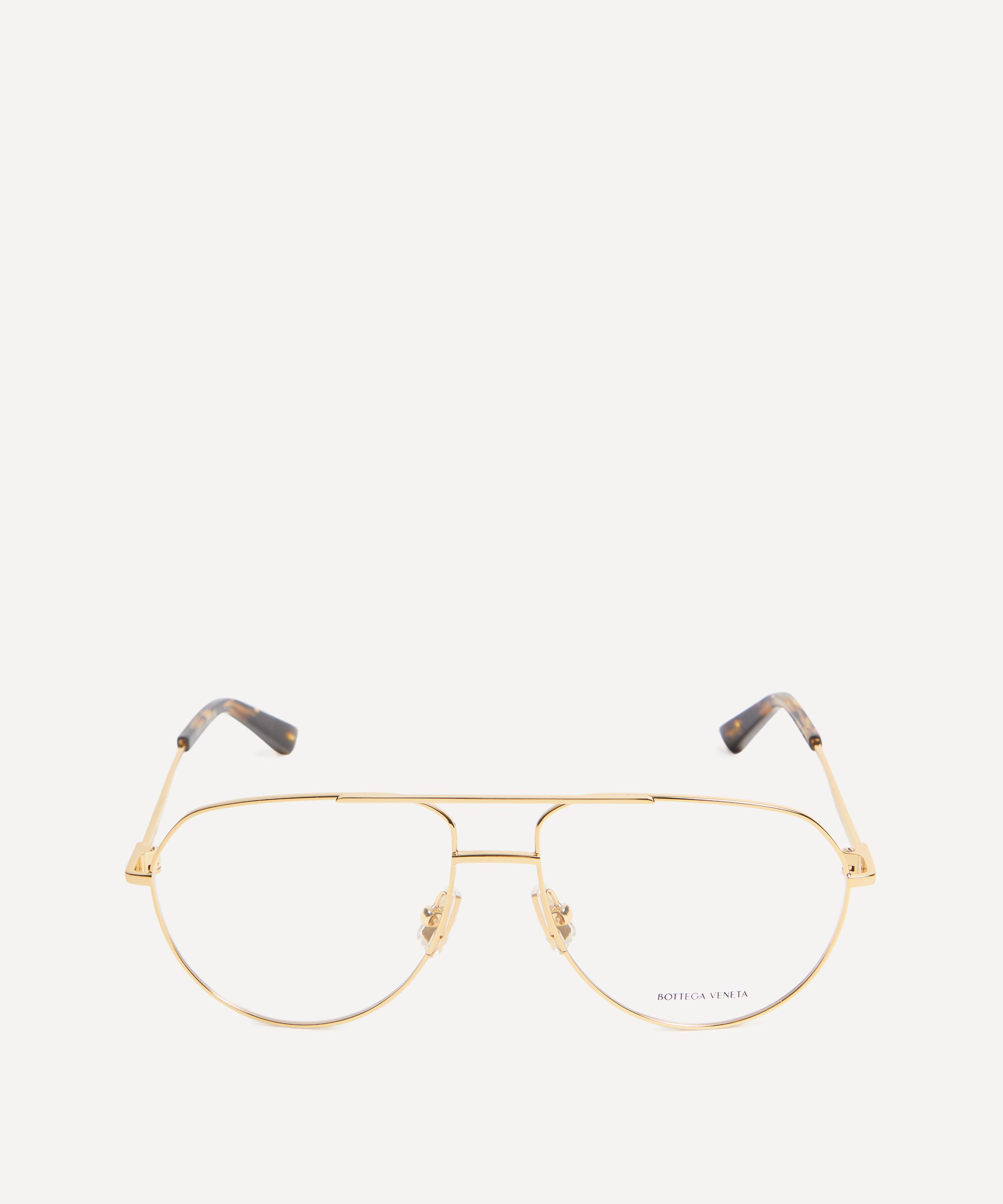 These optical glasses from Bottega Veneta offer a pilot-inspired silhouette that's perfect for everyday wear. Crafted from gold-tone metal, these glasses are instantly elevated by Havana acetate temple tips. Complete with clear prescription-ready lenses, the sleek design is set to style seamlessly with any outfit, lending an effortlessly chic finish to both traditional workwear and casual denim.