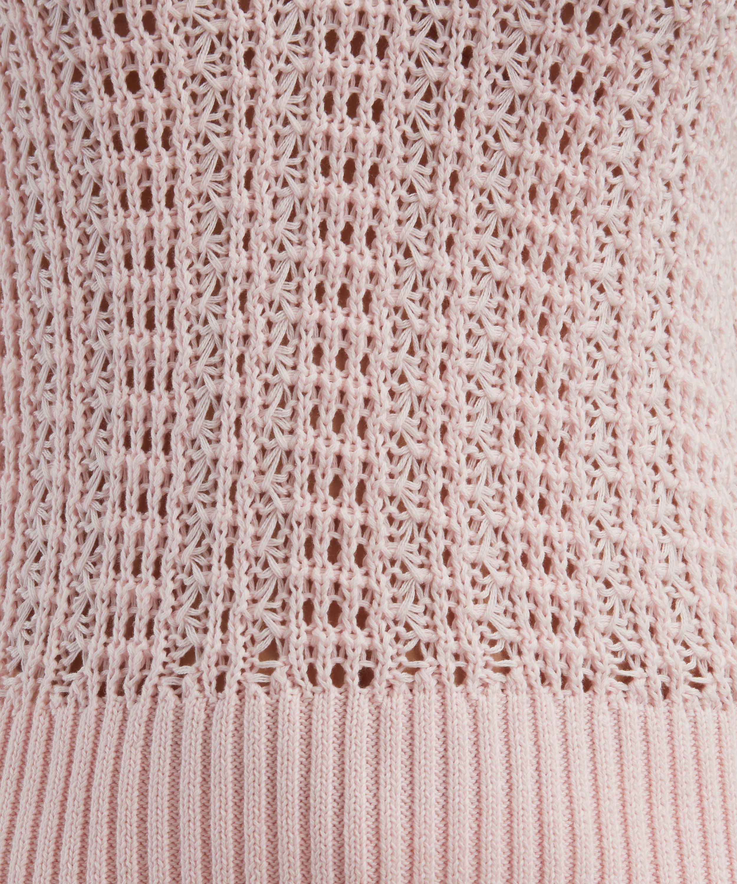 Knitted from lightweight cotton yarn, this pink V-neck vest features ribbed trims, and an intricate ladder-stitch construction for a delicate, airy finish.