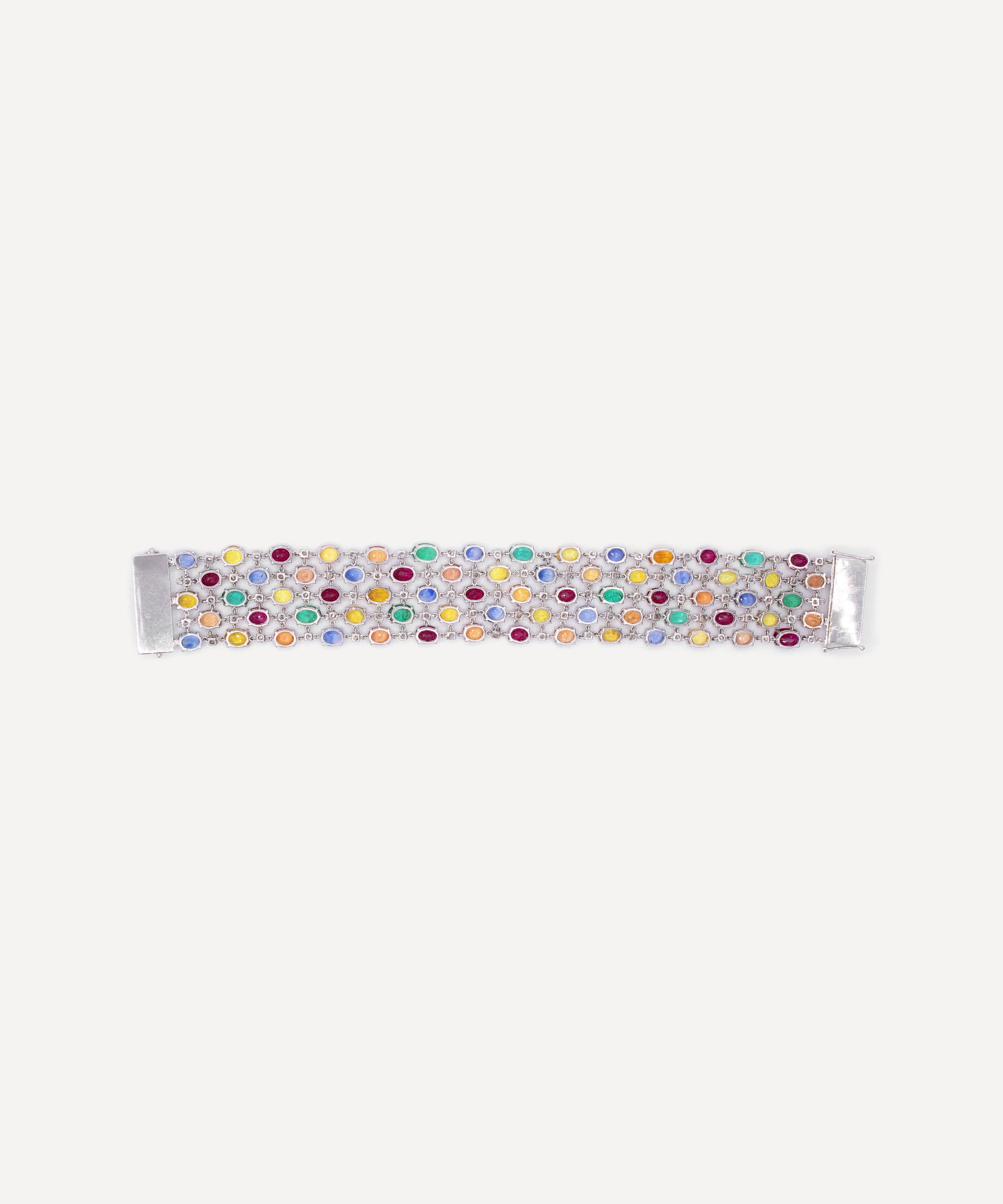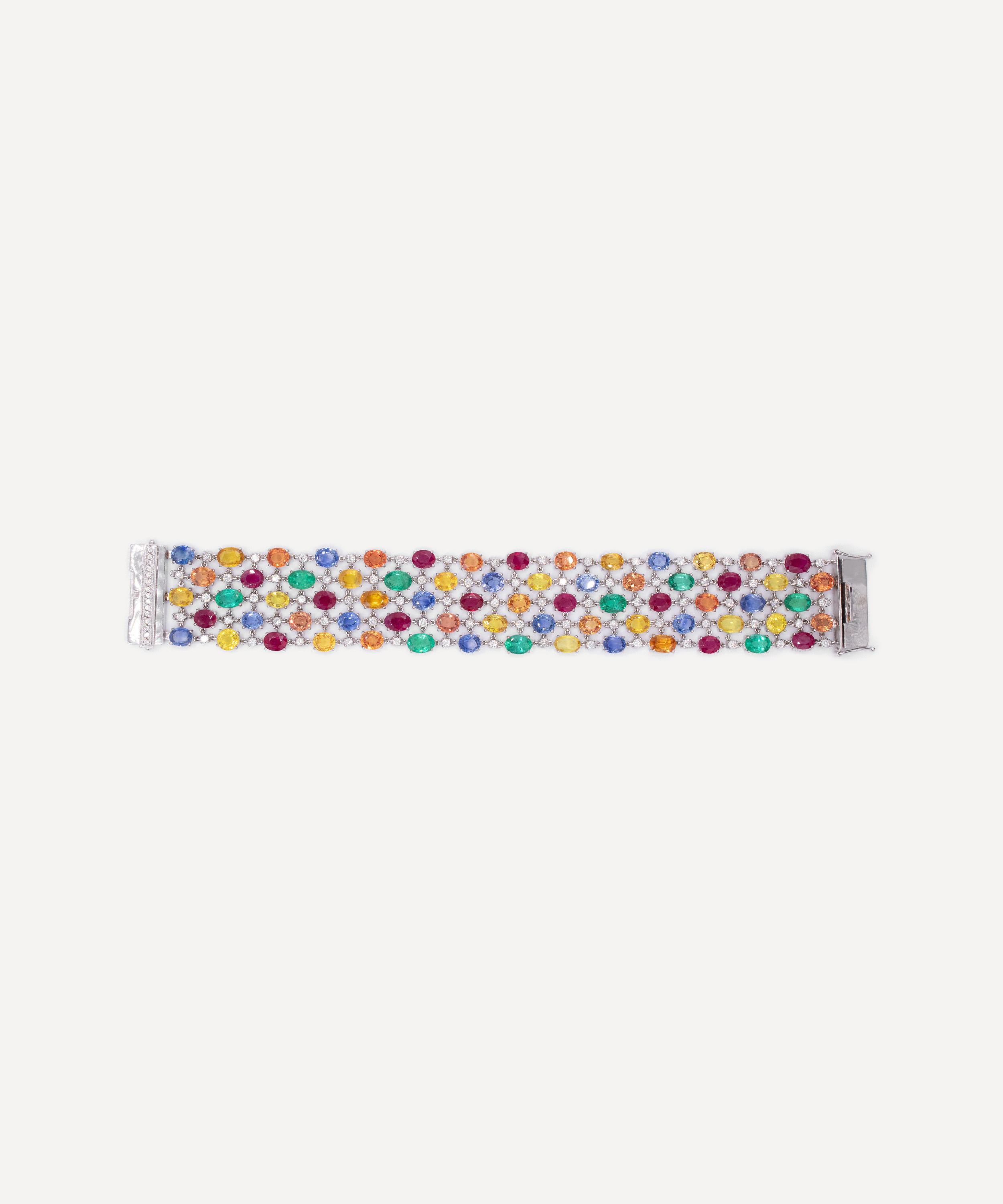 Crafted from platinum, it features mixed cut rubies, sapphires, and emeralds, alternating with round brilliant cut diamonds. It’s articulated setting creates a flexible mesh effect, finished with a long push clasp, grain set with additional diamonds. Whether worn as a statement of refinement or a whisper of vintage charm, it will steal the spotlight and elevate every ensemble with its undeniable presence.